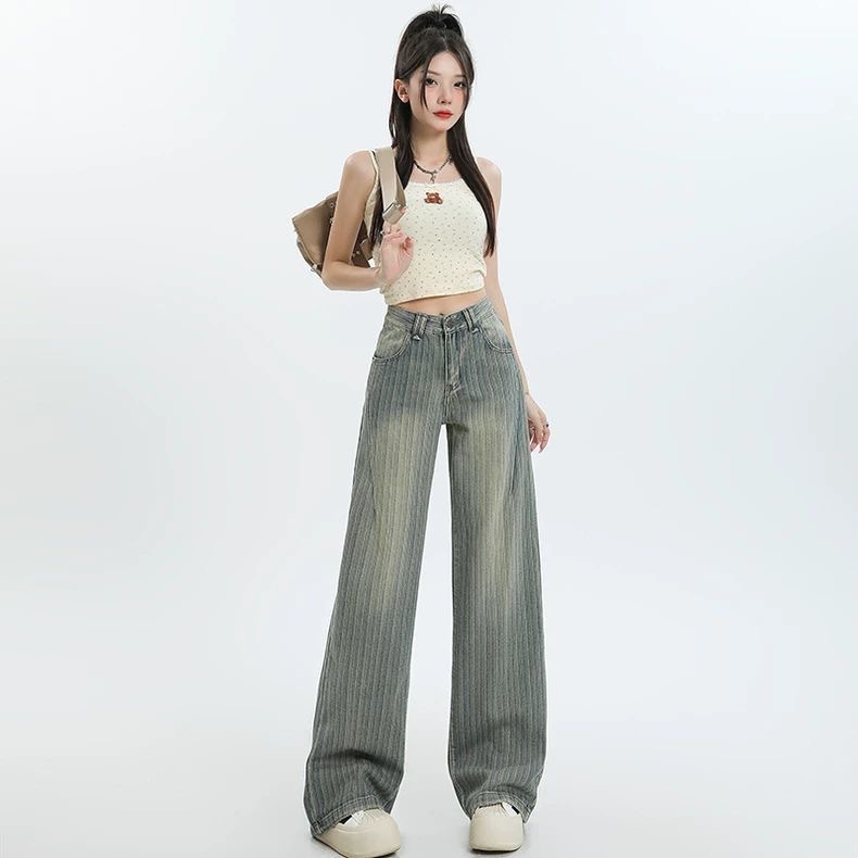 빈티지 와이드 레그 청바지 여성의 2024 봄과 가을 새로운 미국 스타일 하이 스트리트 하이 웨이스트 스트라이프 루즈 캐주얼 스트레이트 팬츠스토어 가기