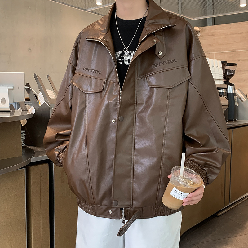 자수 스탠드 칼라 pu 가죽 재킷 남성 가을 유행 느슨한 디자인 감각 코트 미국 빈티지 오토바이 의류 가죽 재킷