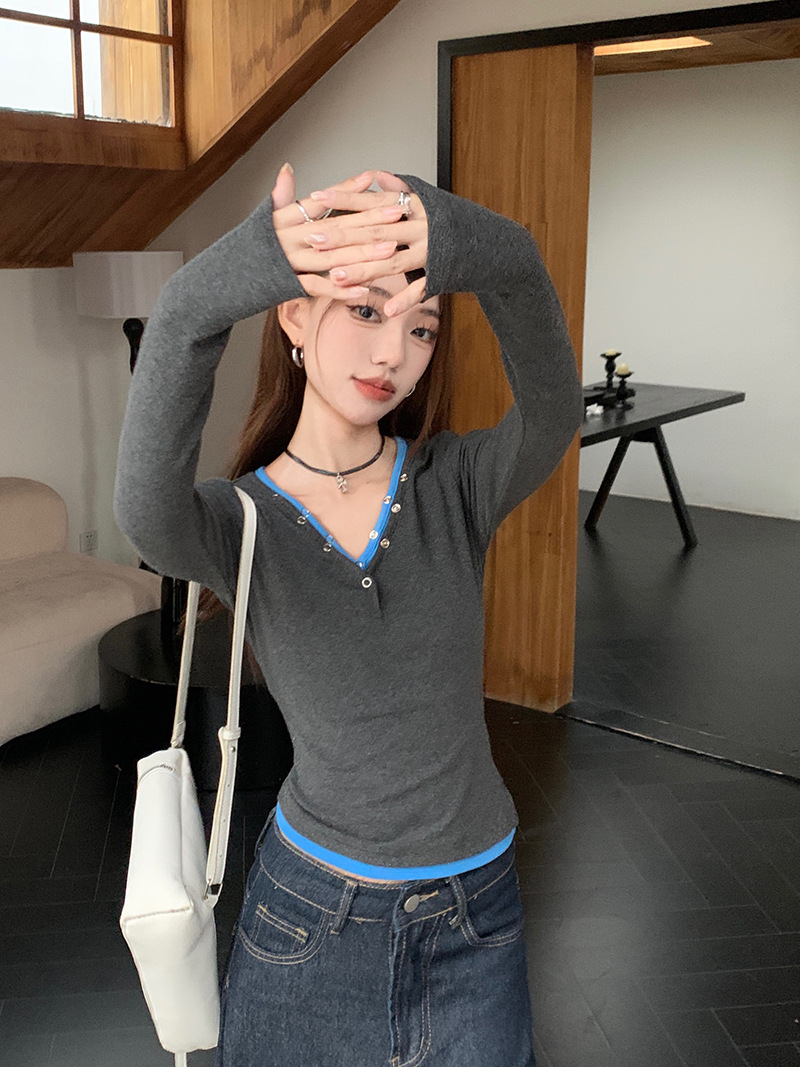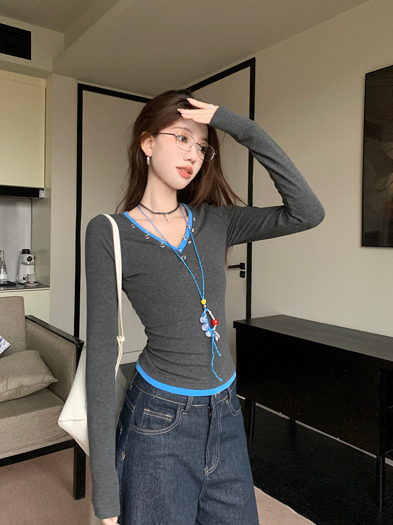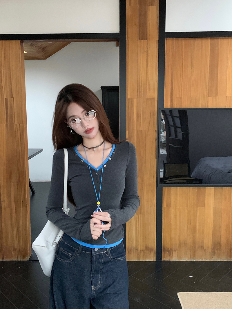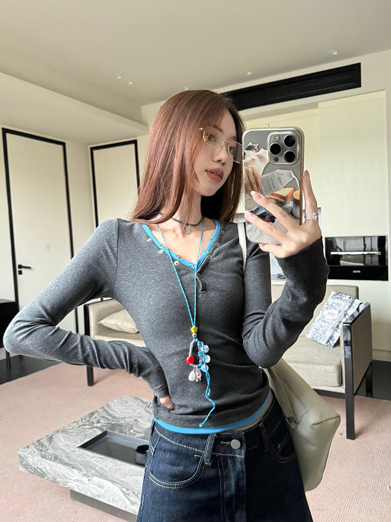 한국식 그레이 페이크 투피스 V 넥 티셔츠 여성 초가을 세련된 달콤한 스파이스 소녀 디자인 센스 슬림핏 베이스 셔츠 쇼트 탑
