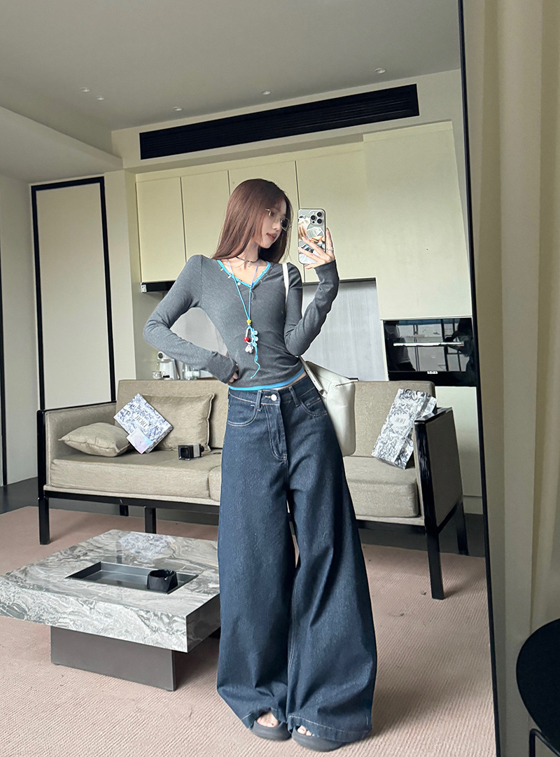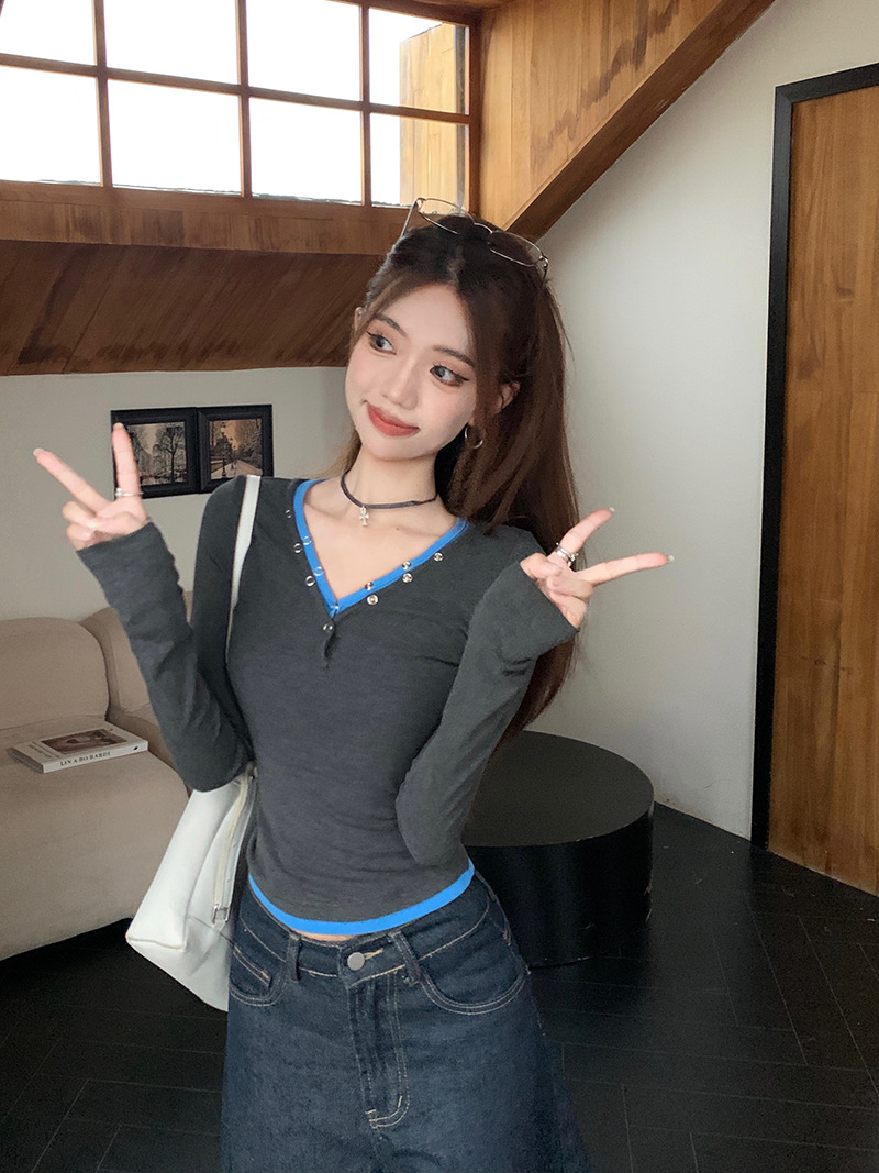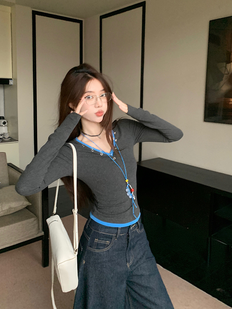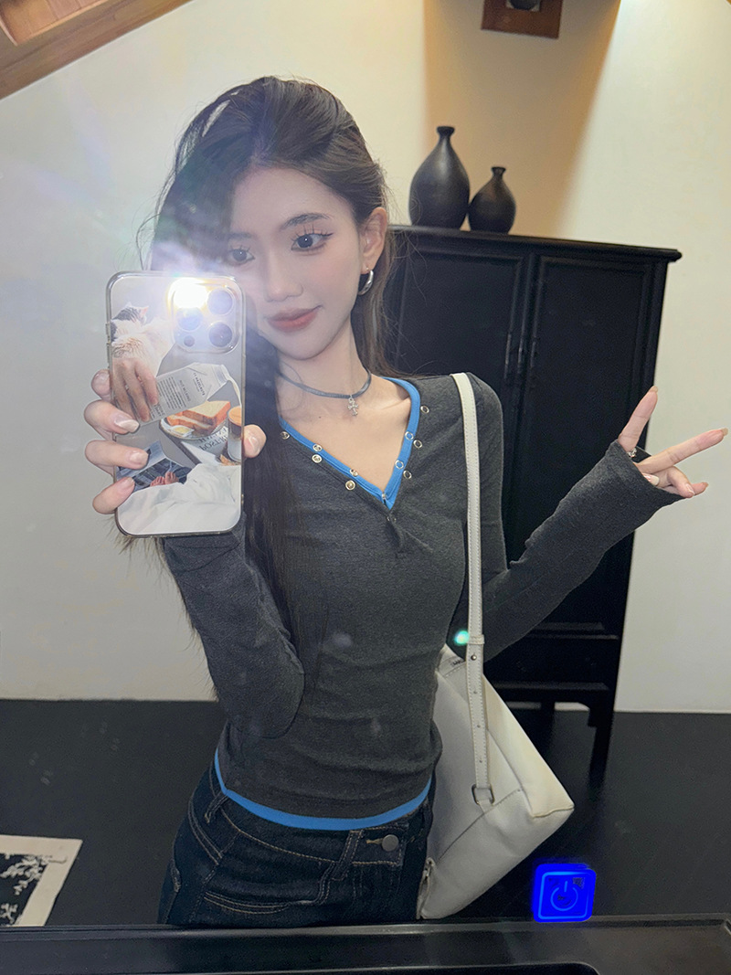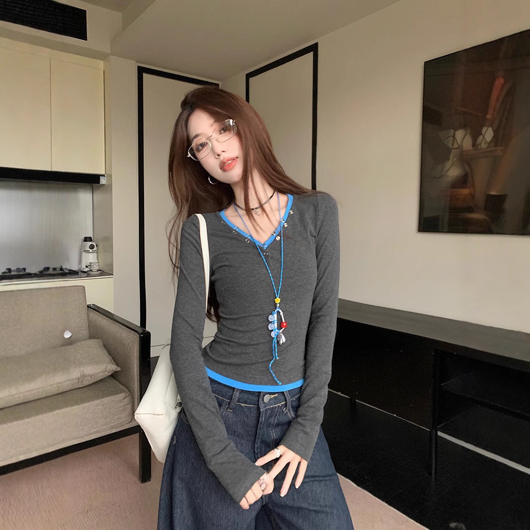 한국식 그레이 페이크 투피스 V 넥 티셔츠 여성 초가을 세련된 달콤한 스파이스 소녀 디자인 센스 슬림핏 베이스 셔츠 쇼트 탑