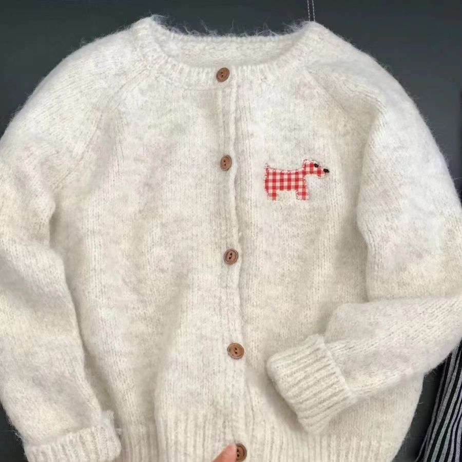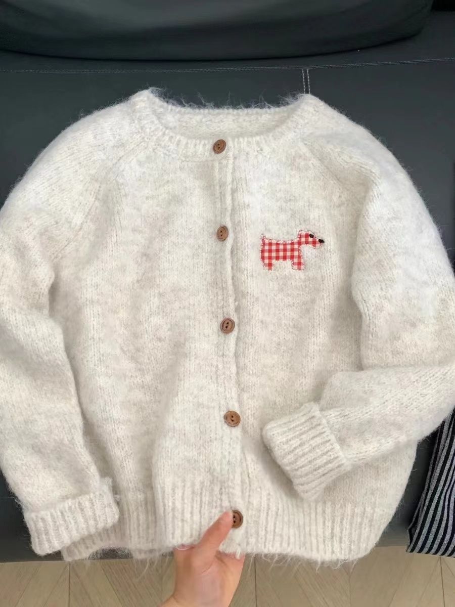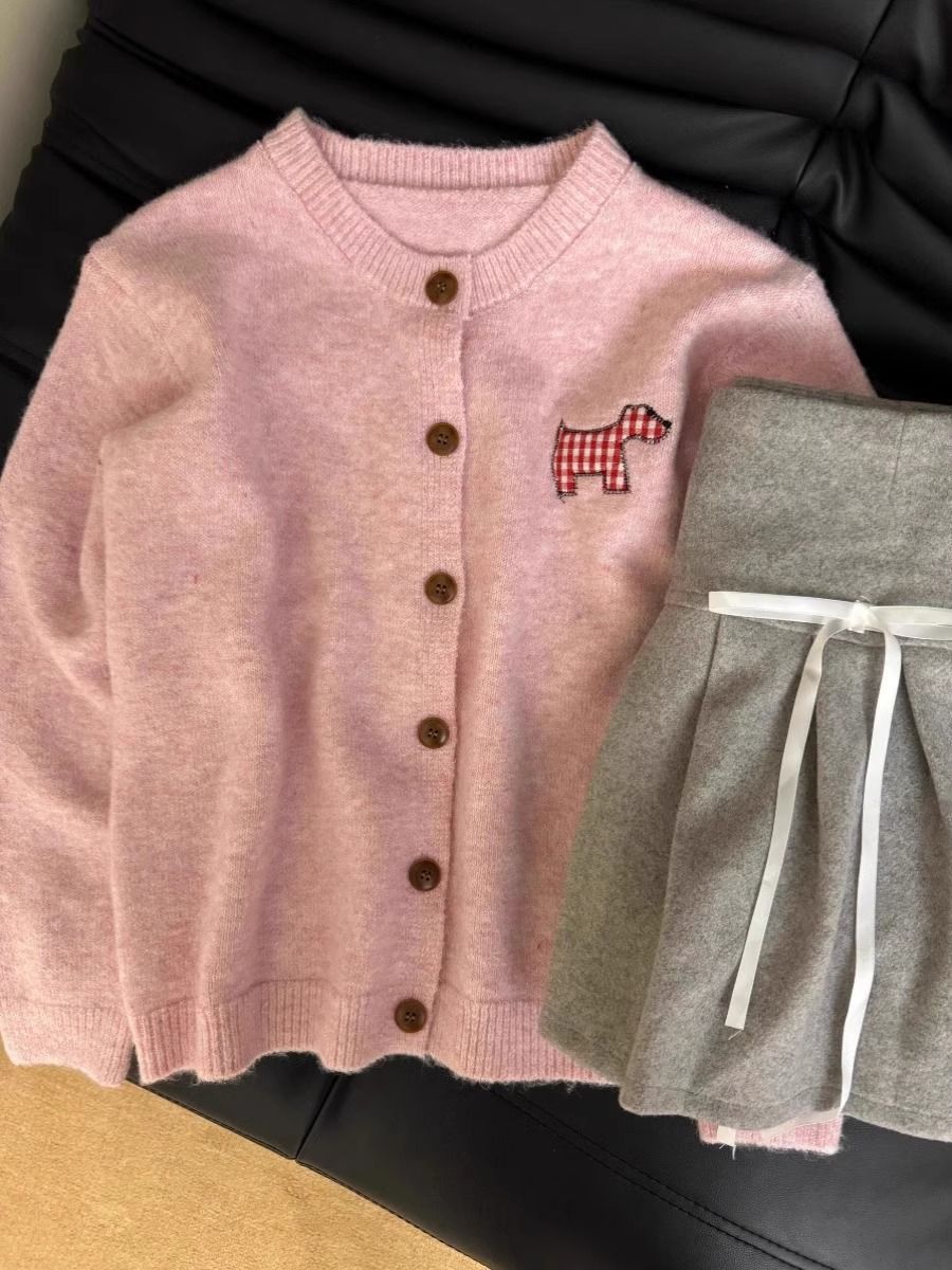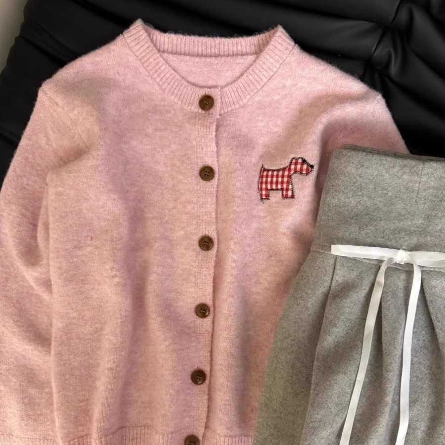 강아지 스티커 캔디 컬러 달콤한 니트 카디건 스웨터 여성의 2024 가을 새로운 올 매치 코트 쇼트 탑스토어 가기