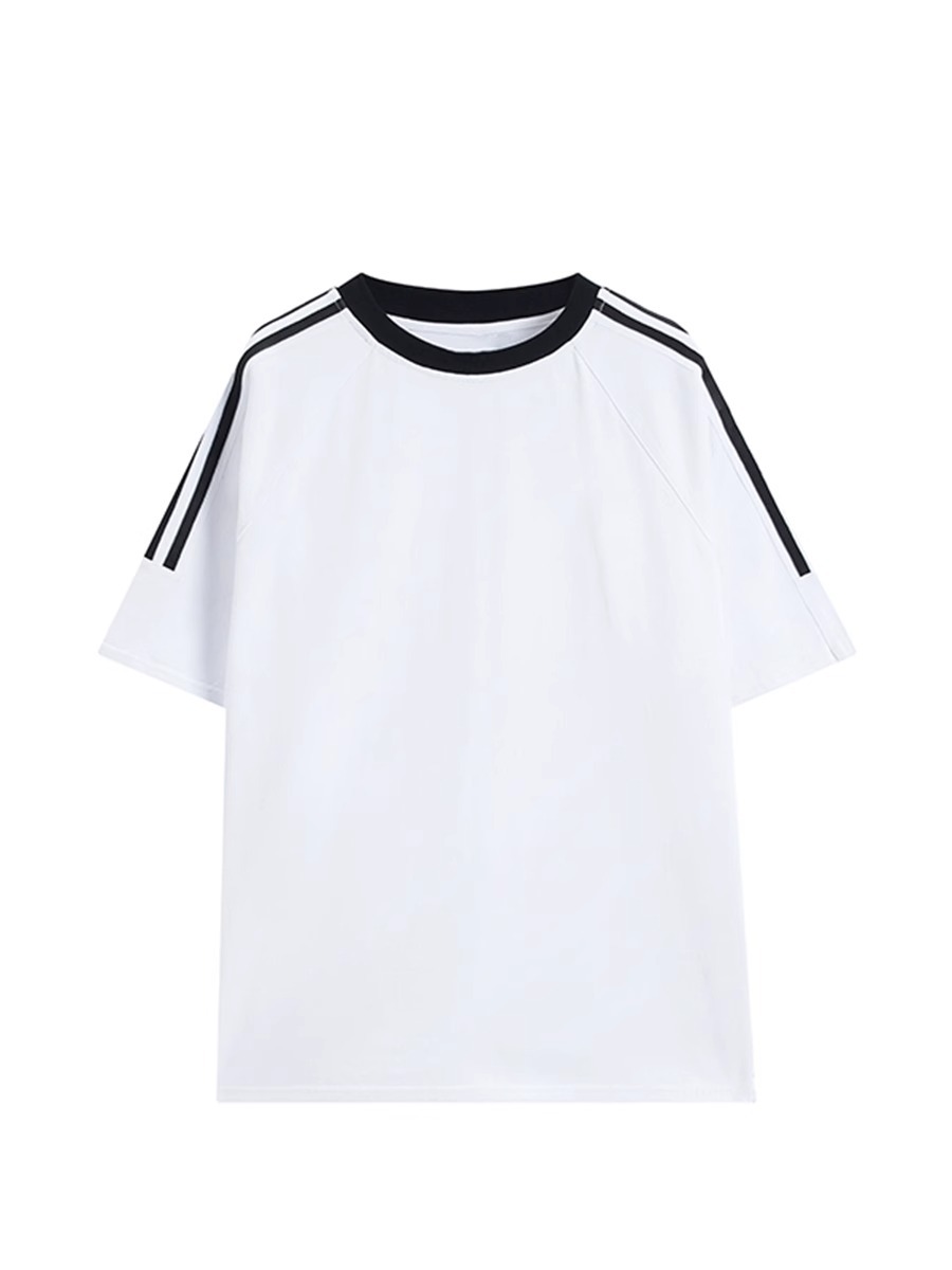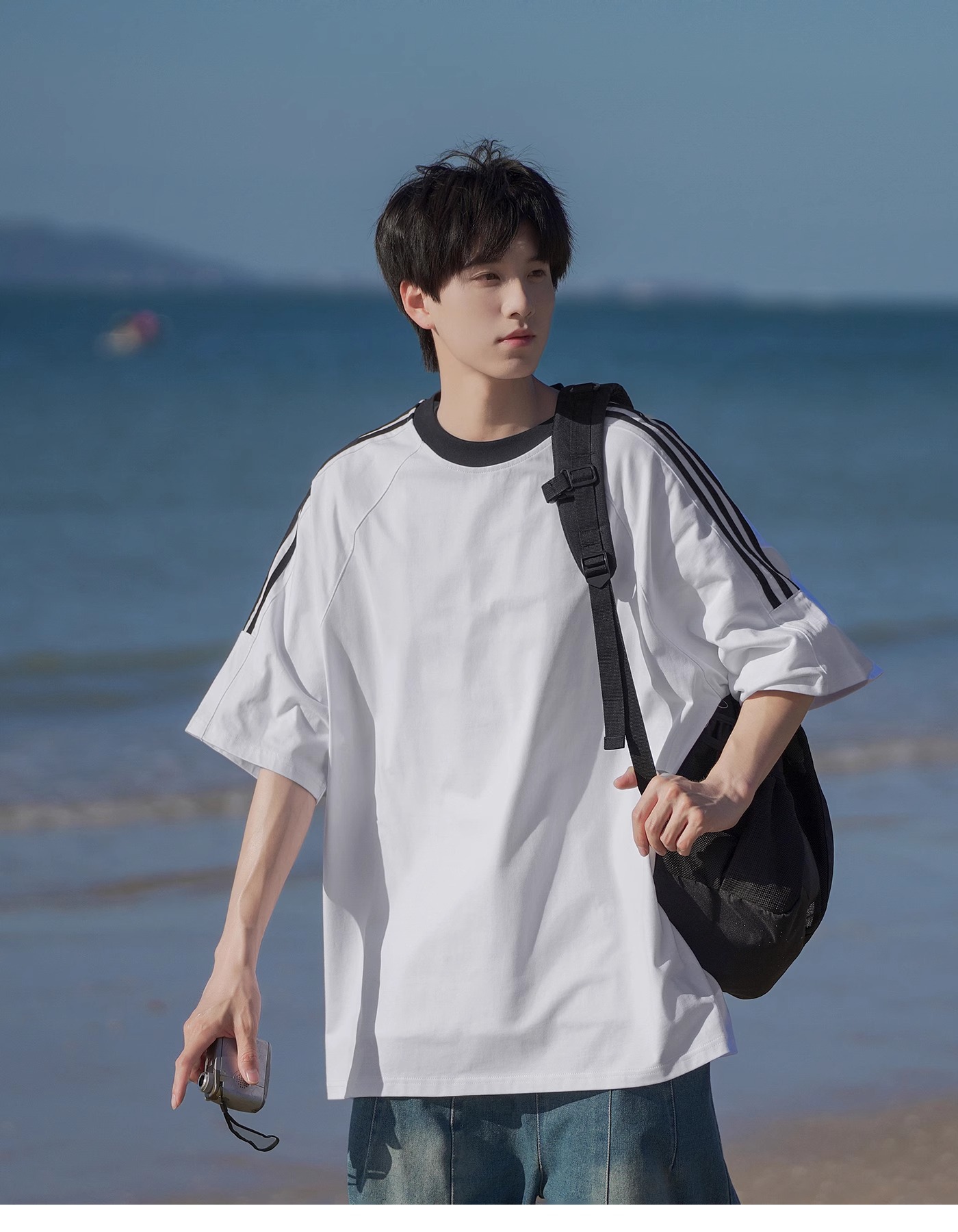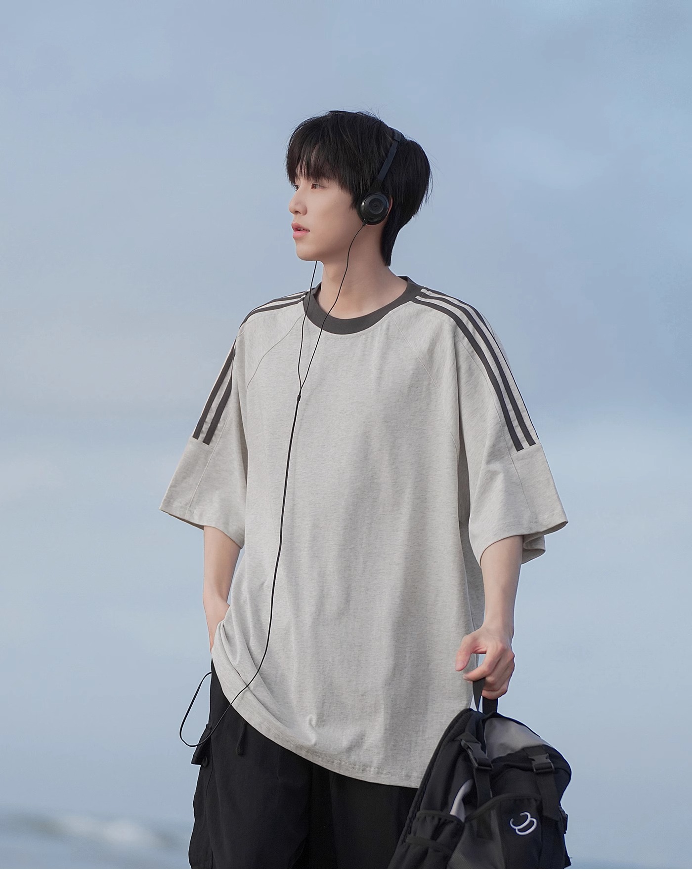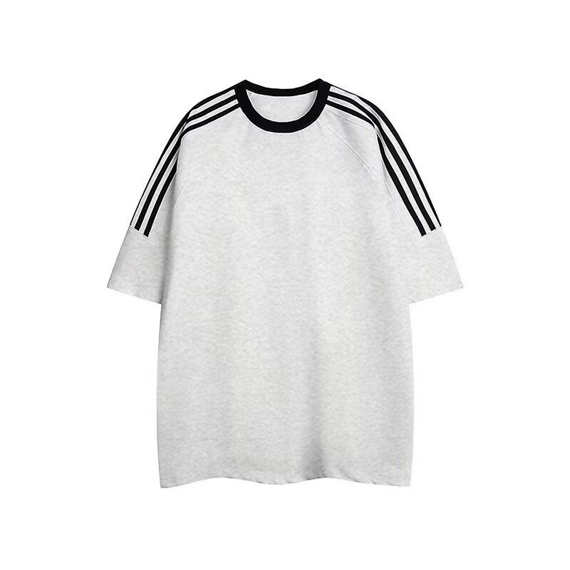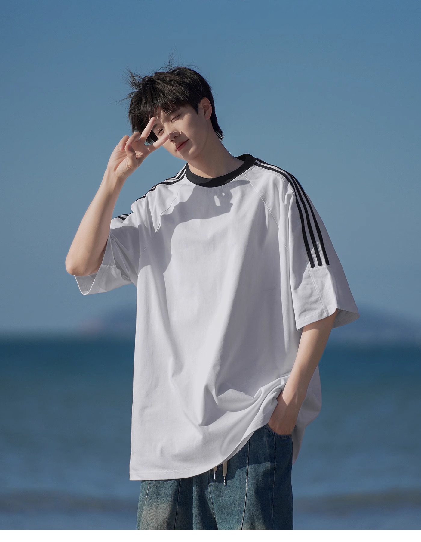 유럽과 미국 스타일의 면 트렌디한 복고풍 세 줄무늬 래글런 슬리브 티셔츠 남성과 여성을 위한 여름 반팔 저지 루즈 커플 스타일