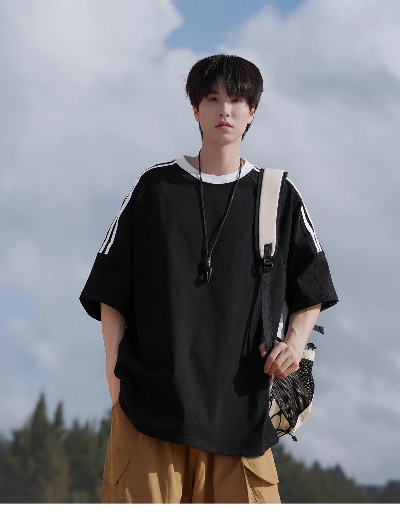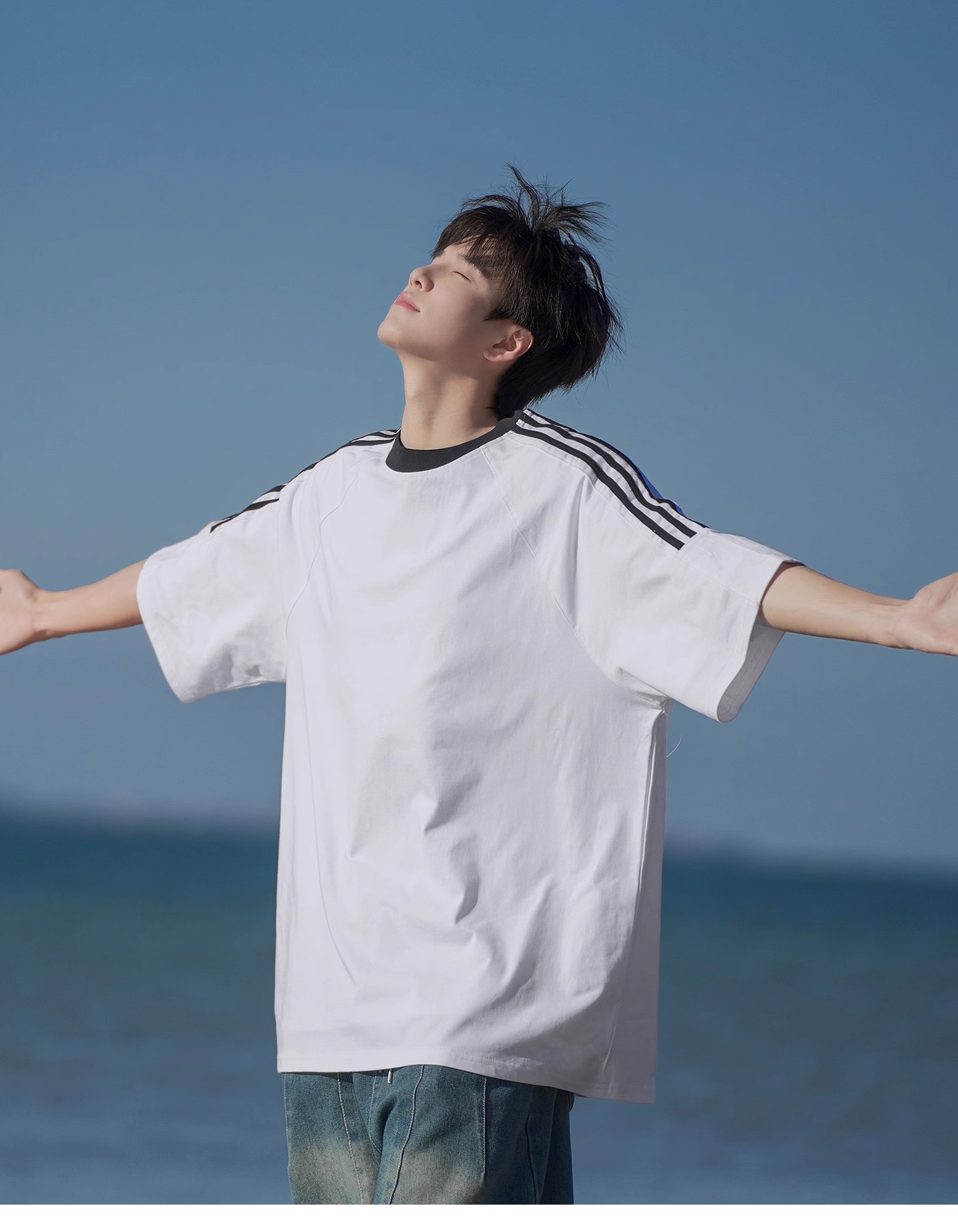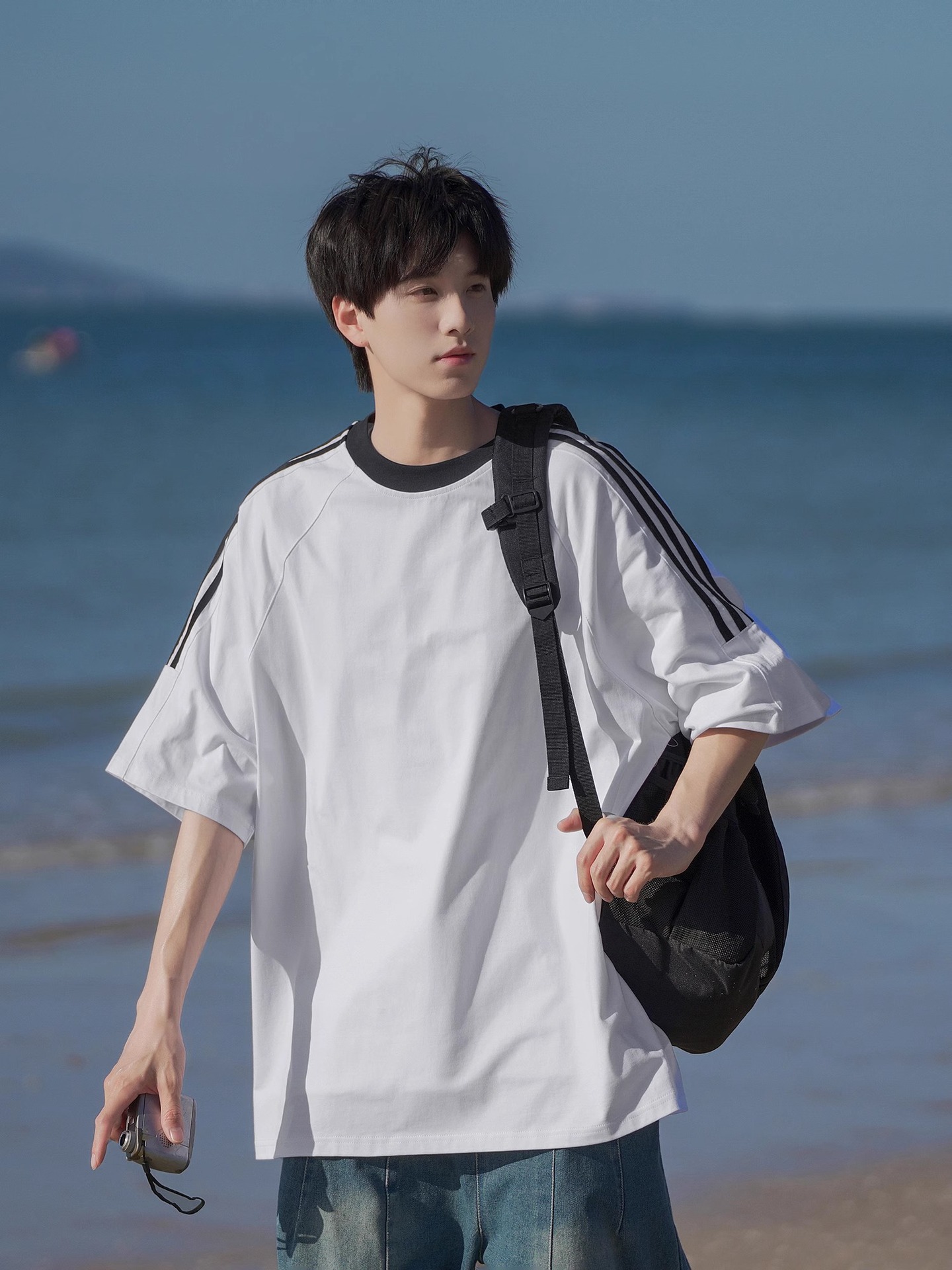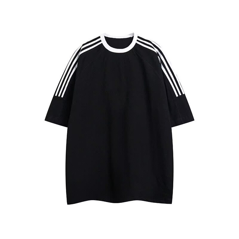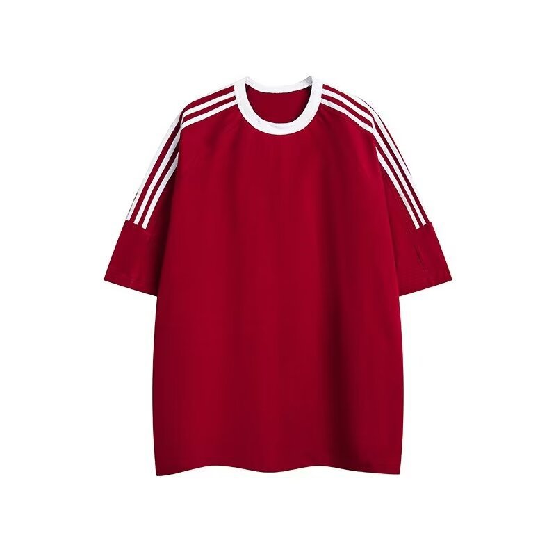 유럽과 미국 스타일의 면 트렌디한 복고풍 세 줄무늬 래글런 슬리브 티셔츠 남성과 여성을 위한 여름 반팔 저지 루즈 커플 스타일