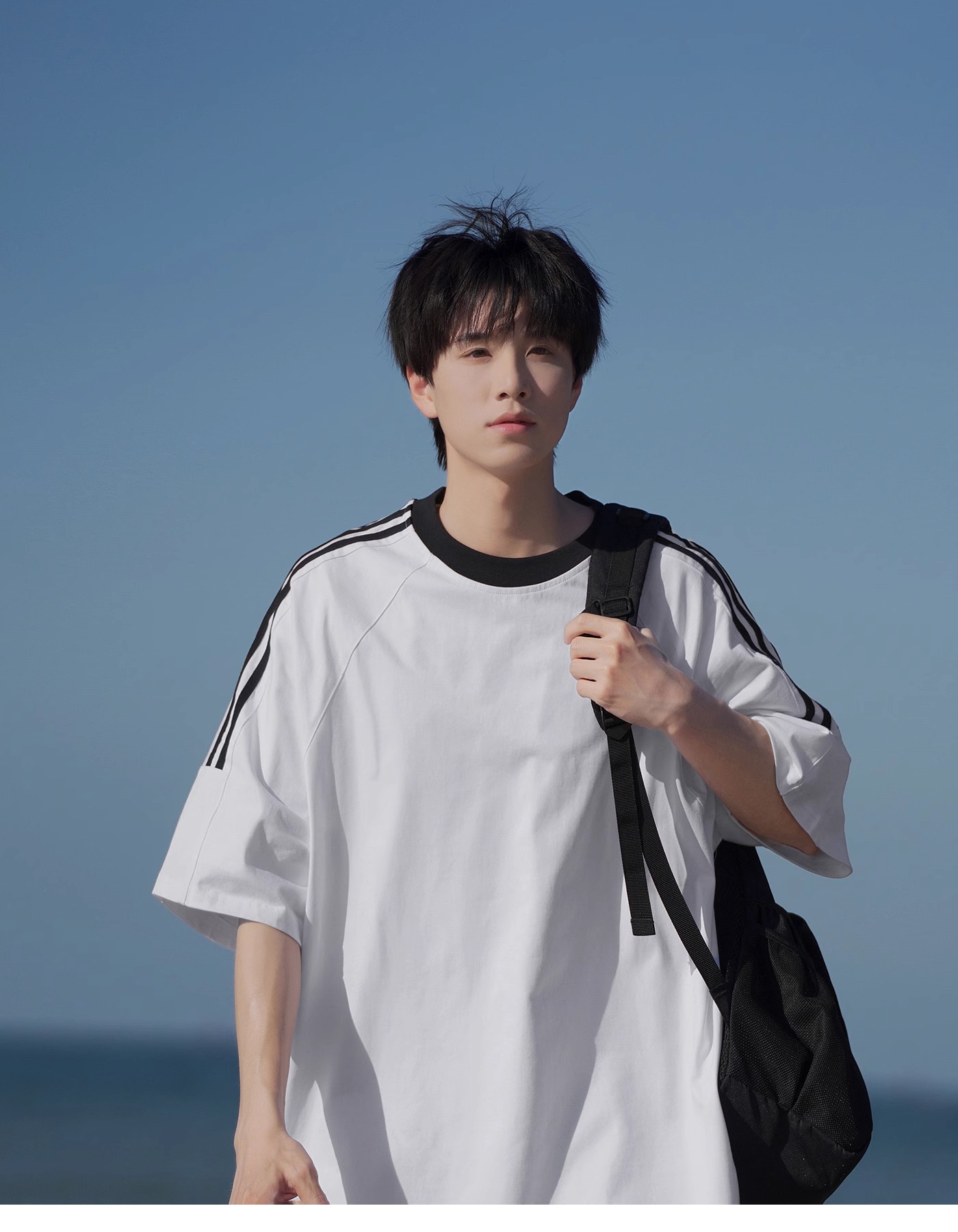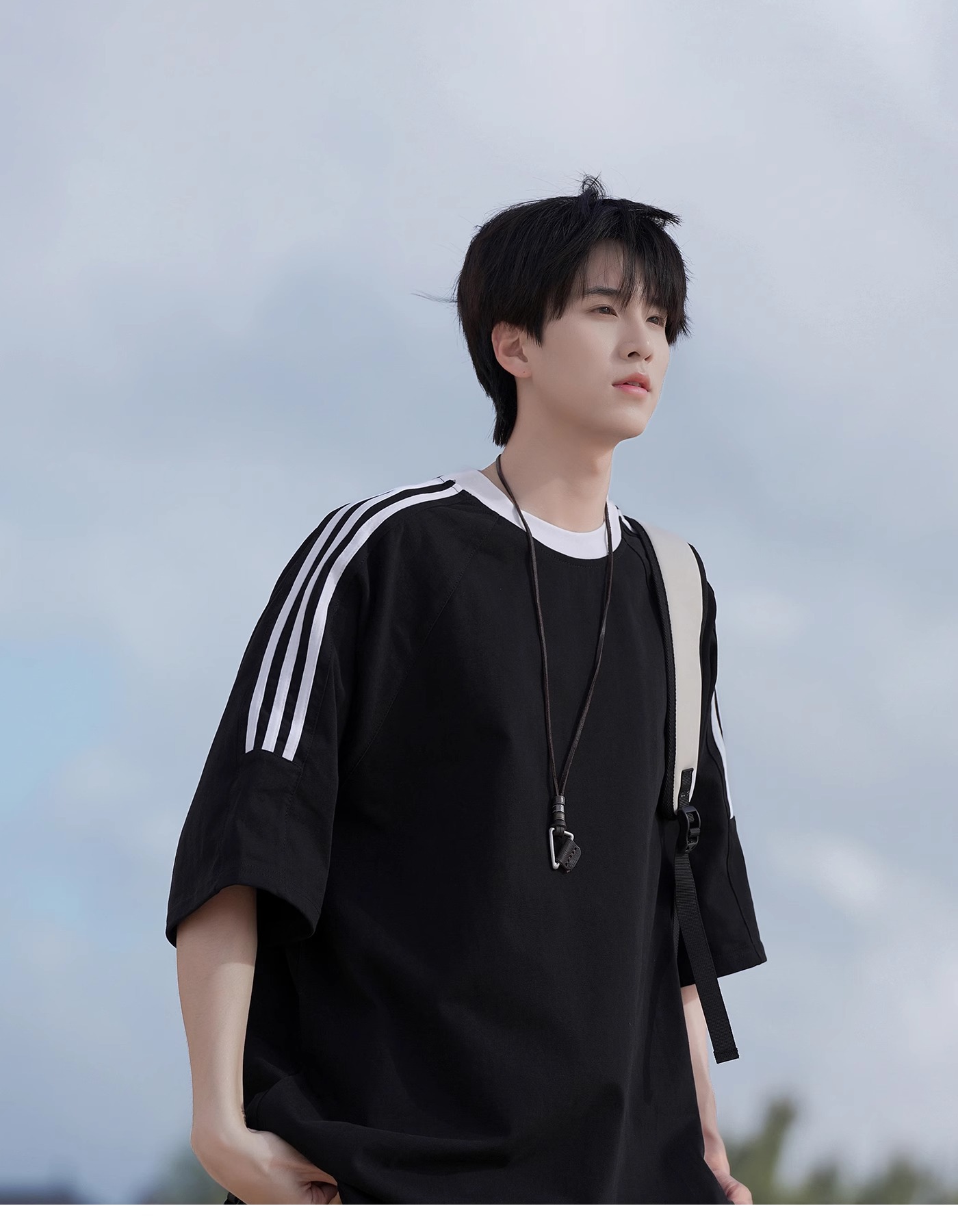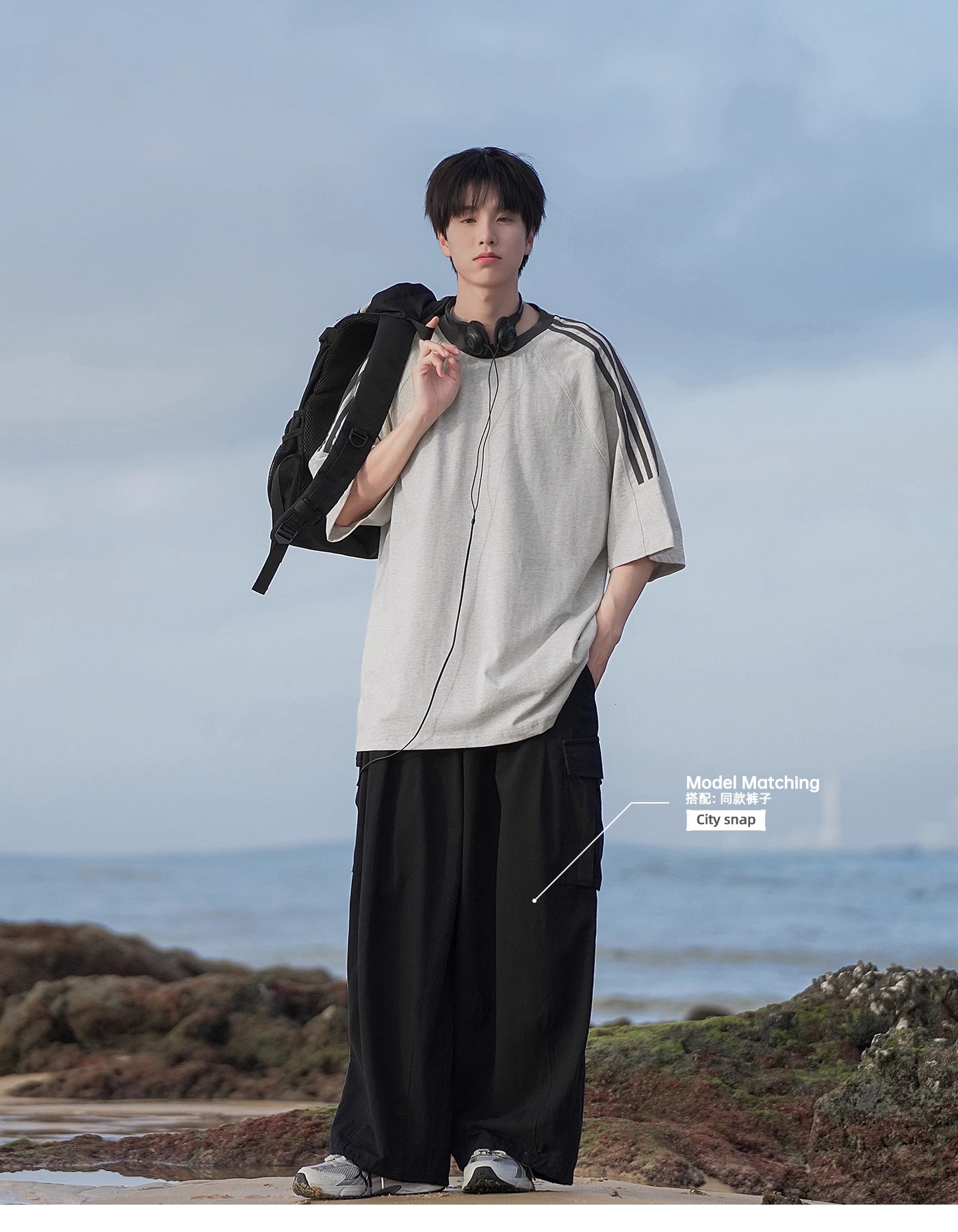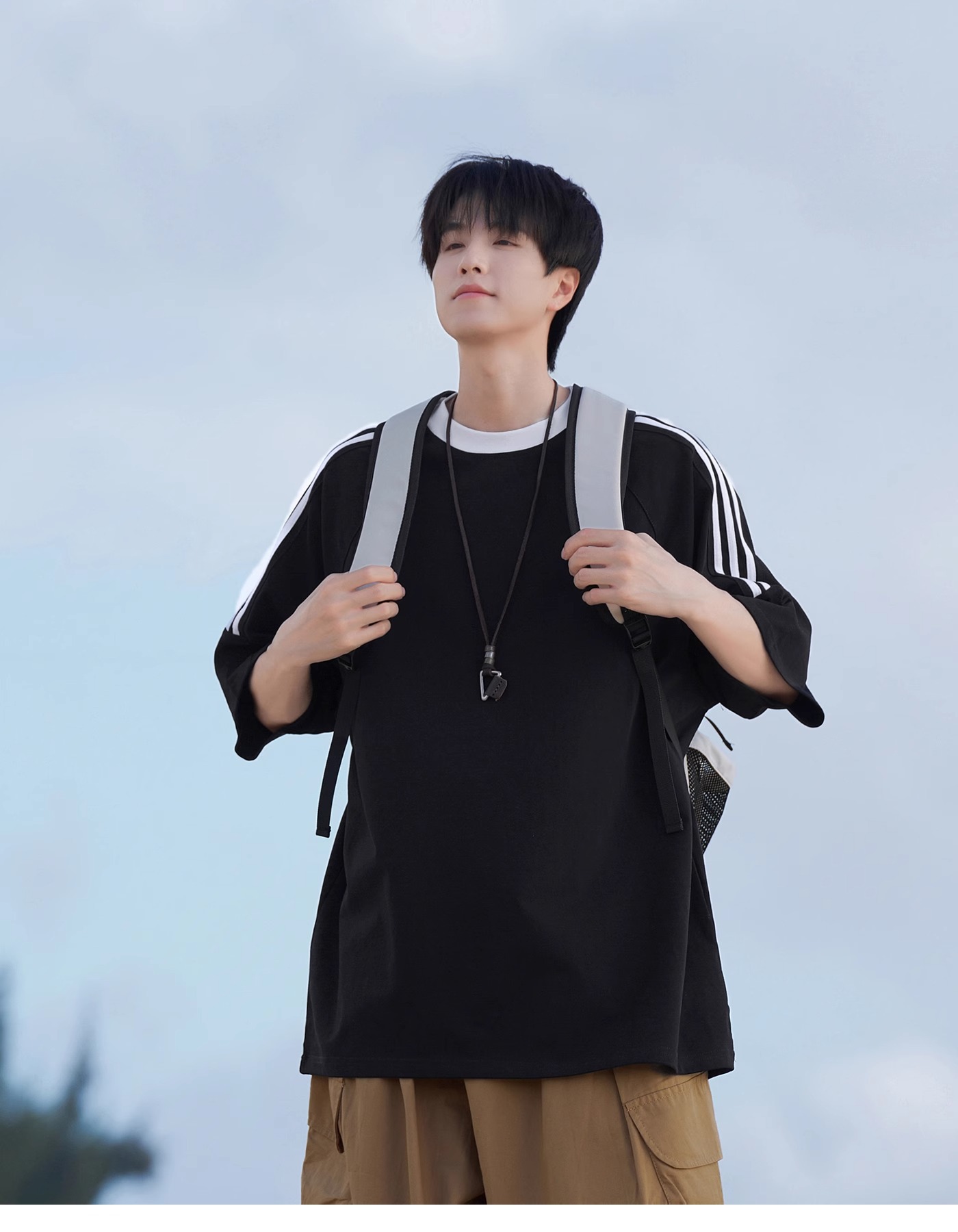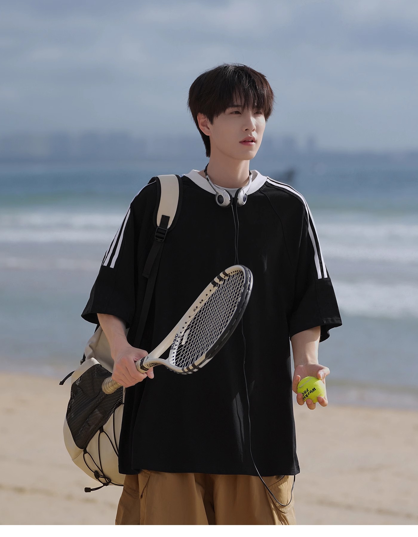 유럽과 미국 스타일의 면 트렌디한 복고풍 세 줄무늬 래글런 슬리브 티셔츠 남성과 여성을 위한 여름 반팔 저지 루즈 커플 스타일