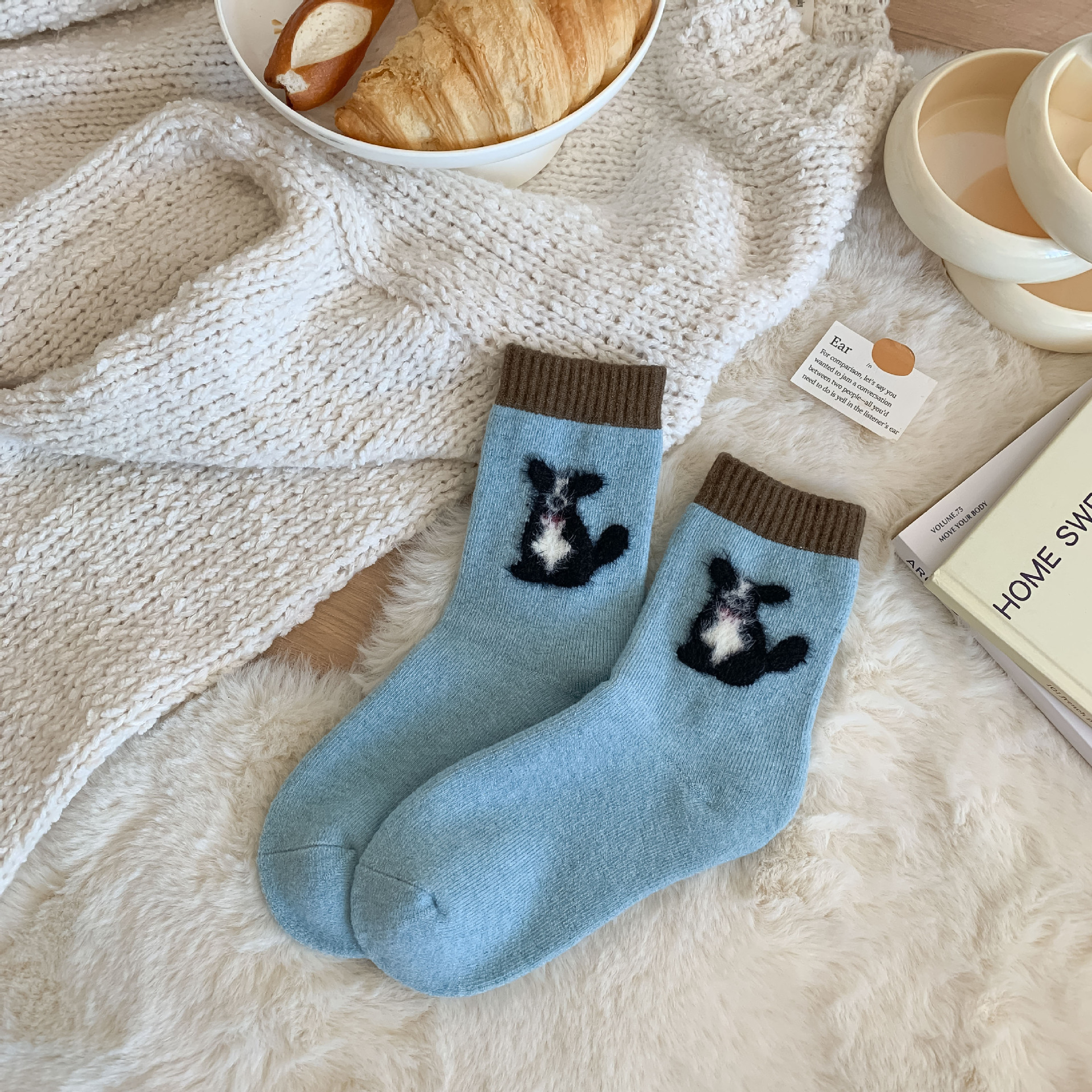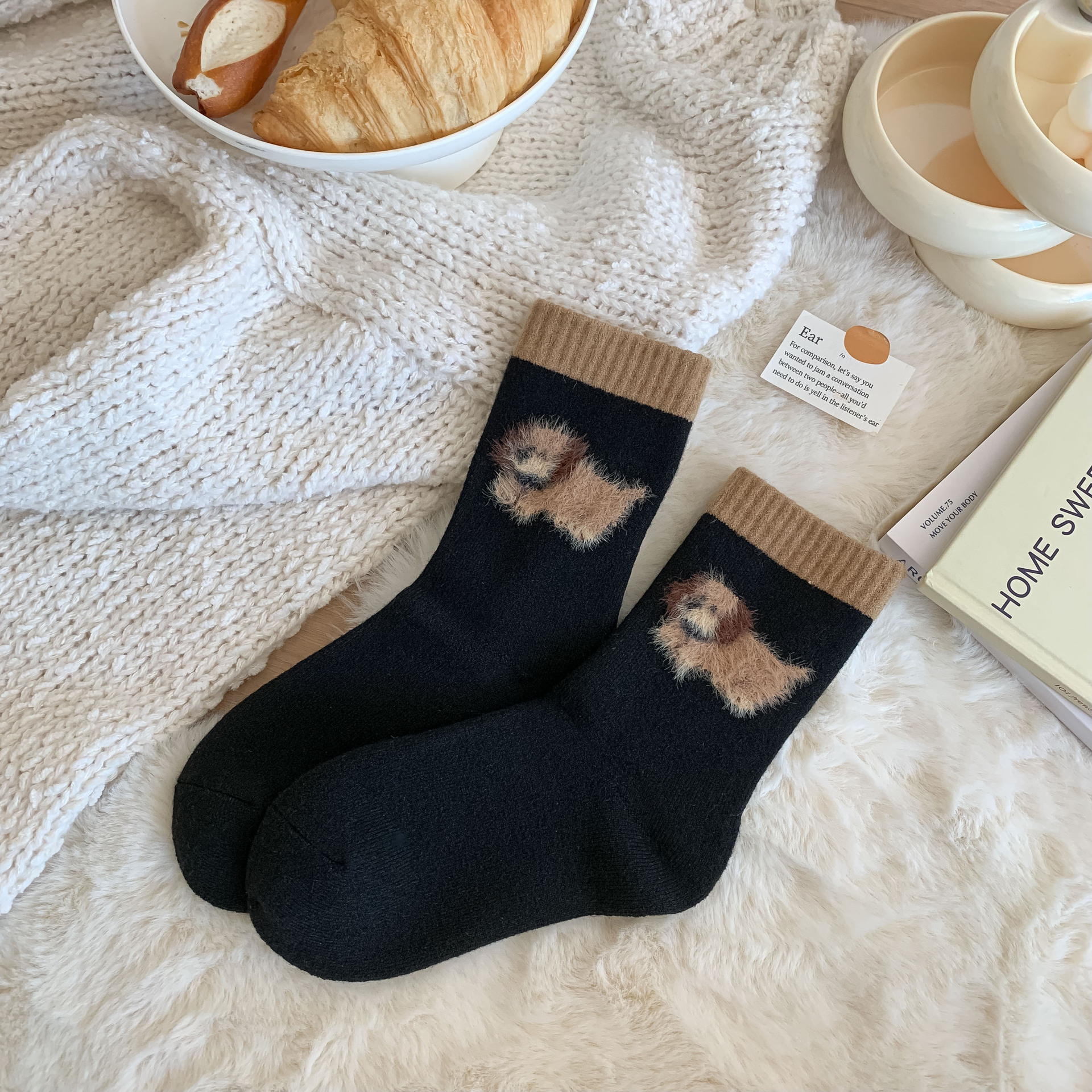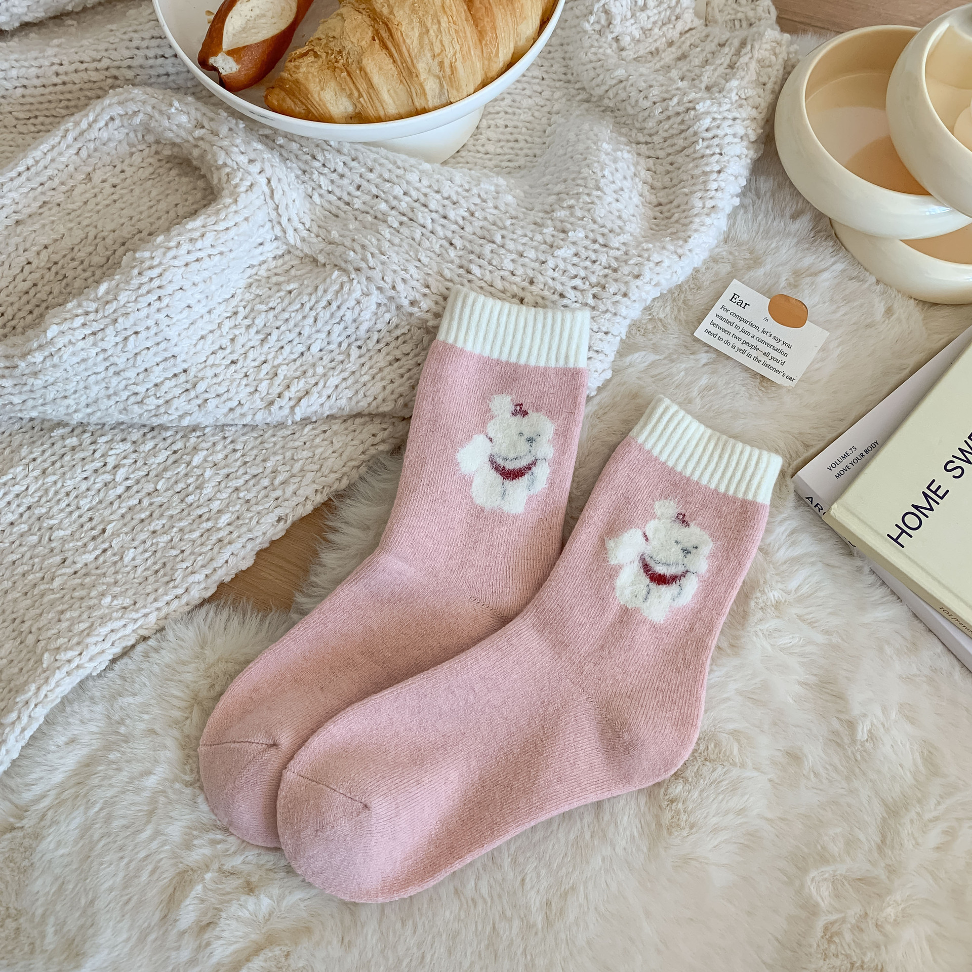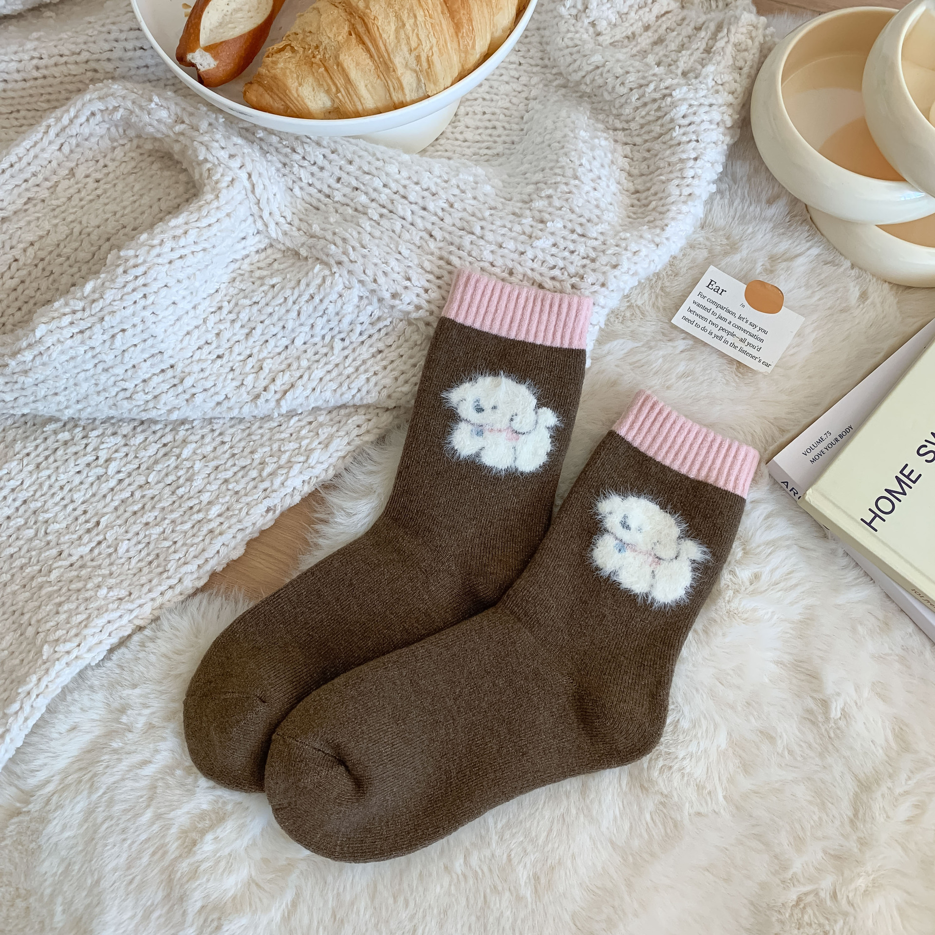 가을과 겨울 달콤한 만화 개 캐시미어 테리 따뜻한 튜브 양말 두껍게 부드러운 왁스 더미 양말 소녀 입체 양말