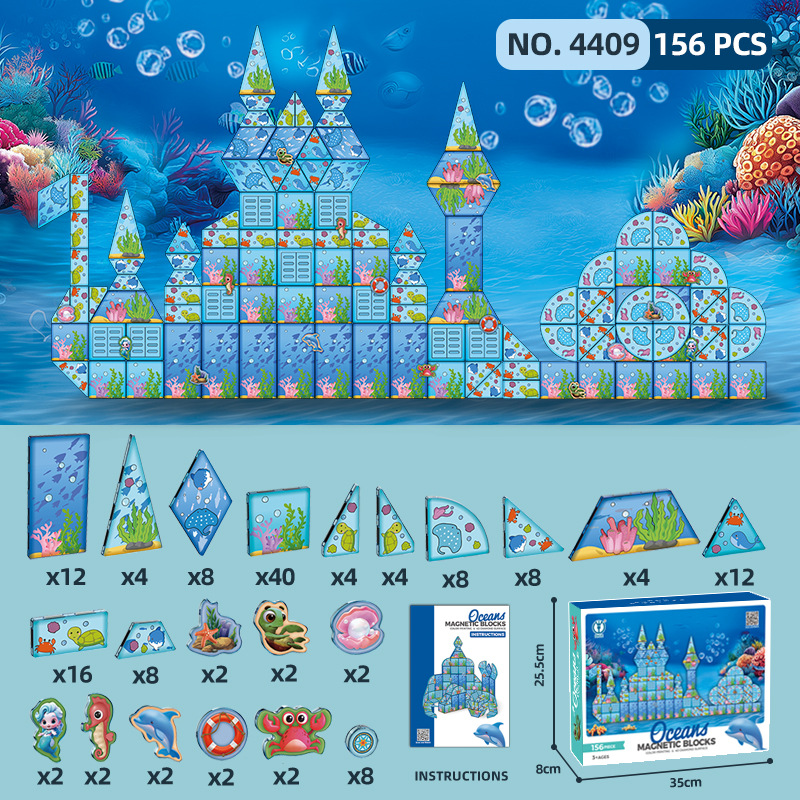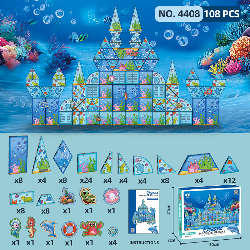 2024 국경 새 제품 해양 색상 창 자기 필름 3 어린이 4 퍼즐 조립 건물 블록 장난감 드릴 패턴 해저 동물
