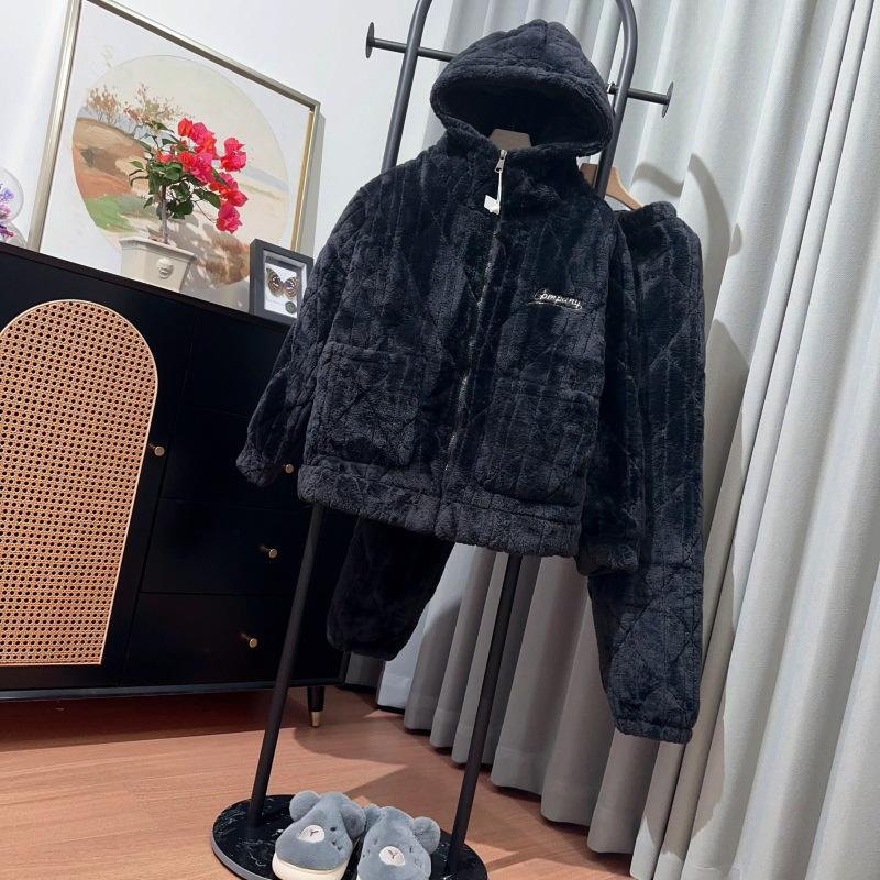 겨울 커플 남녀 파자마 후드 캐주얼 지퍼 홈 옷 따뜻한 3 층 퀼트 외부 착용 세트