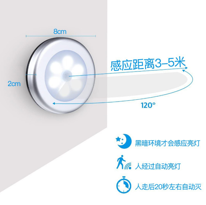 3.感应:黑暗环境感应到人体活动,自动亮灯,人在感应范围内活动,灯会持续感应亮灯,感应不到人体活动后20秒左右自动灭。