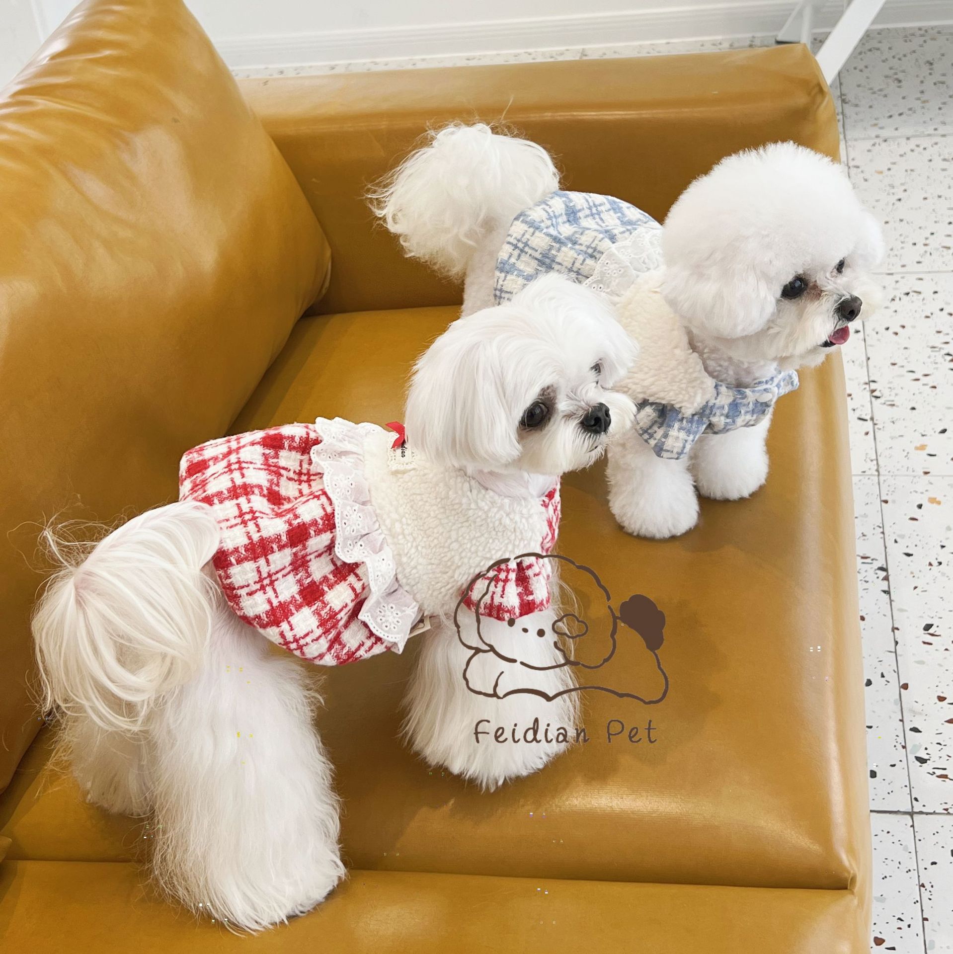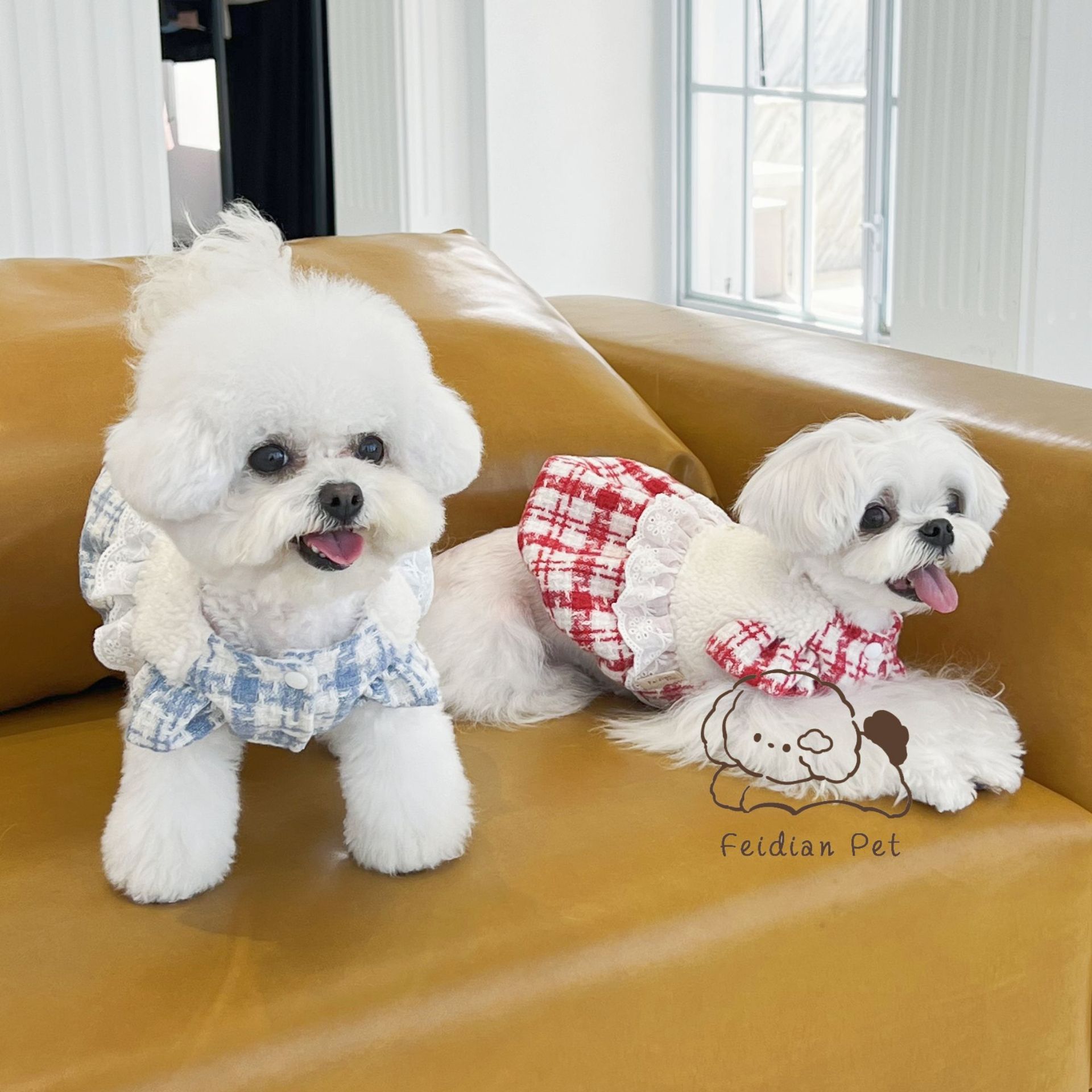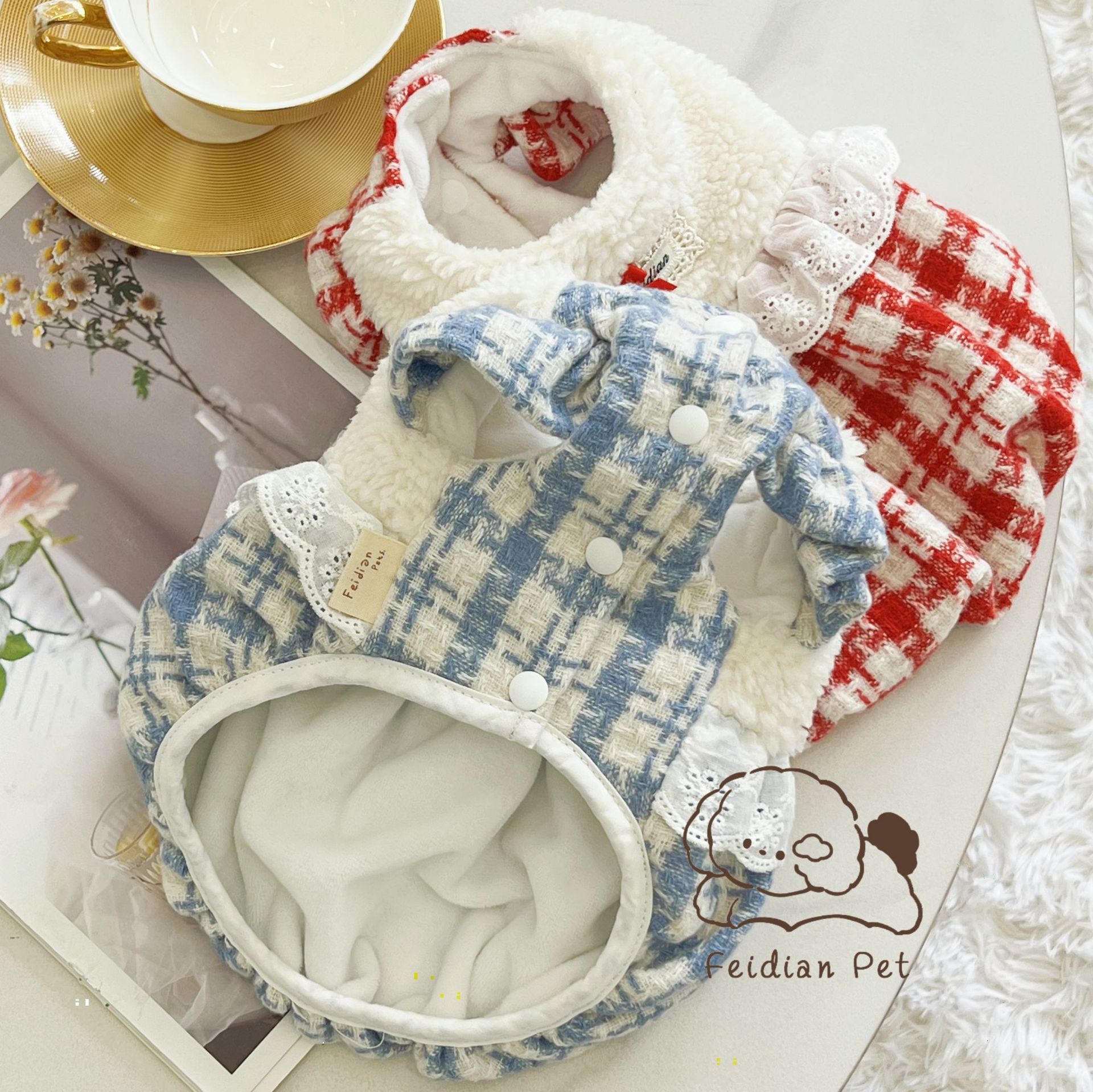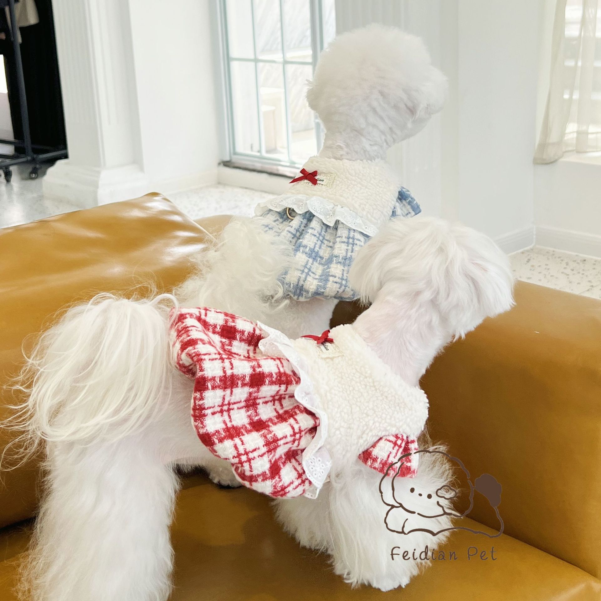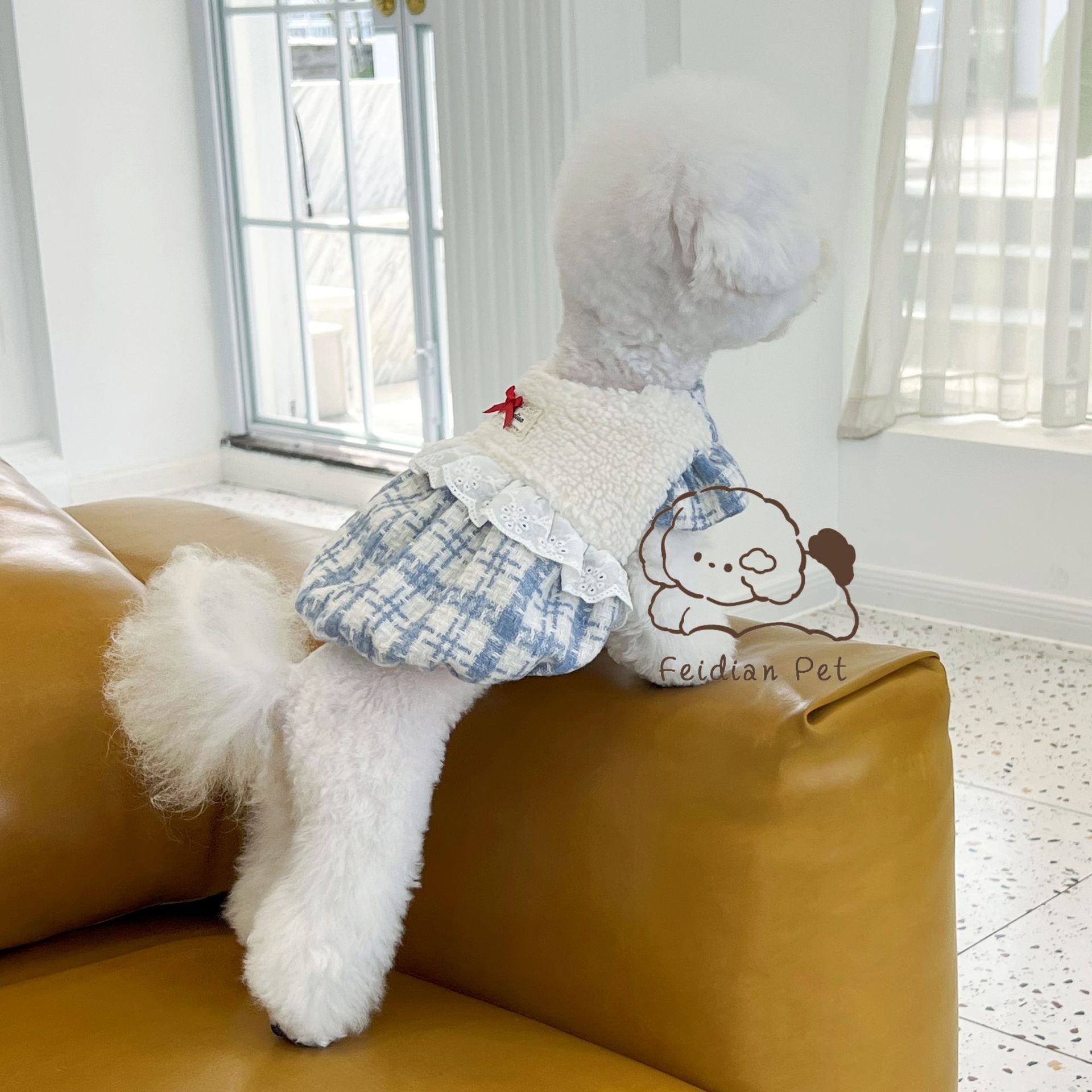 가을과 겨울 새로운 더블 레이어 기모 샤넬 스타일 양고기 벨벳 스티칭 호박 원피스 작은 개와 고양이 패션 두꺼운 의류스토어 가기