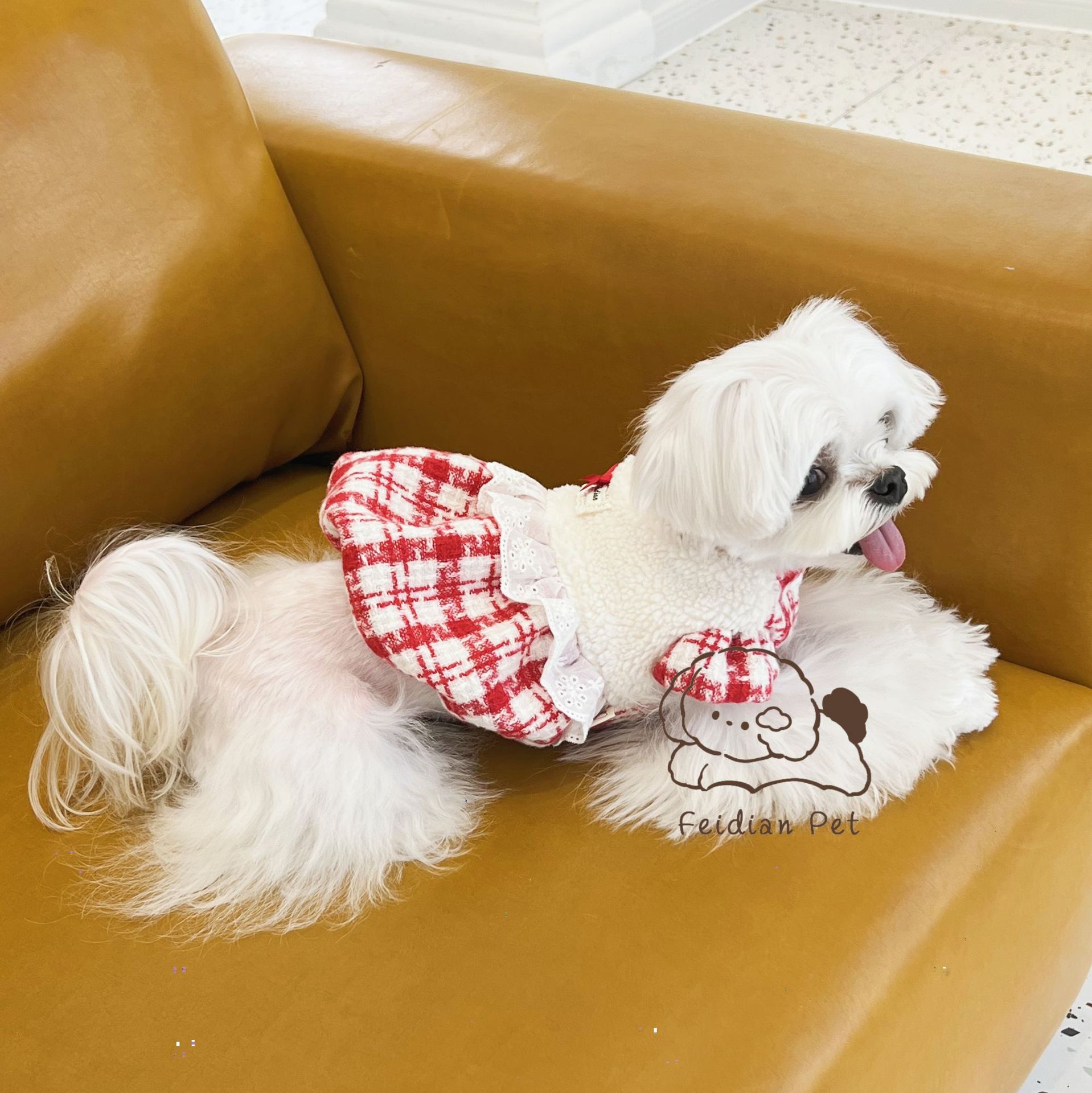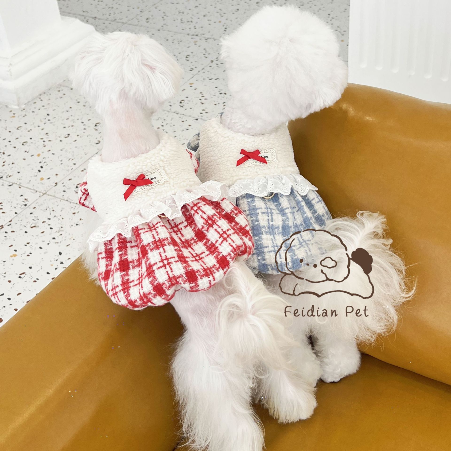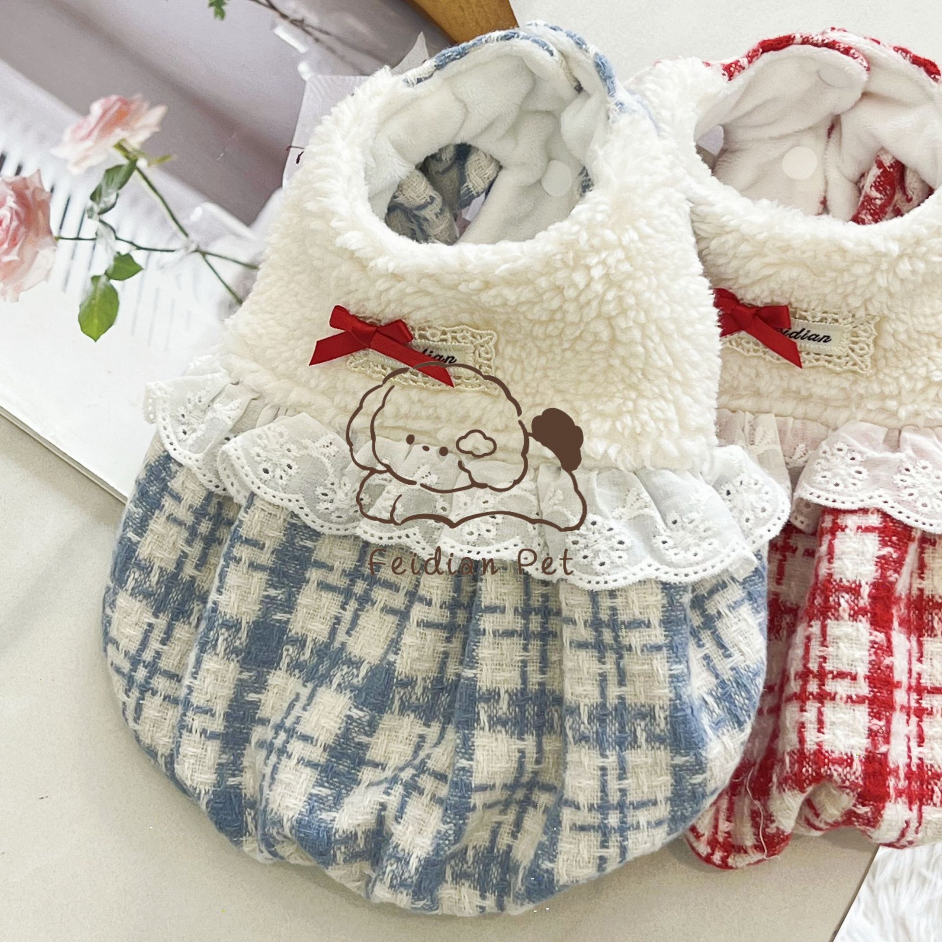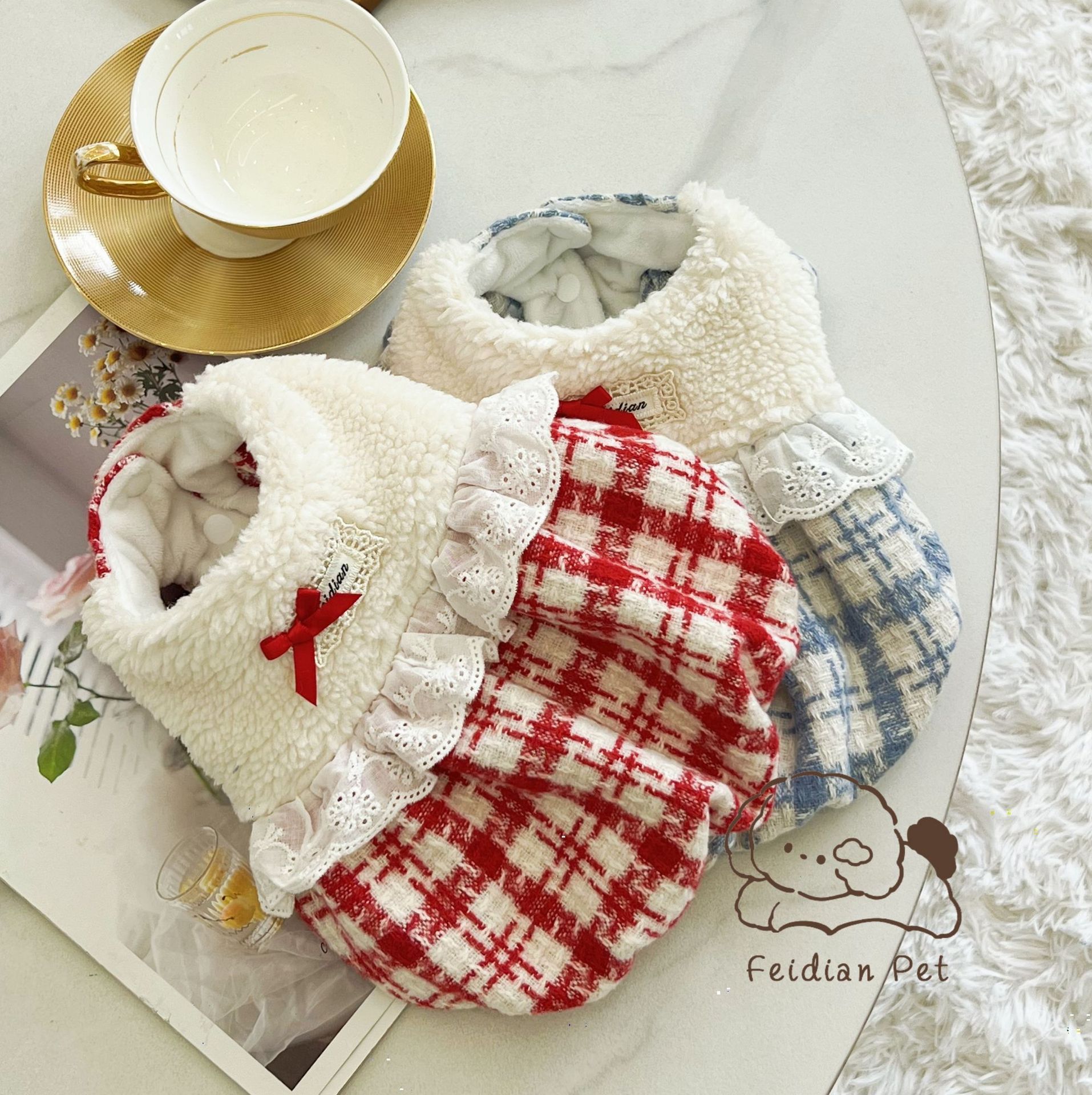 가을과 겨울 새로운 더블 레이어 기모 샤넬 스타일 양고기 벨벳 스티칭 호박 원피스 작은 개와 고양이 패션 두꺼운 의류스토어 가기
