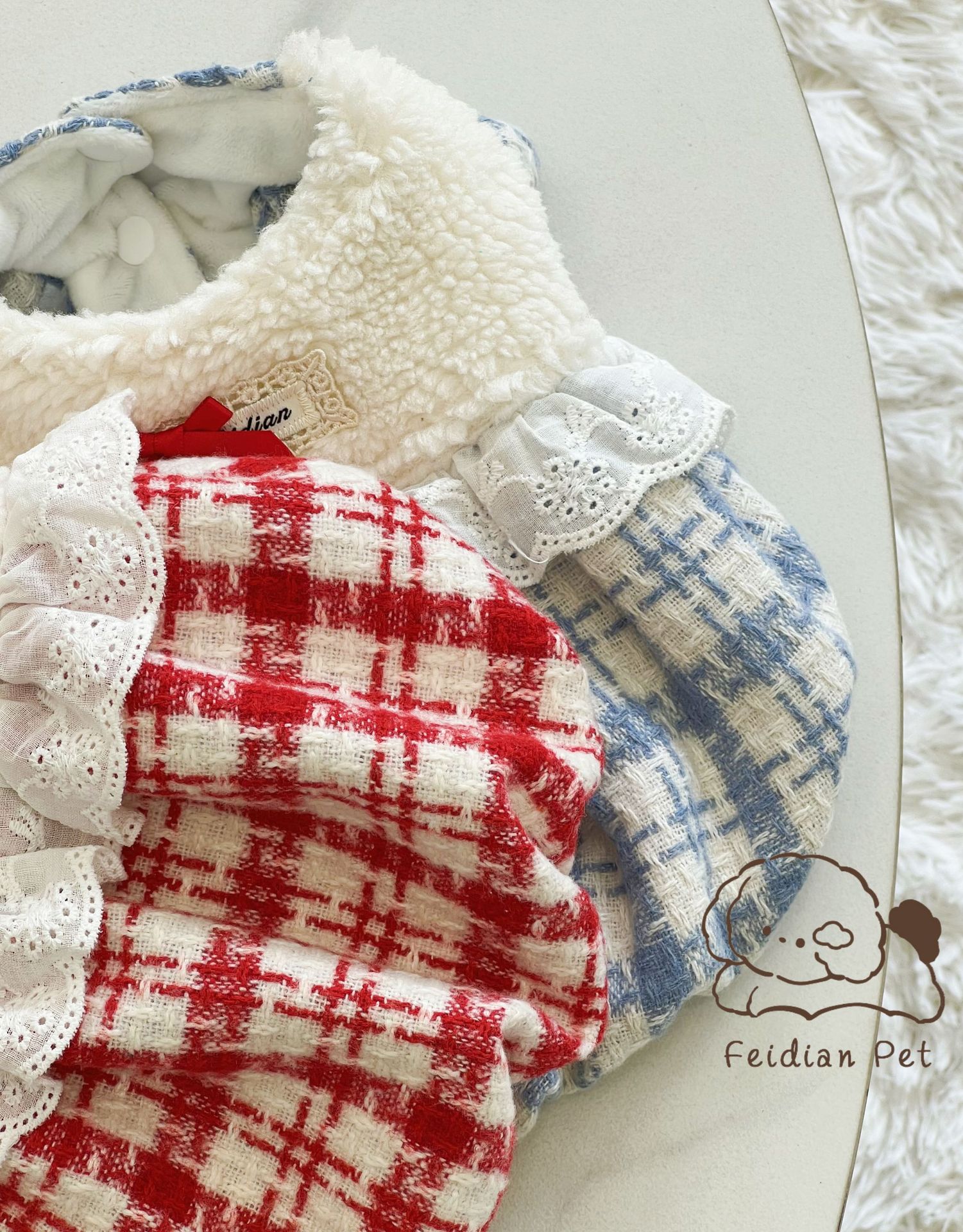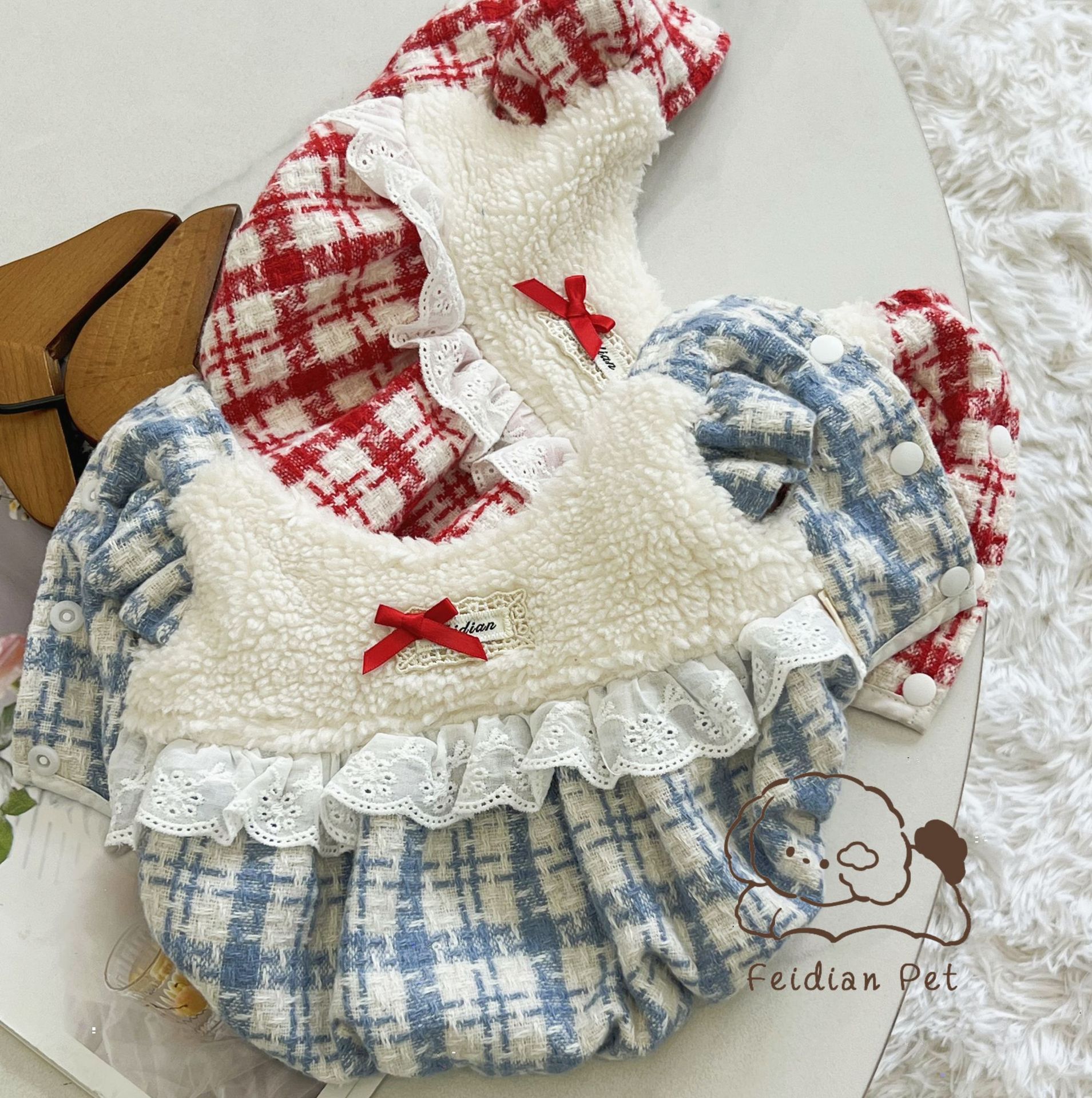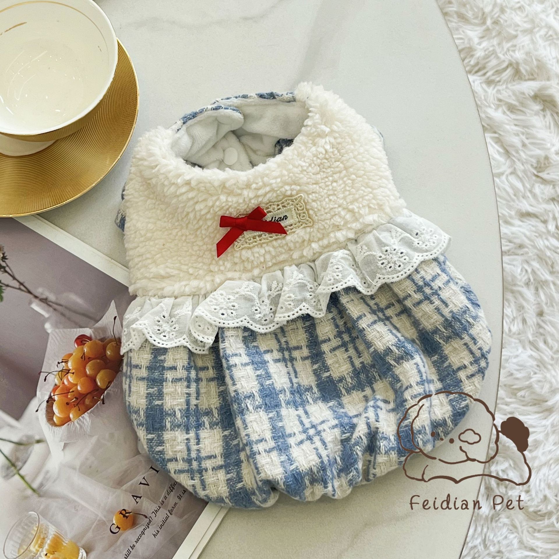 가을과 겨울 새로운 더블 레이어 기모 샤넬 스타일 양고기 벨벳 스티칭 호박 원피스 작은 개와 고양이 패션 두꺼운 의류