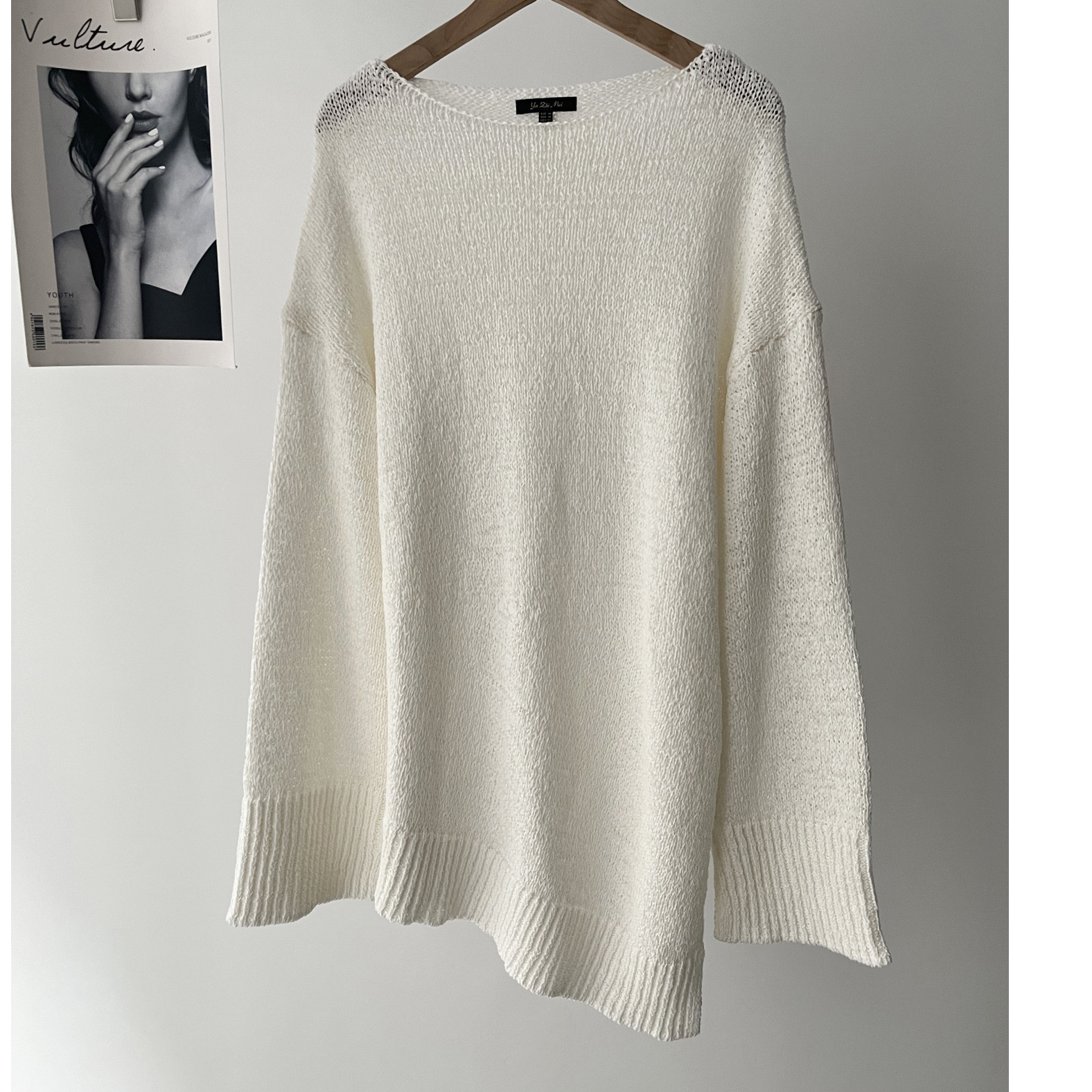 재고 m 스타일 여성 의류 차가운 흰색 소음 조명 비대칭 헴 느슨한 보트 칼라 긴 소매 풀오버 스웨터