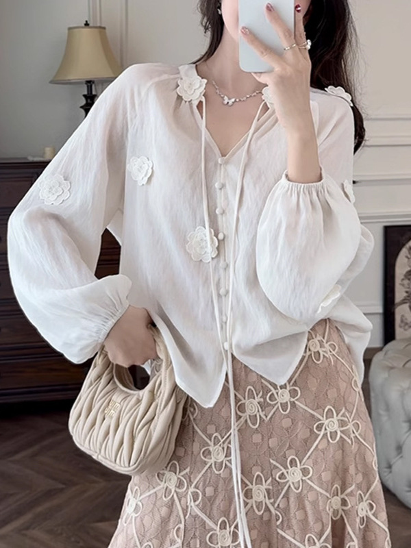 24 가을 "미스 샹젤리제" 프랑스 느슨한 포지셔닝 로맨틱 동백 화이트 셔츠