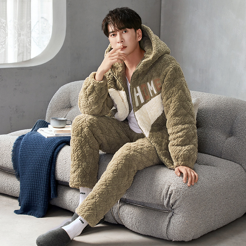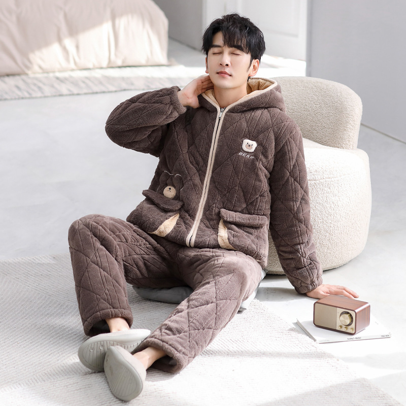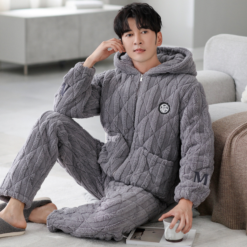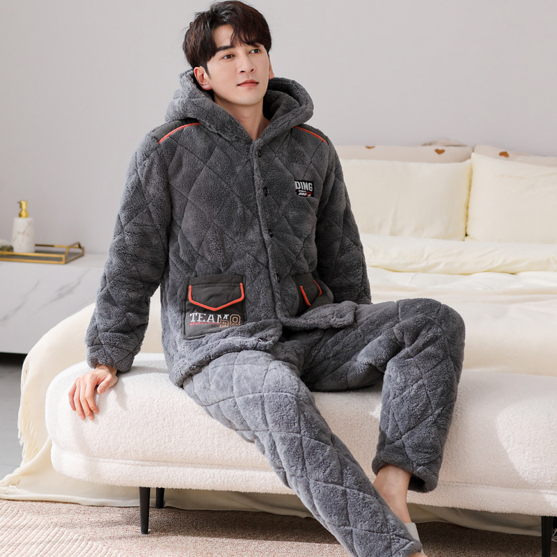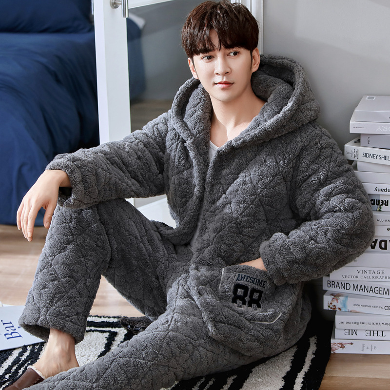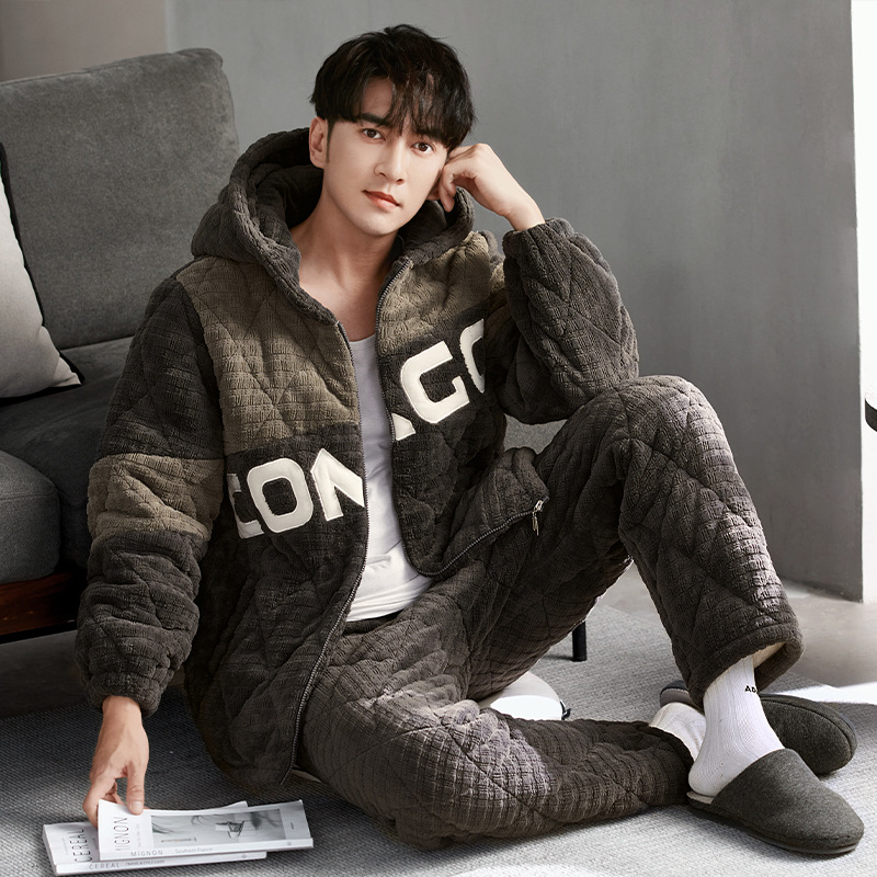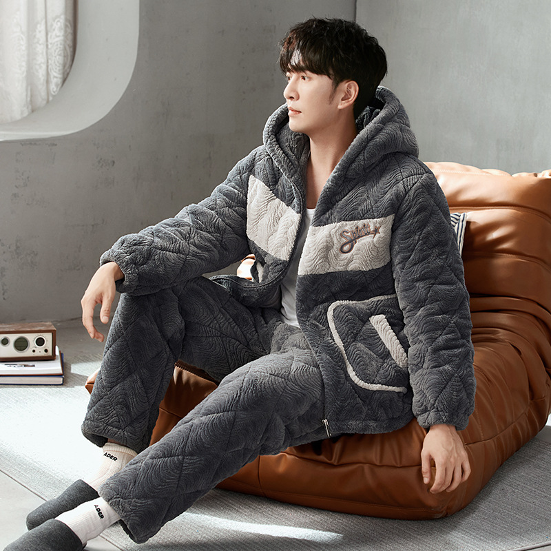 잠옷 남자 겨울 산호 양털 3 층 두꺼운 퀼트 따뜻한 겨울 플란넬 세트
