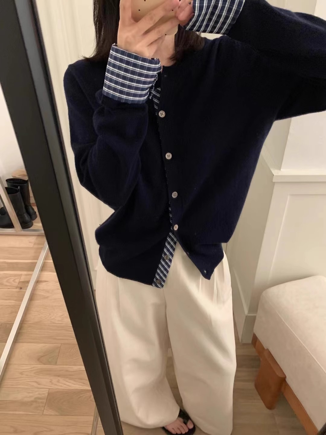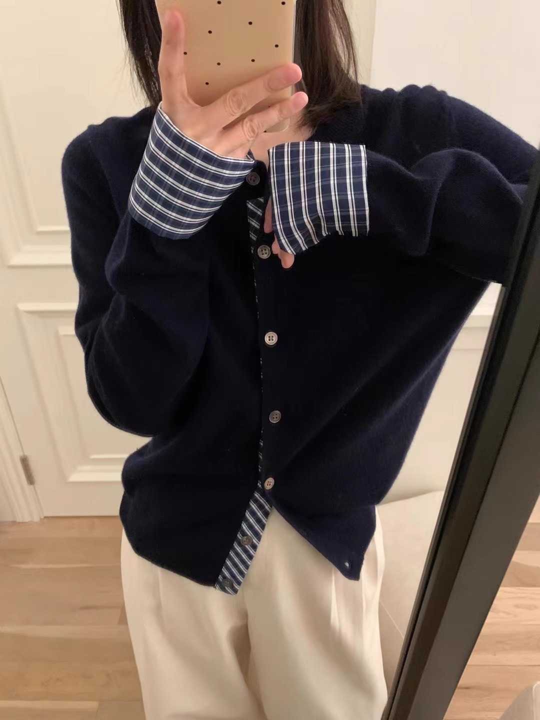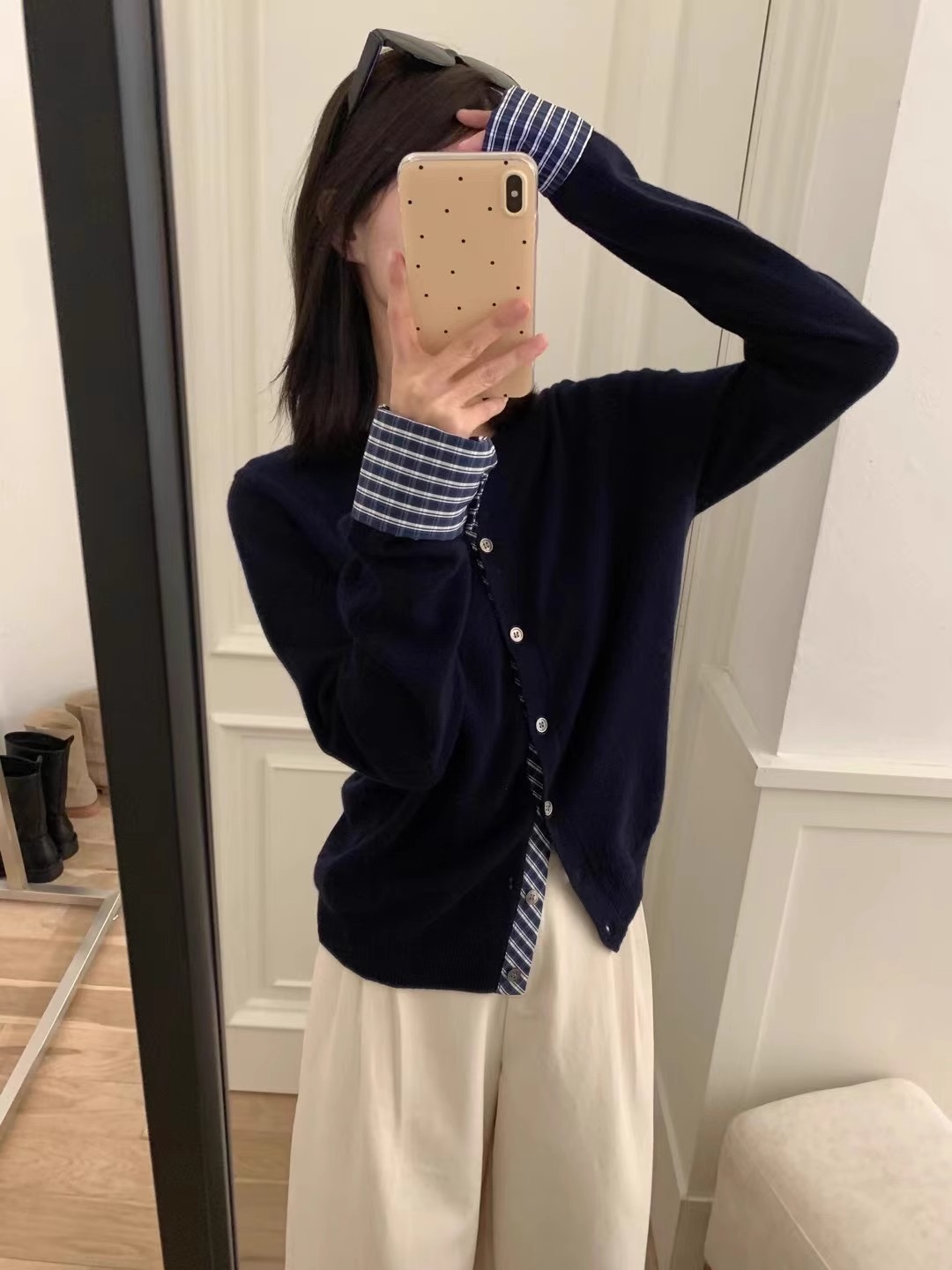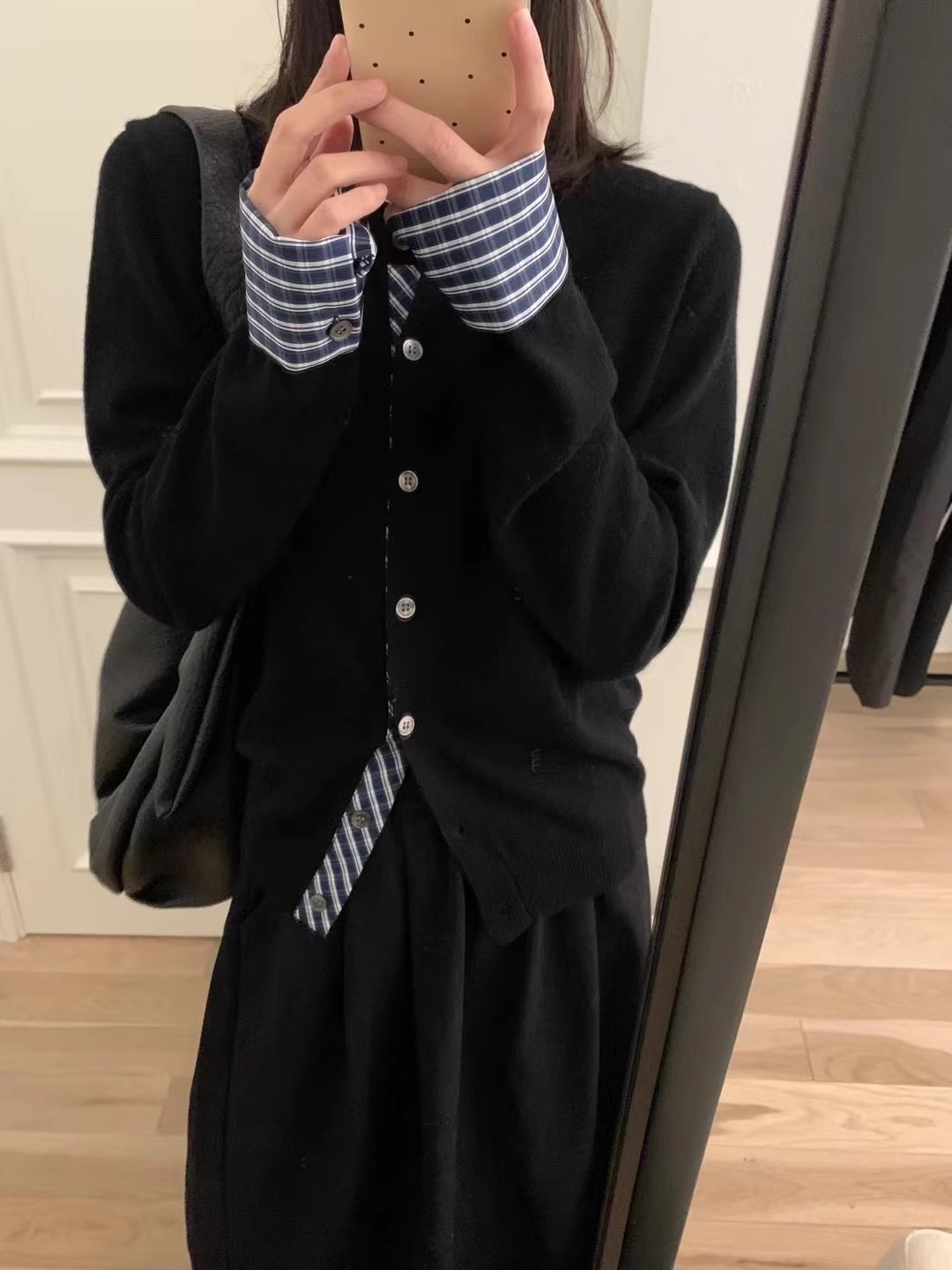 봄, 가을, 겨울 여성용 니트 가디건 한국식 연령 감소 싱글 브레스트 탑 재킷 대비 색상 격자 무늬 스플 라이스 블랙 스웨터스토어 가기