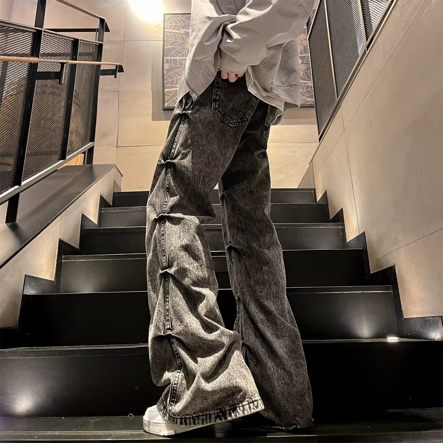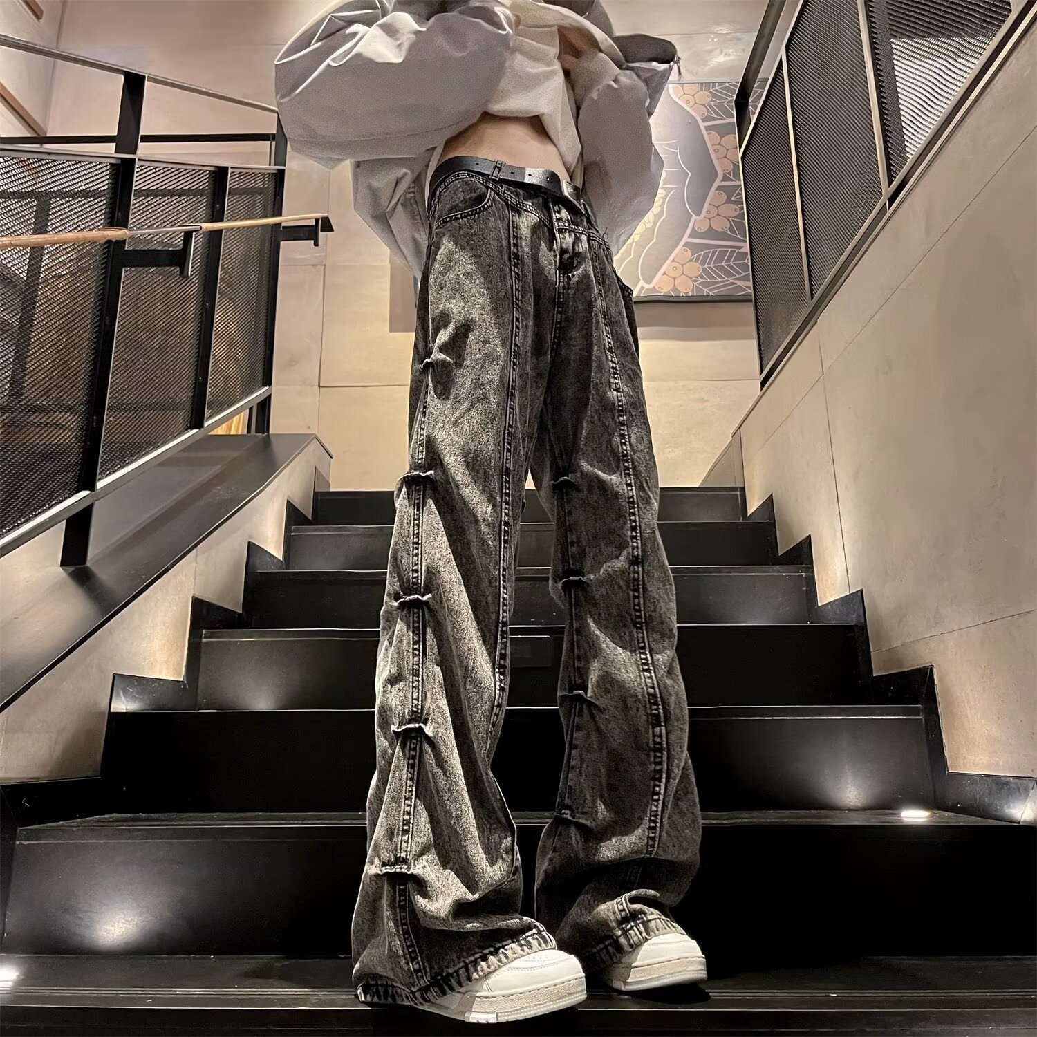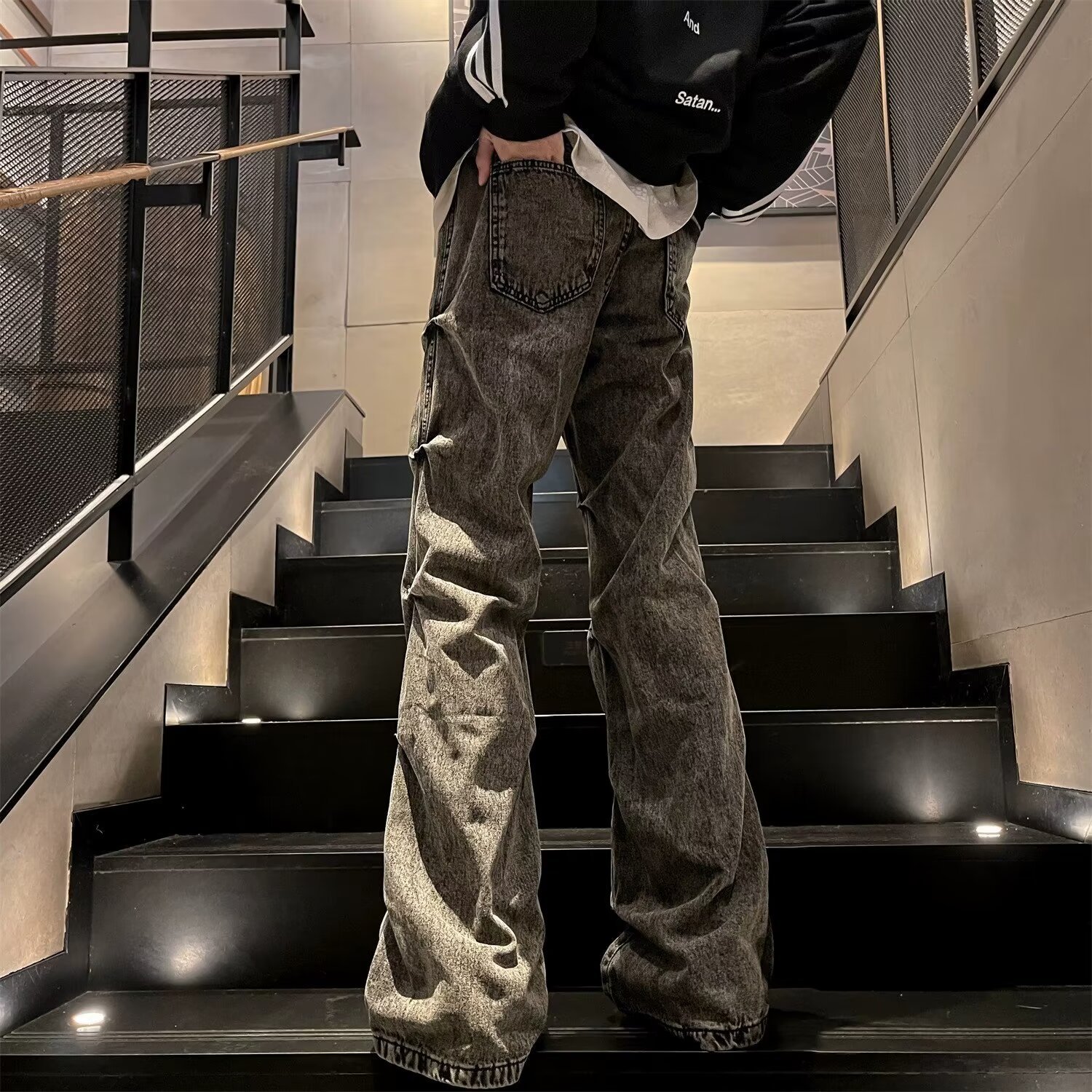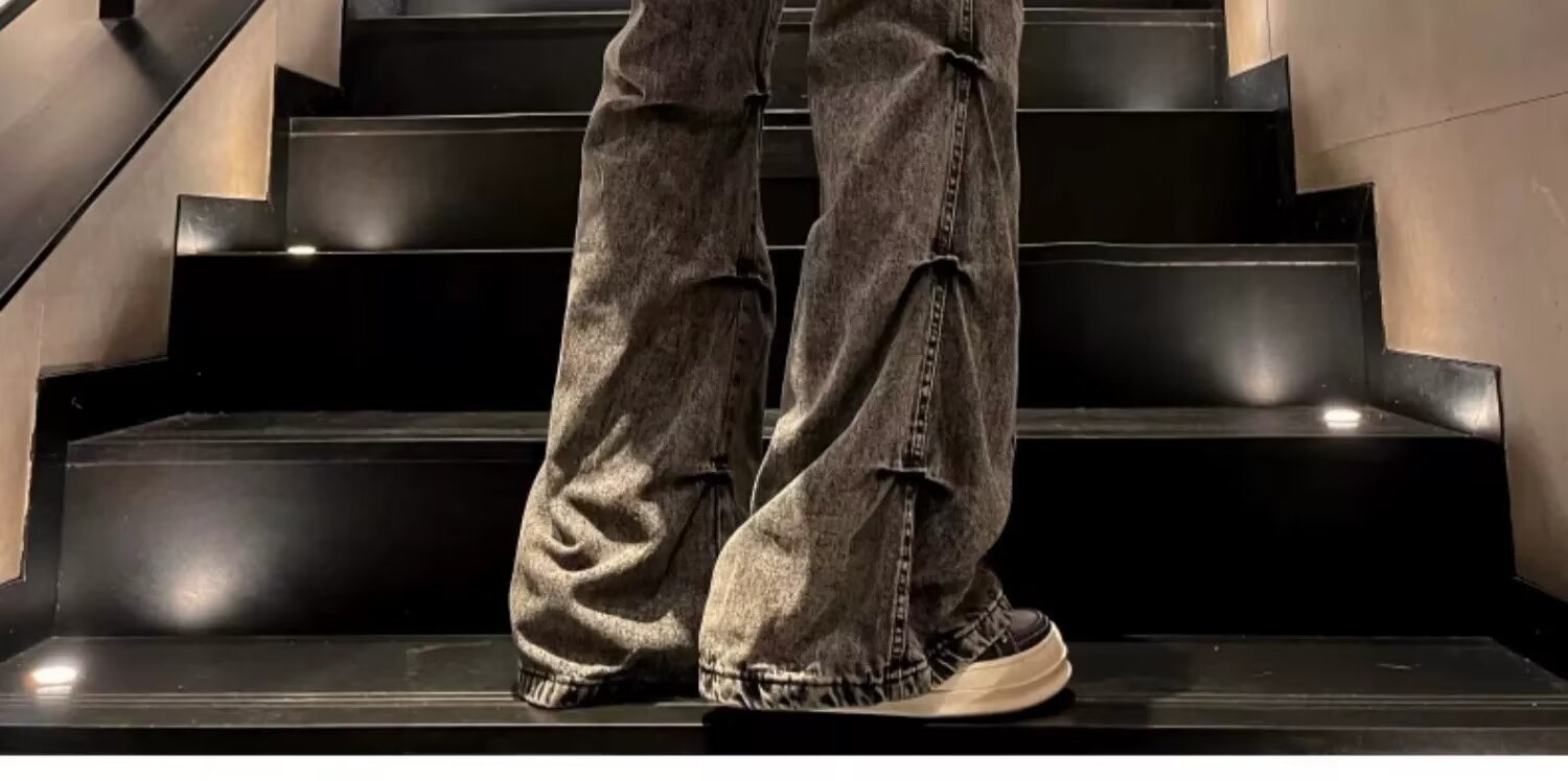 봄과 가을 미국 스타일 하이 스트리트 바이브 스타일 바지 남성 디자인 센스 틈새 지퍼 청바지 스트레이트 마이크로 플레어 바지스토어 가기