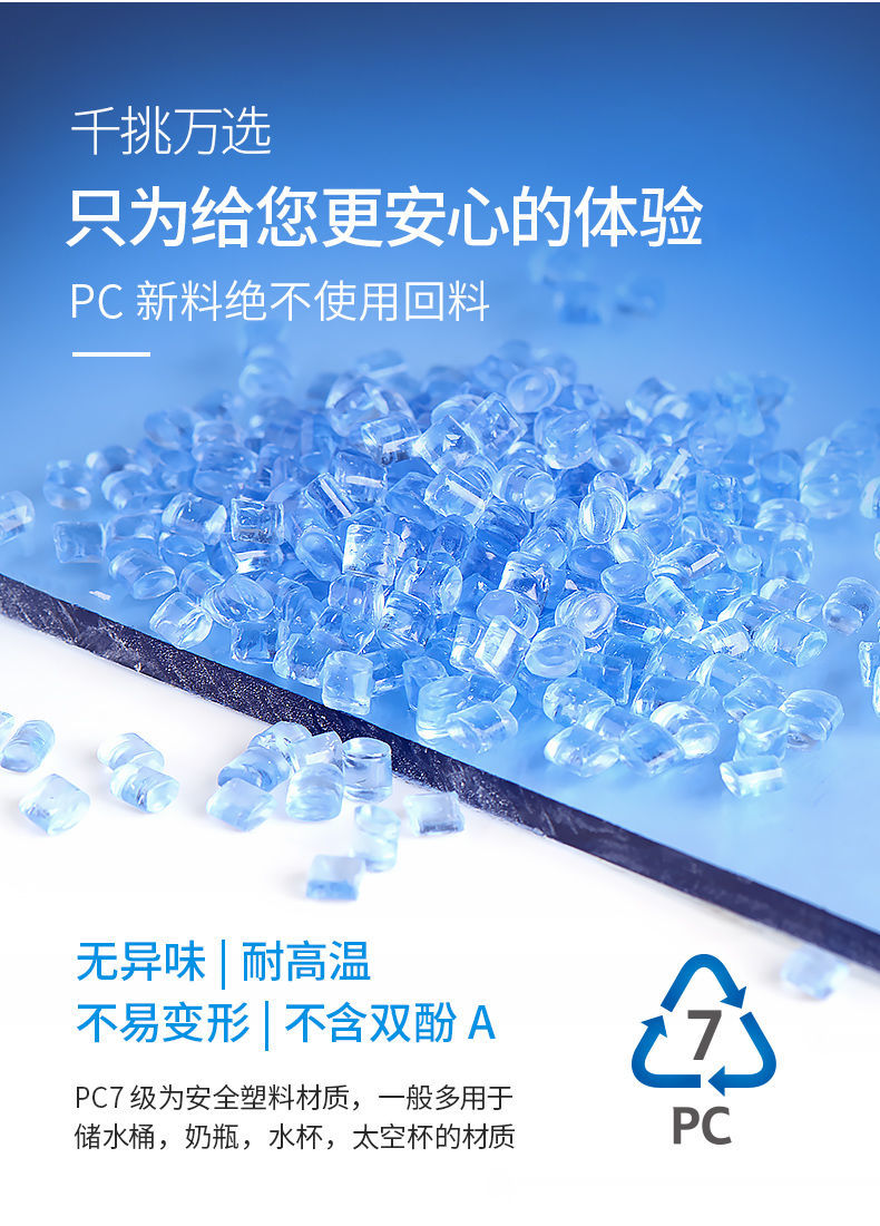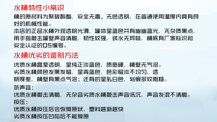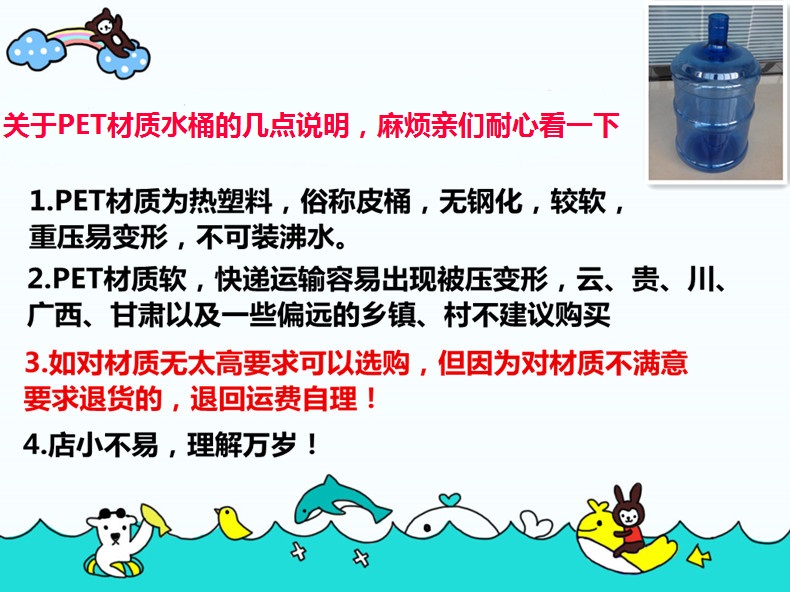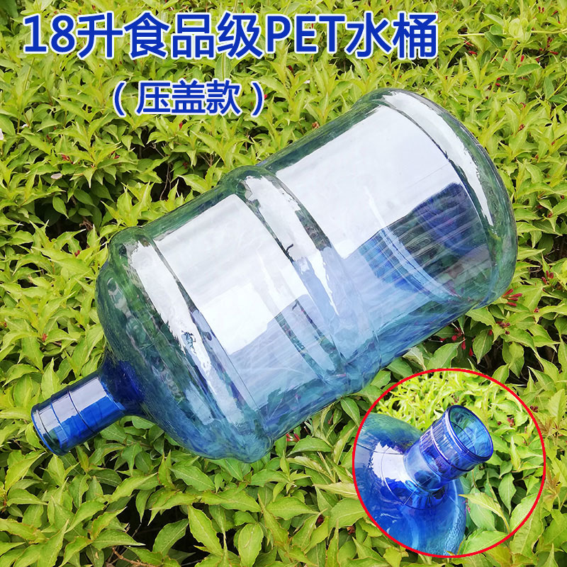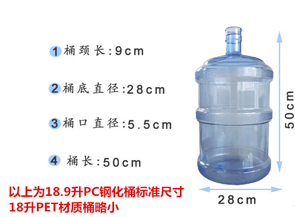 PC桶为钢化桶,为全新材料,抗压耐摔,可装开水,18.9升装水可以装19KG左右。装油16.5KG左右。