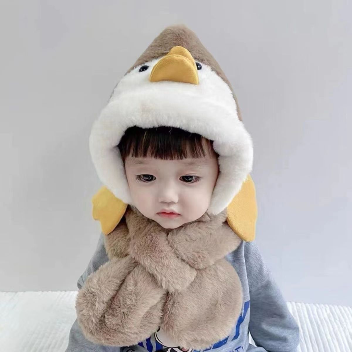 겨울 어린이 따뜻한 원피스 스카프 투피스 세트 귀여운 만화 노란색 오리 아기 소년과 소녀 플러시 풀오버 캡스토어 가기