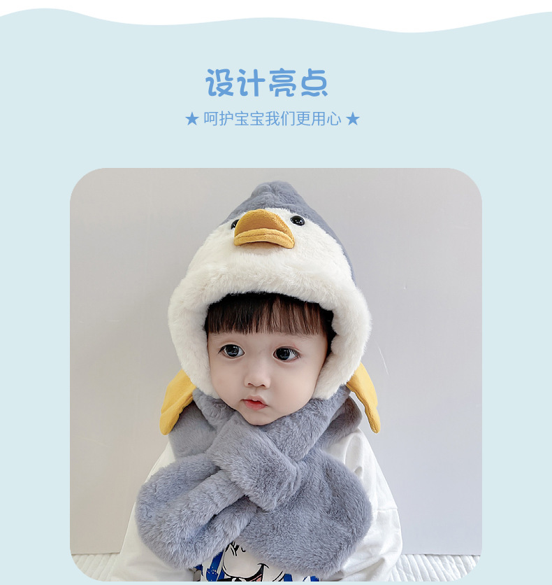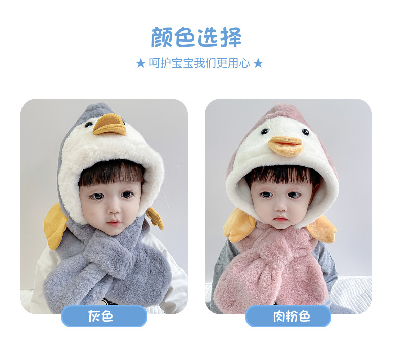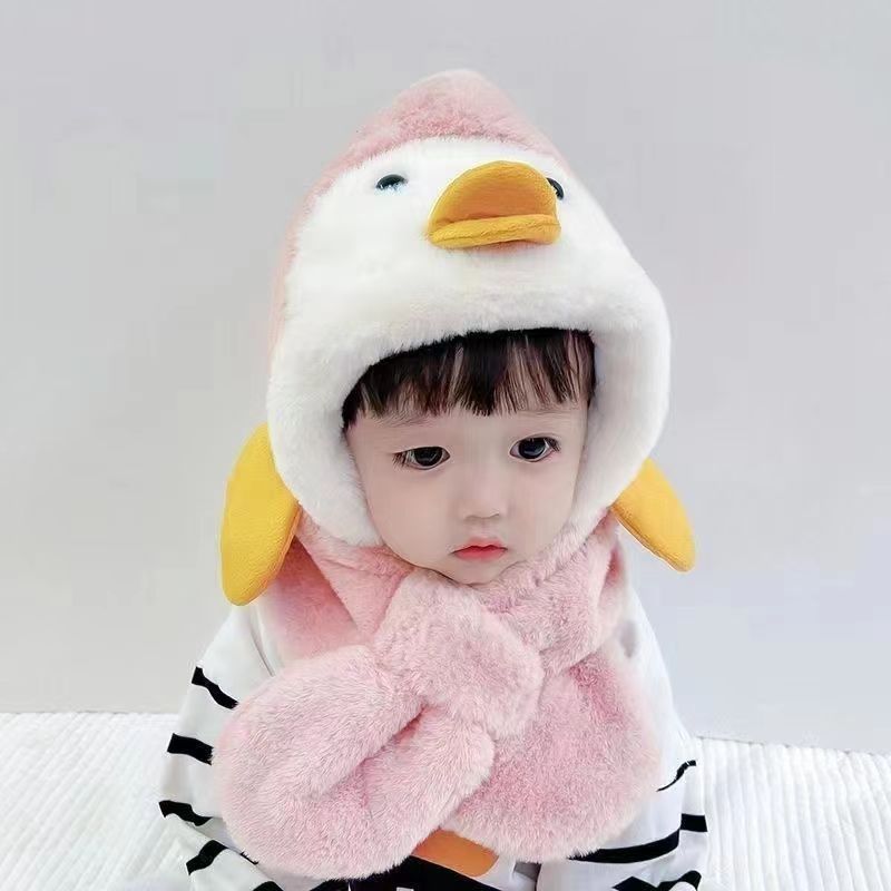 겨울 어린이 따뜻한 원피스 스카프 투피스 세트 귀여운 만화 노란색 오리 아기 소년과 소녀 플러시 풀오버 캡