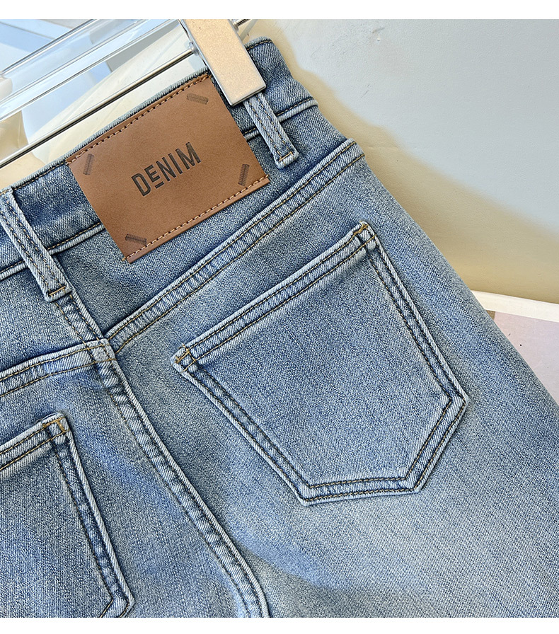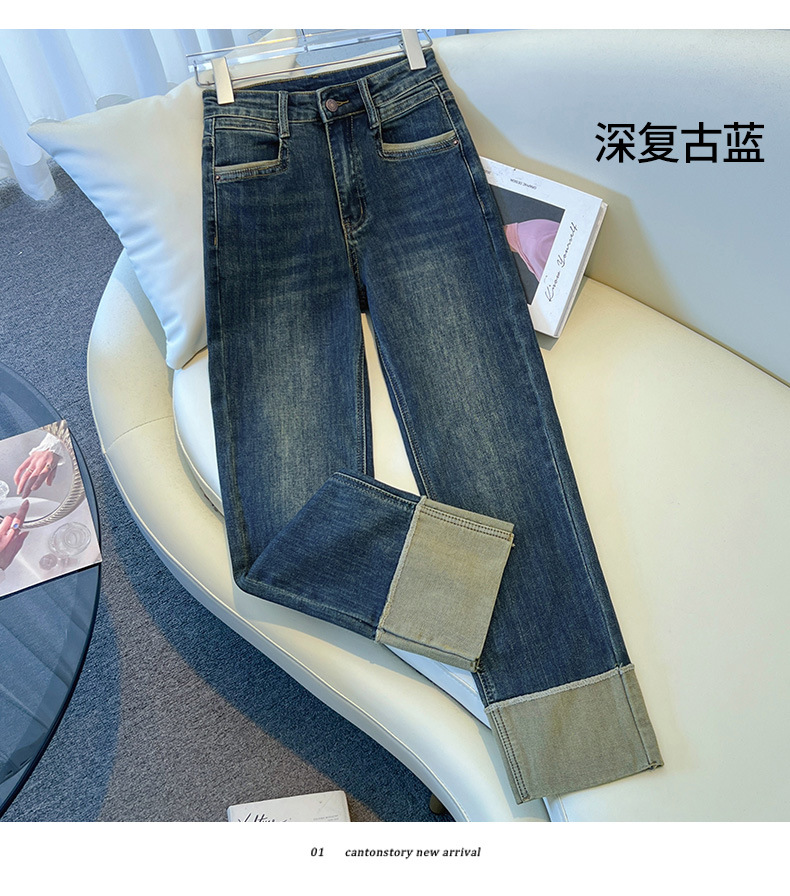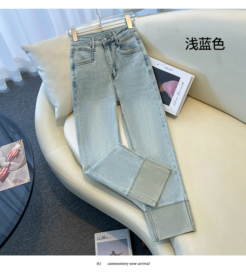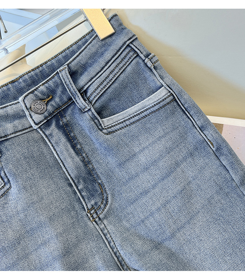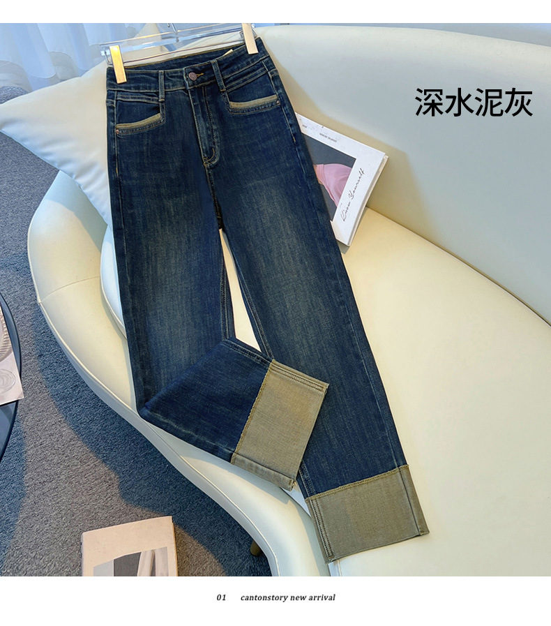 스트레이트 레그 청바지 여성용 봄과 가을 새해 올해 인기있는 바게트 바지 바지 슬림 슬리밍 스트레치 플랜지 자른 바지스토어 가기