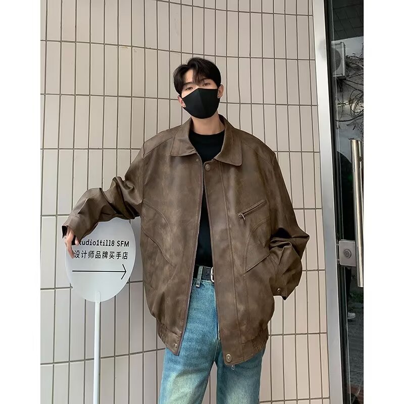 남성용 빈티지 바이커 가죽 자켓을 다크 브라운 국경 간 미국식 폭격기 재킷 느슨하고 잘 생긴 캐주얼 재킷스토어 가기