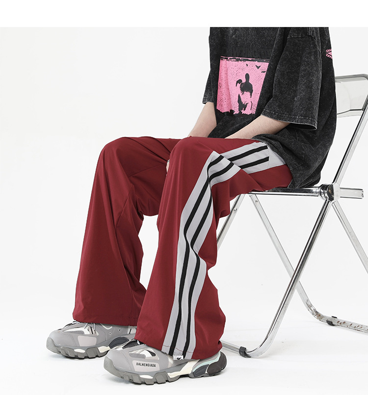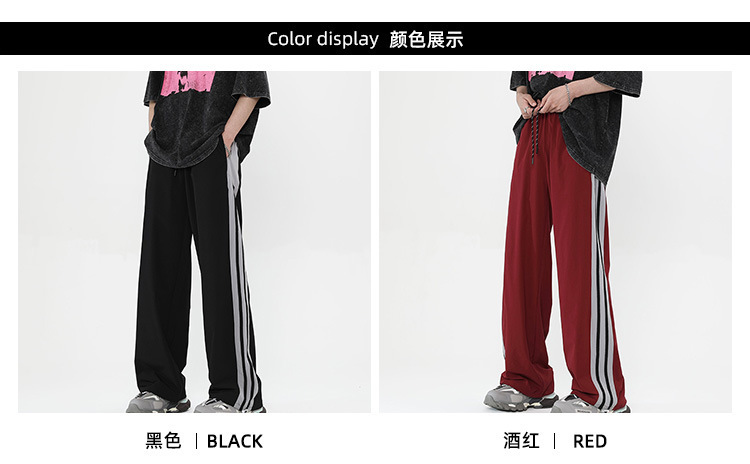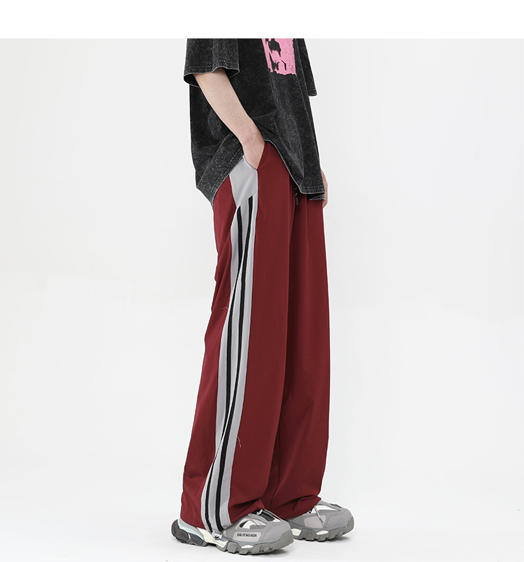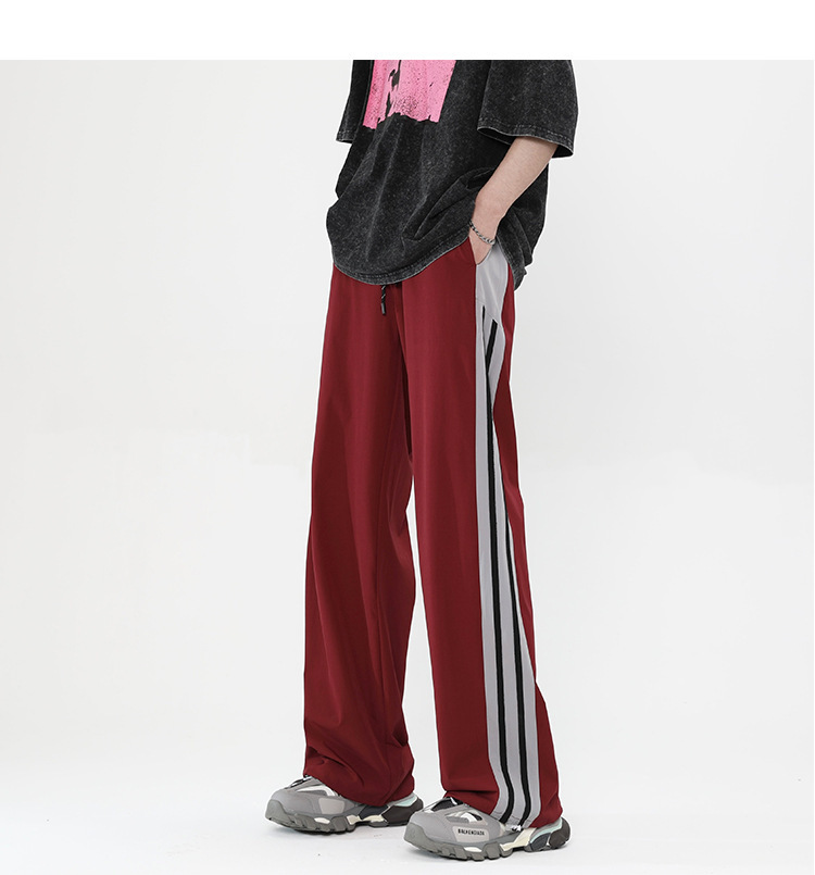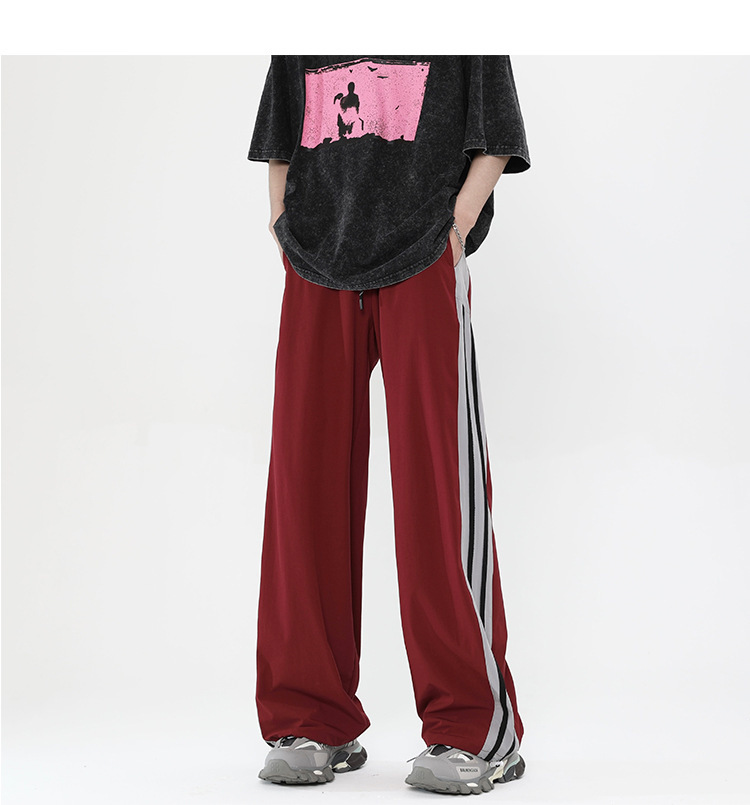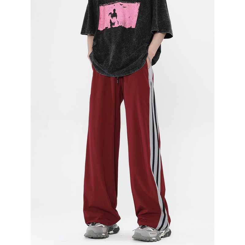 버건디 줄무늬 바지 남자 여름 미국 스타일 하이 스트리트 트렌디 브랜드 느슨한 넓은 다리 스트레이트 캐주얼 스포츠 바지 남자 트렌디스토어 가기