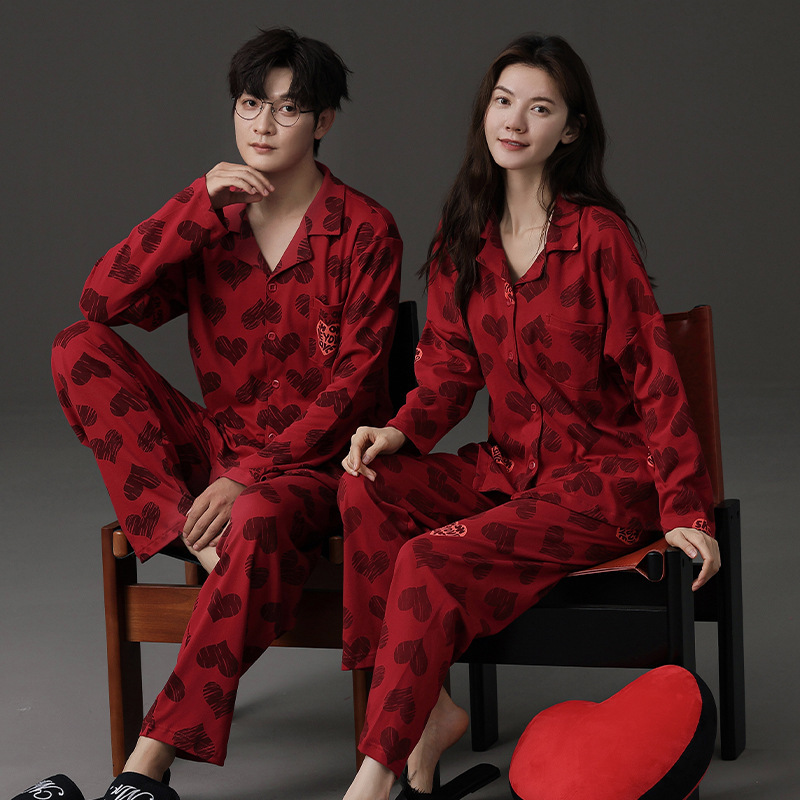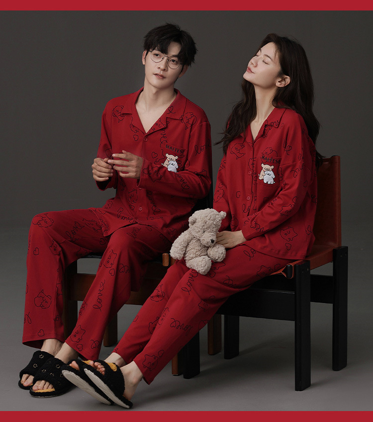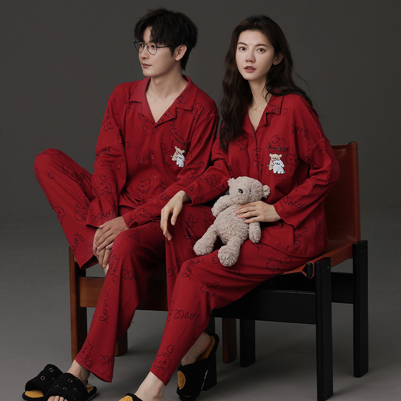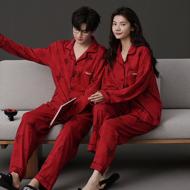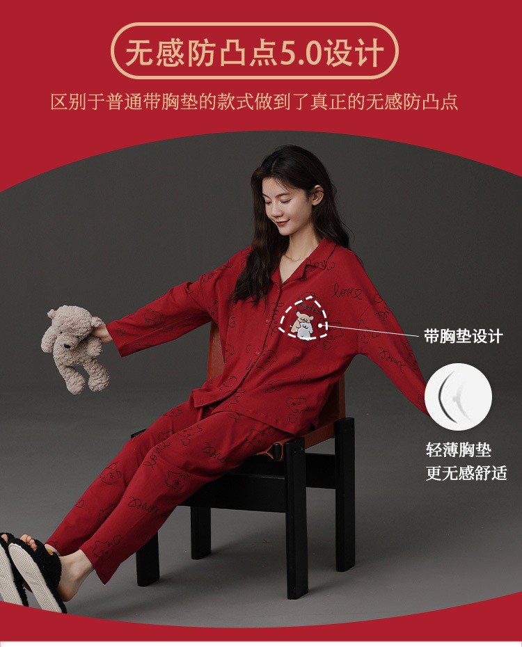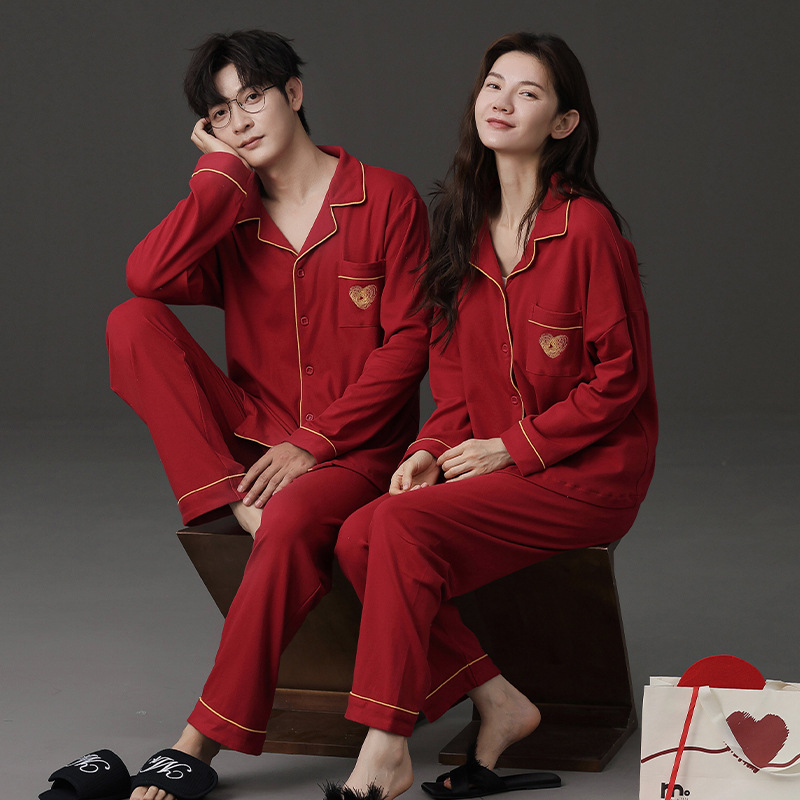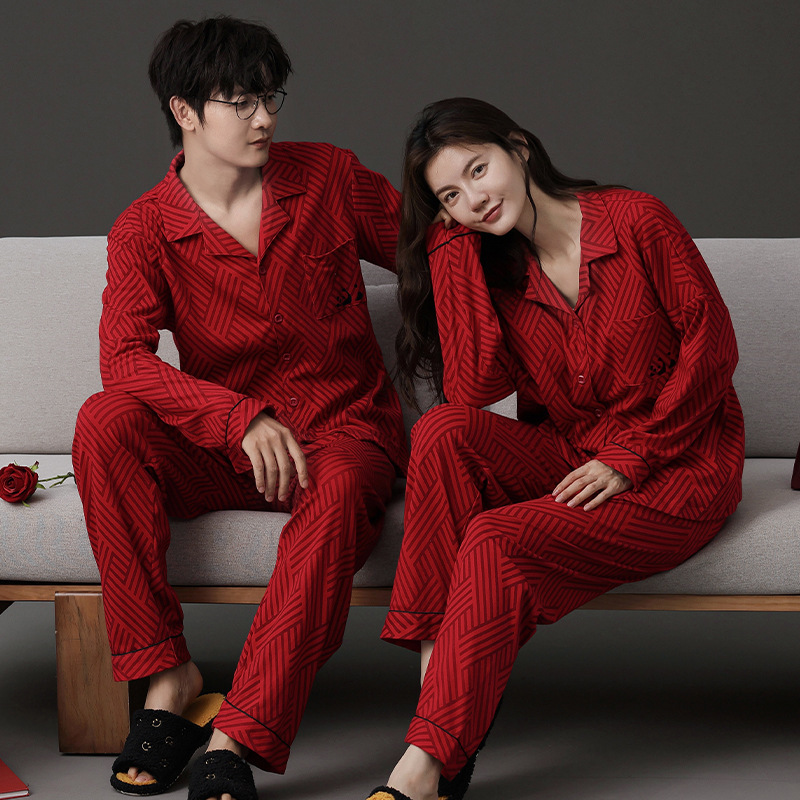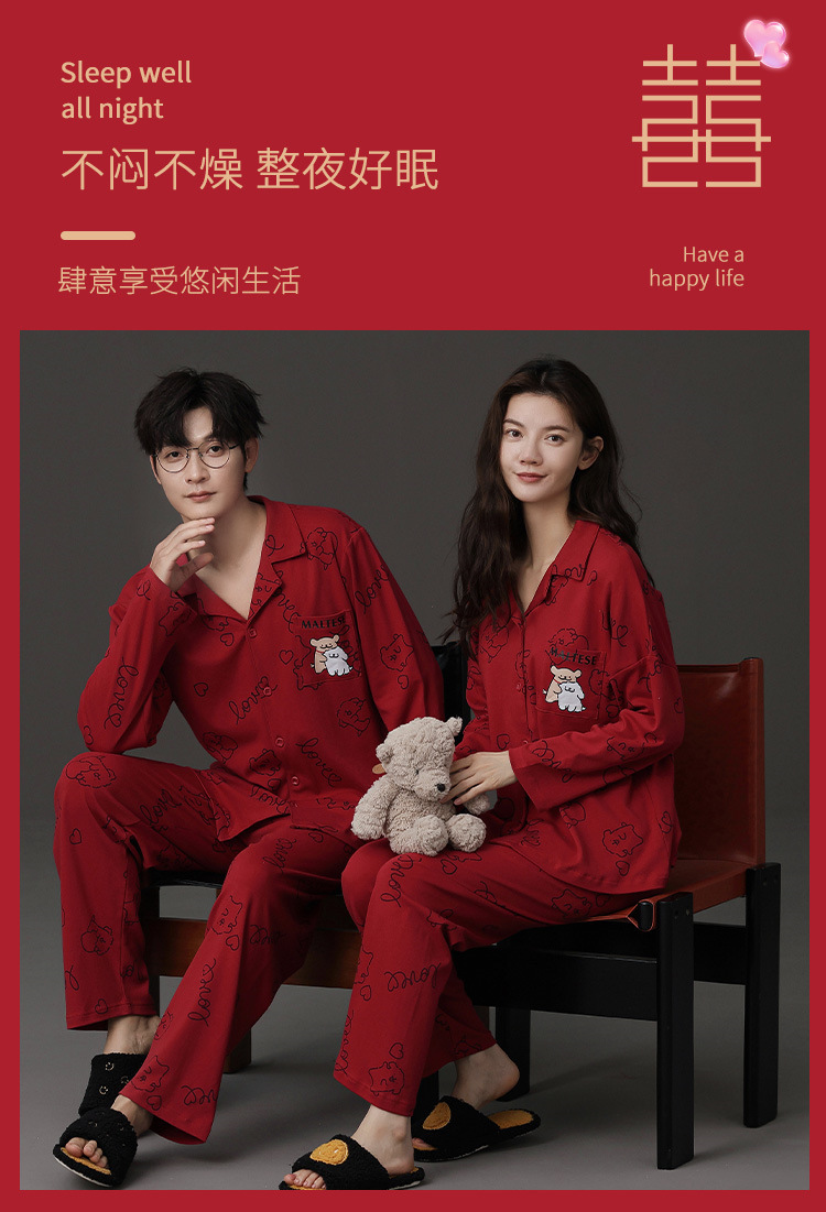 신혼 웨딩 커플 잠옷 봄과 가을 긴 소매 여성 벨트 가슴 패드 카디건 레드 라이프 레드 이어 레드 홈 의류 세트스토어 가기