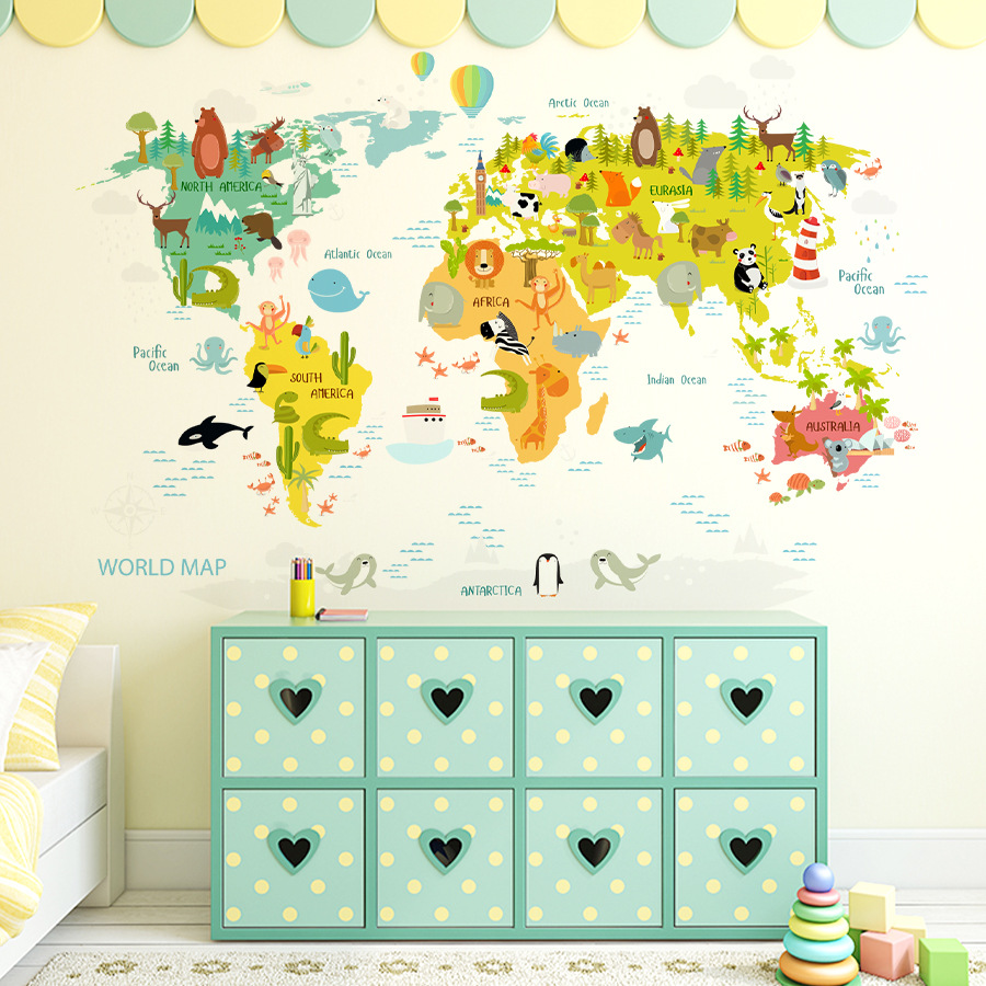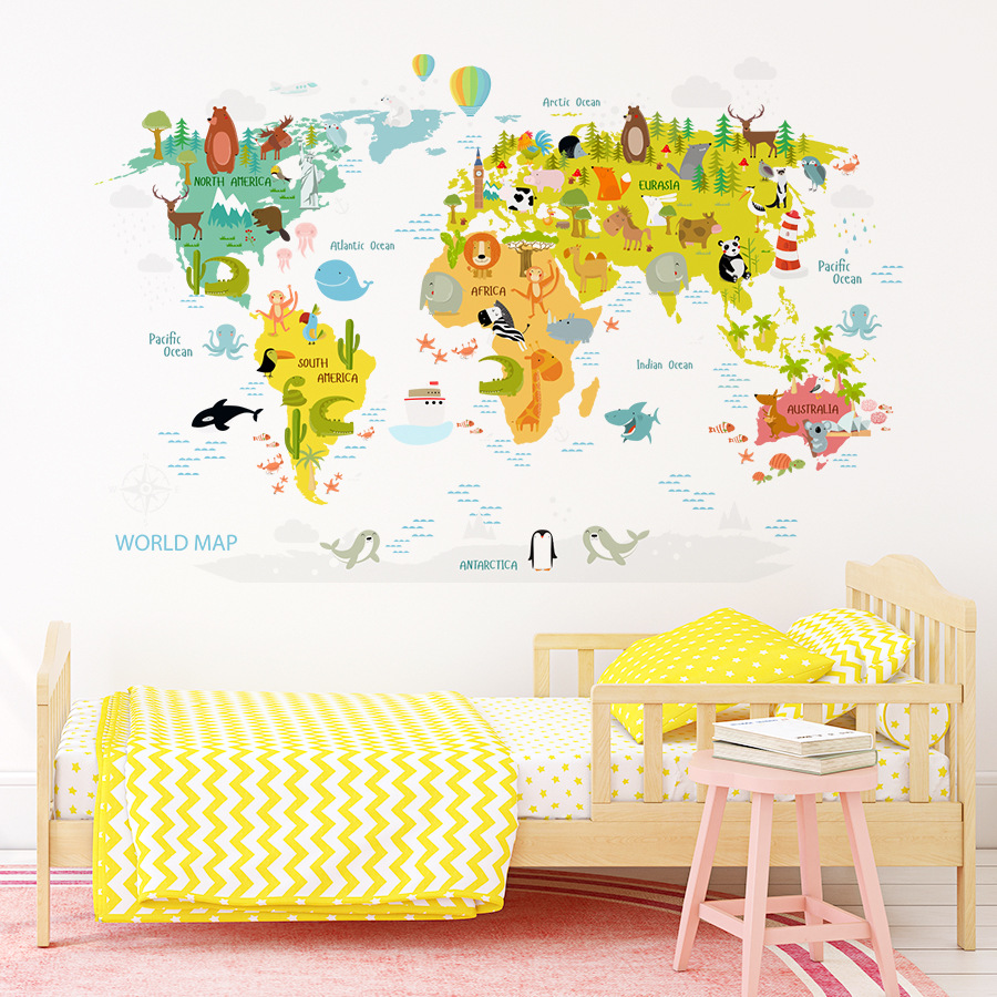 만화 귀여운 작은 동물 세계지도 자기 접착 벽 스티커 Ins 어린이 방 침실 장식 스티커 BR3104H