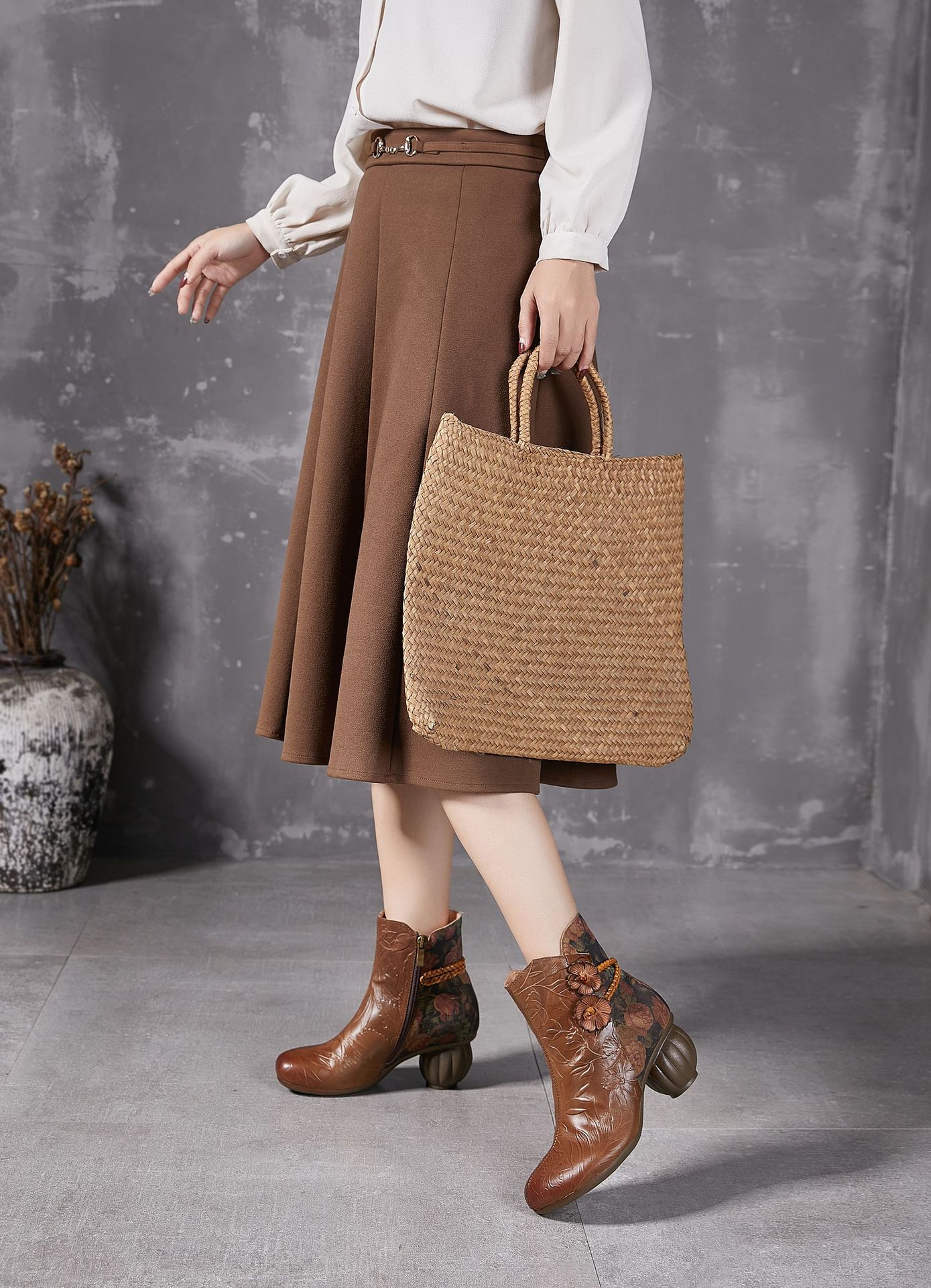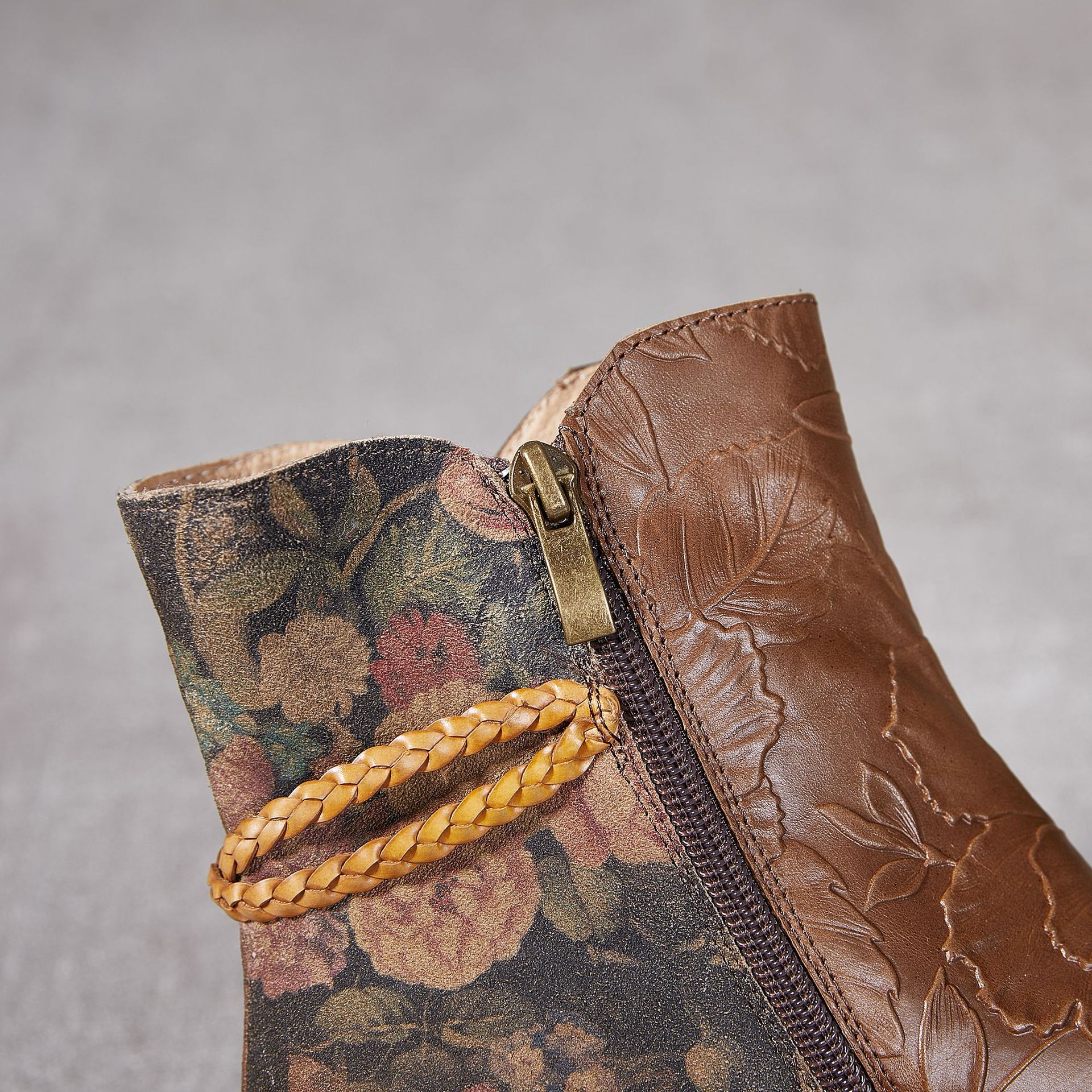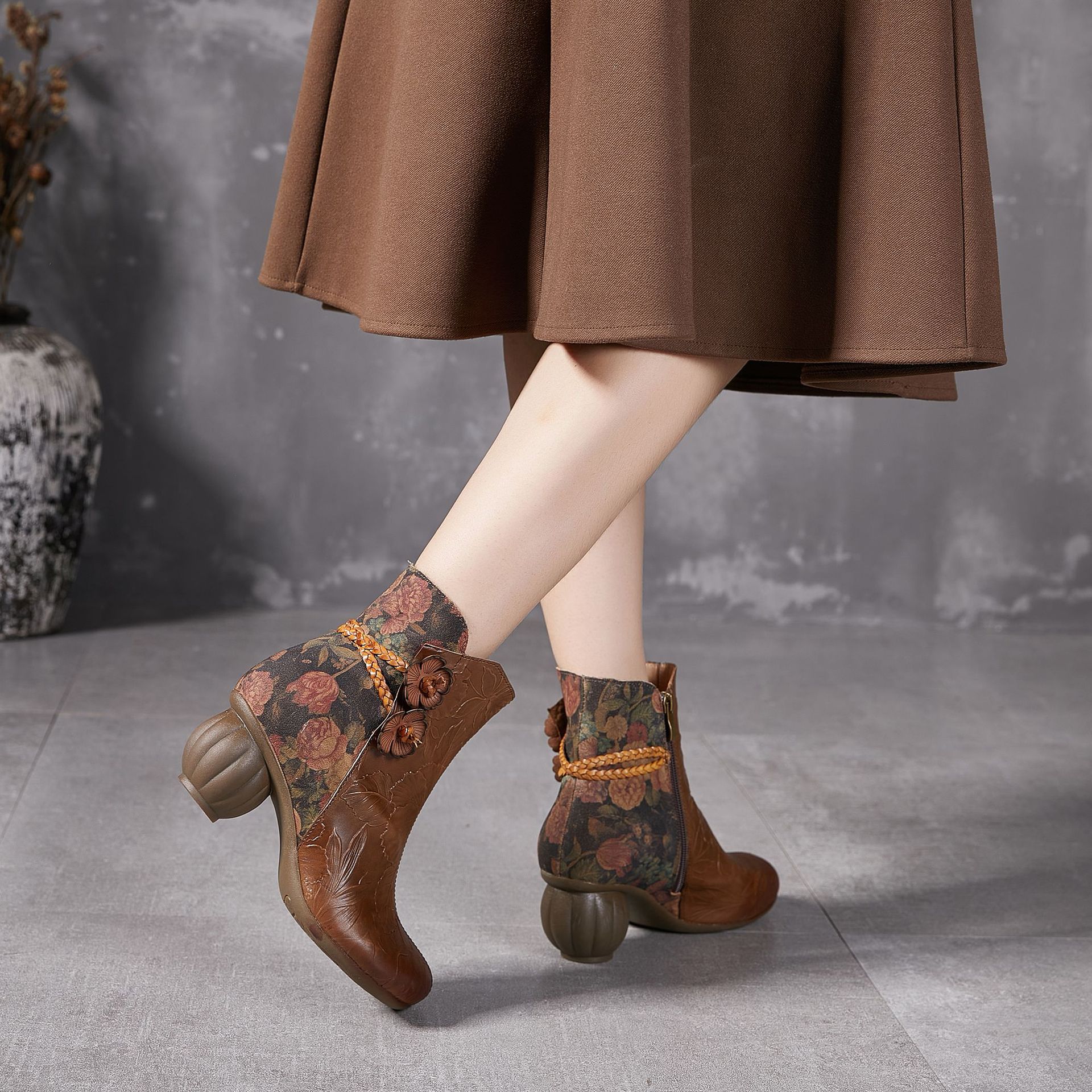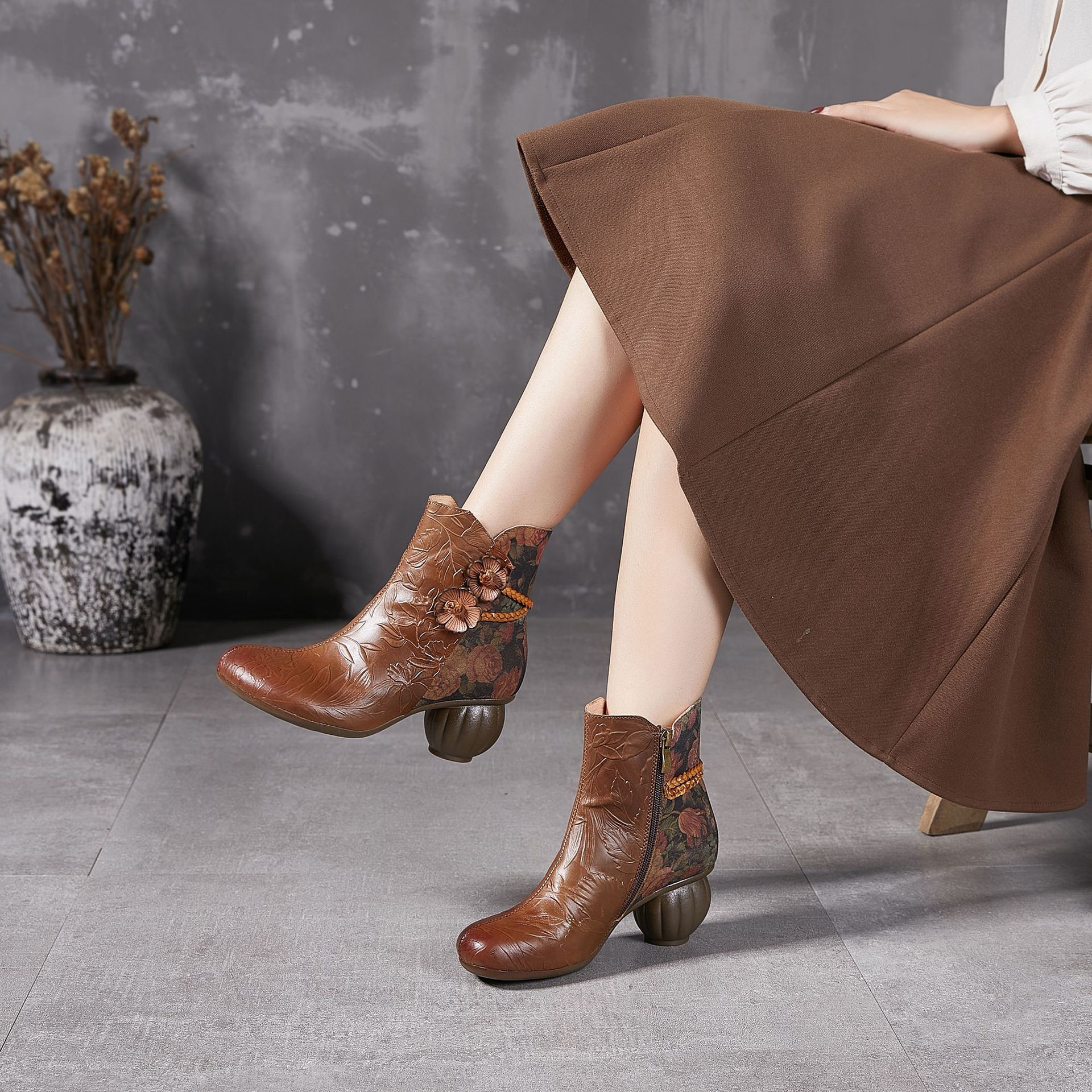 2024 새로운 Cowhide 꽃 국가 스타일 하이힐 여성 부츠 국가 스타일 올 매치 레트로 여성 신발 공장 Daifa