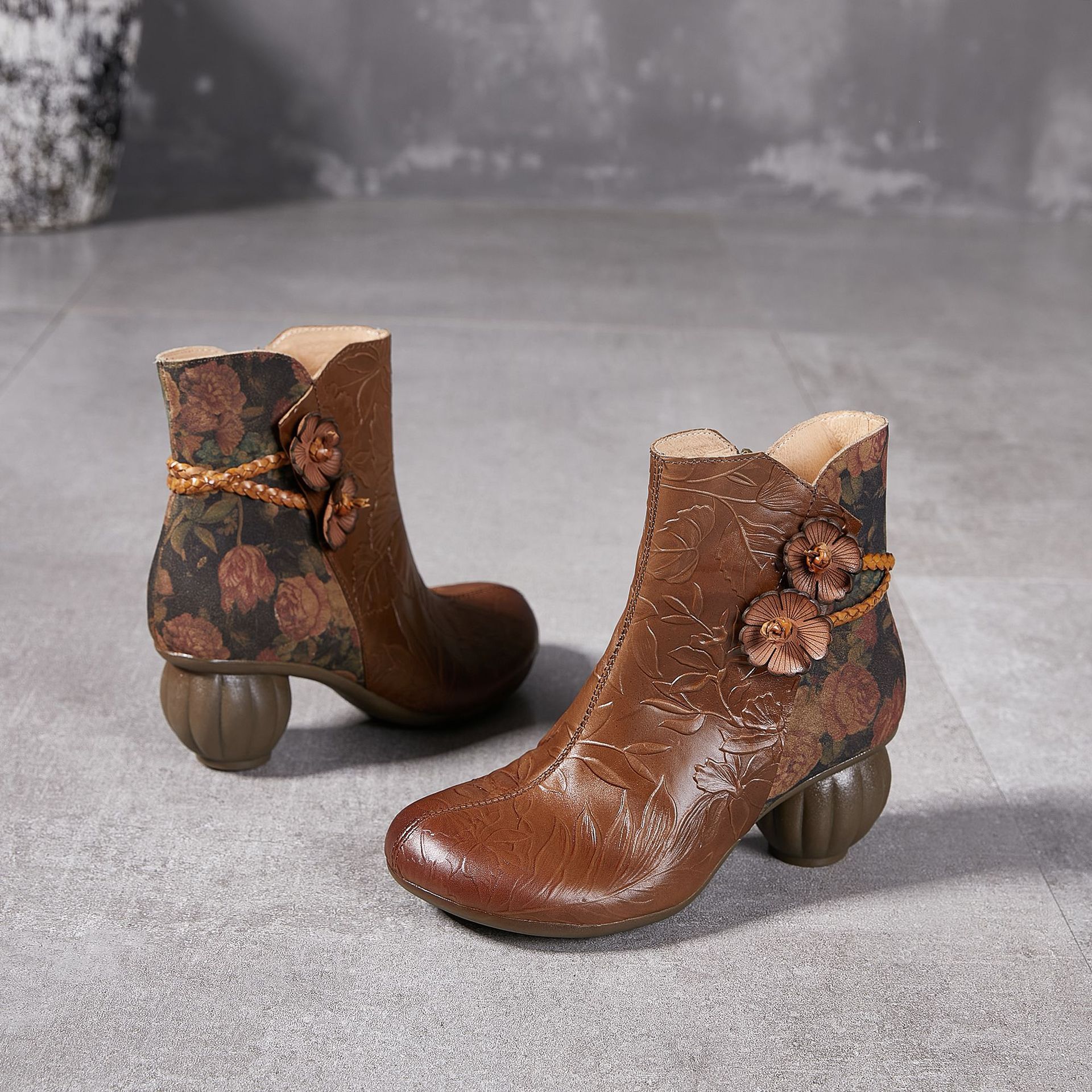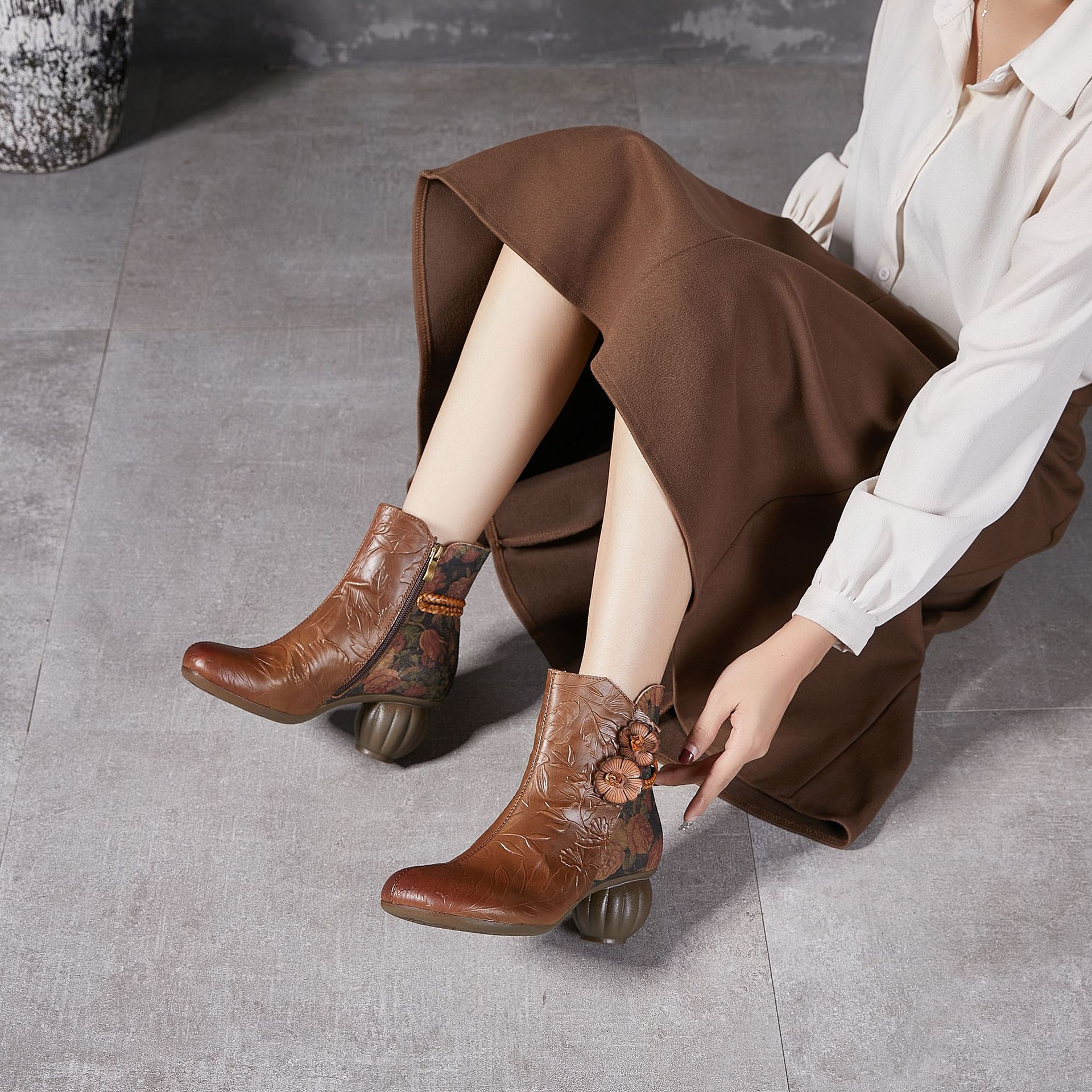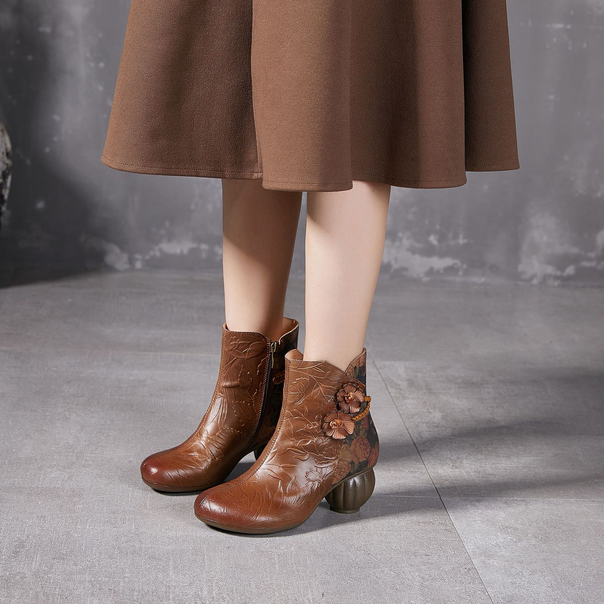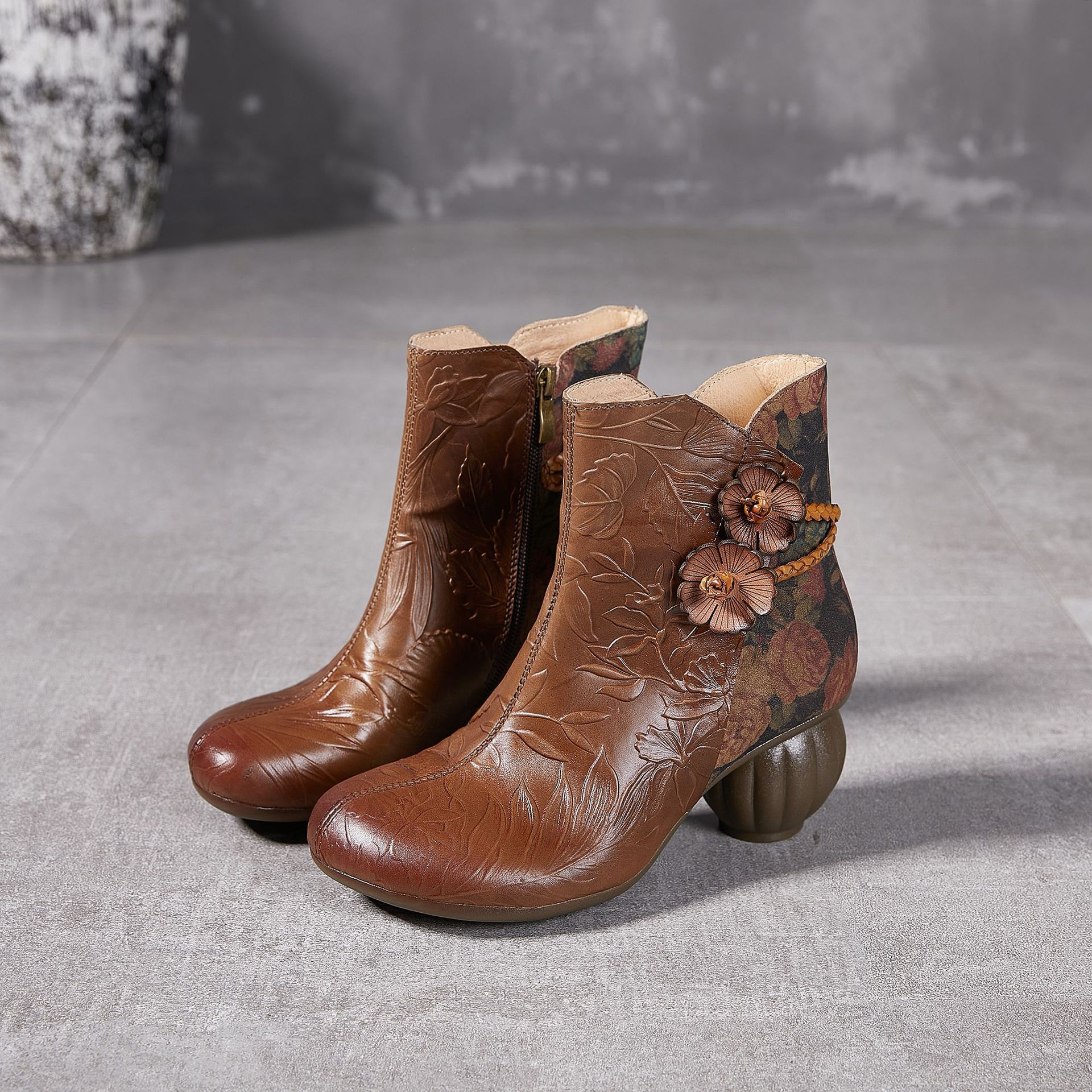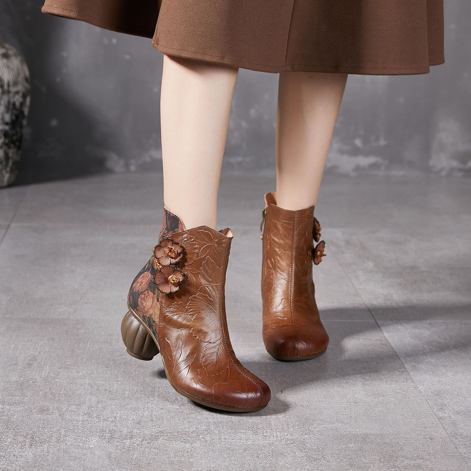 2024 새로운 Cowhide 꽃 국가 스타일 하이힐 여성 부츠 국가 스타일 올 매치 레트로 여성 신발 공장 Daifa스토어 가기