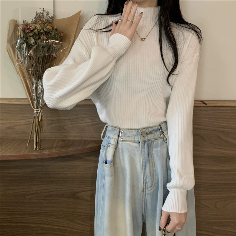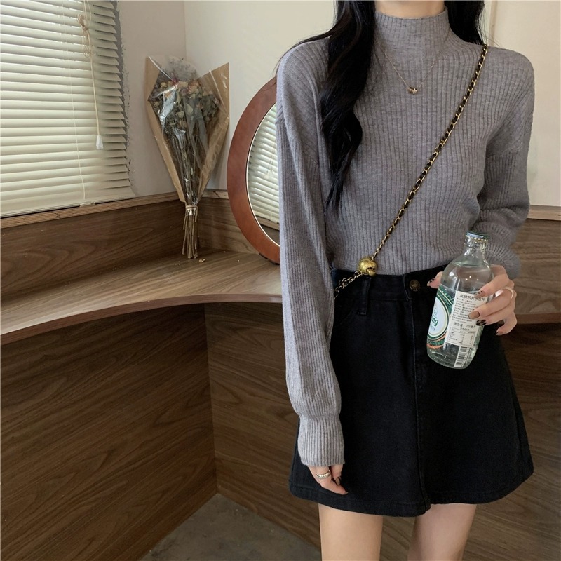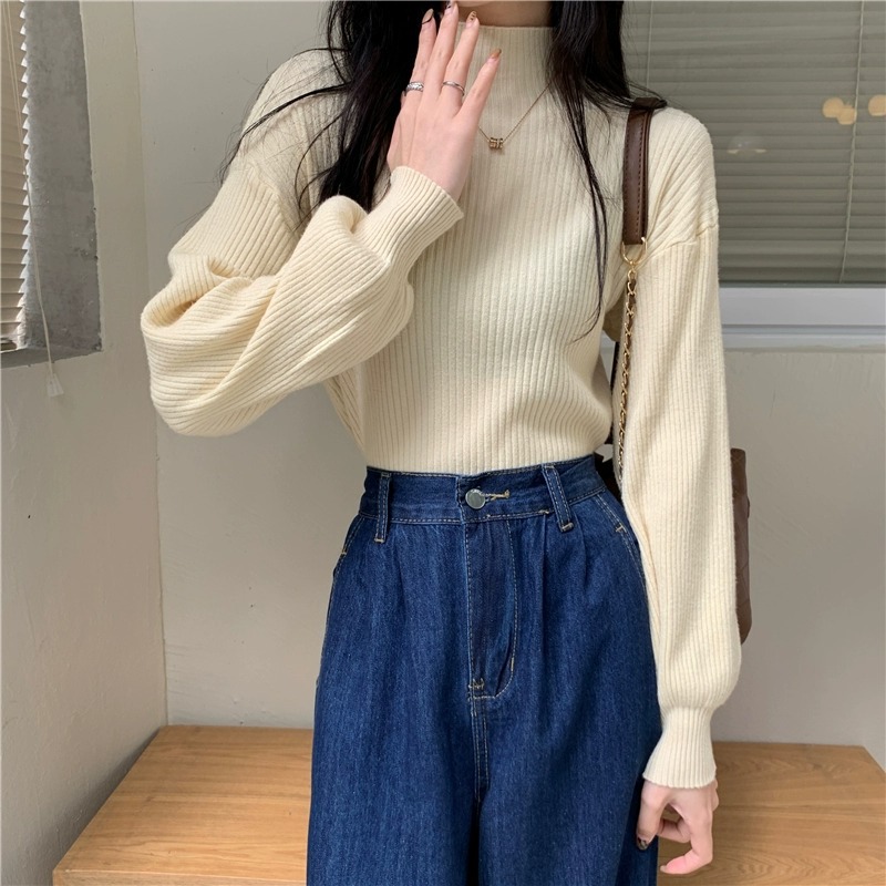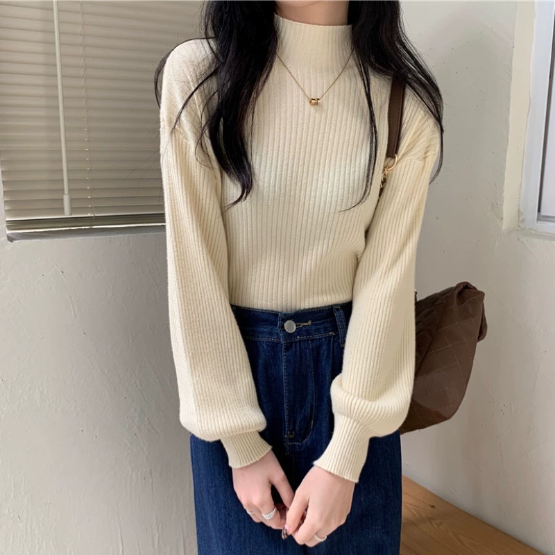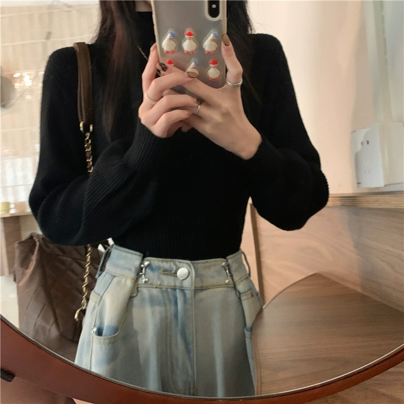 2025 봄 하프 터틀넥 블랙 니트 스웨터 여성용 부드럽고 심플한 탑 핏 스트라이프 랜턴 소매 한국 스타일 베이스 셔츠스토어 가기