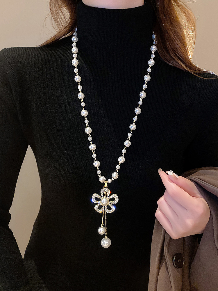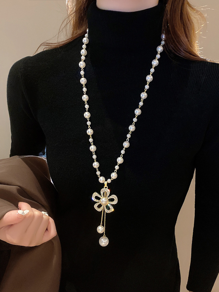 플래시 다이아몬드 꽃 진주 긴 스웨터 체인 여성의 2024 새로운 빛 럭셔리 하이 엔드 목걸이 틈새 올 매치 액세서리스토어 가기
