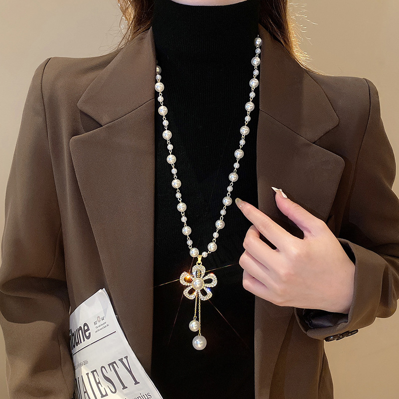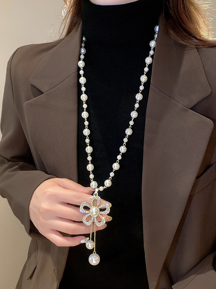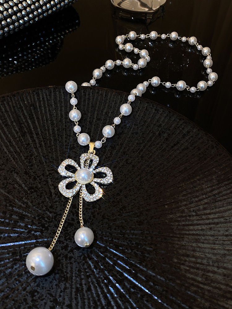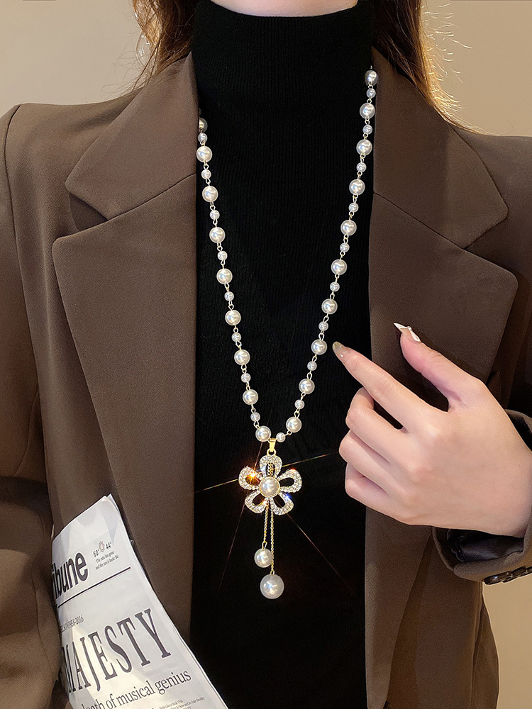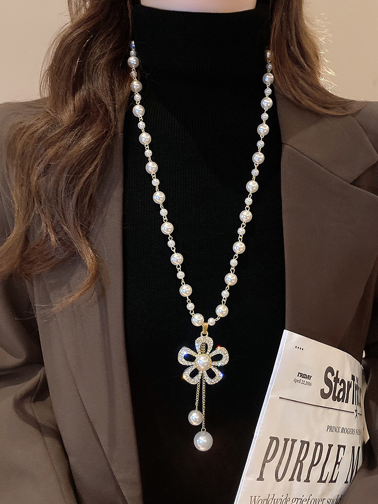 플래시 다이아몬드 꽃 진주 긴 스웨터 체인 여성의 2024 새로운 빛 럭셔리 하이 엔드 목걸이 틈새 올 매치 액세서리