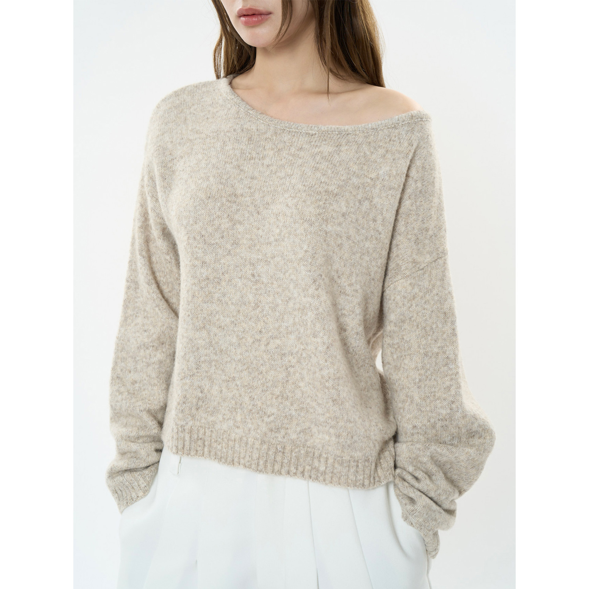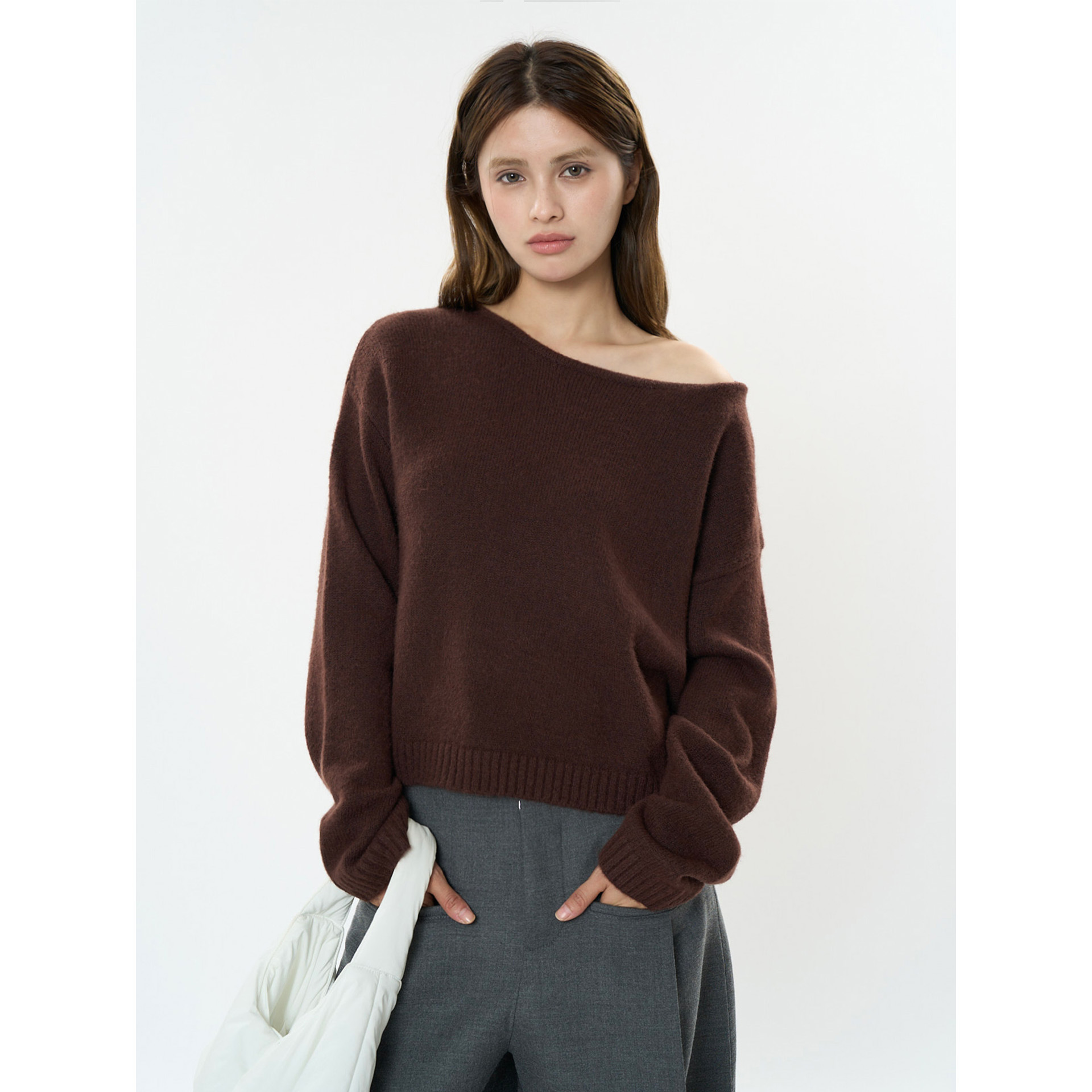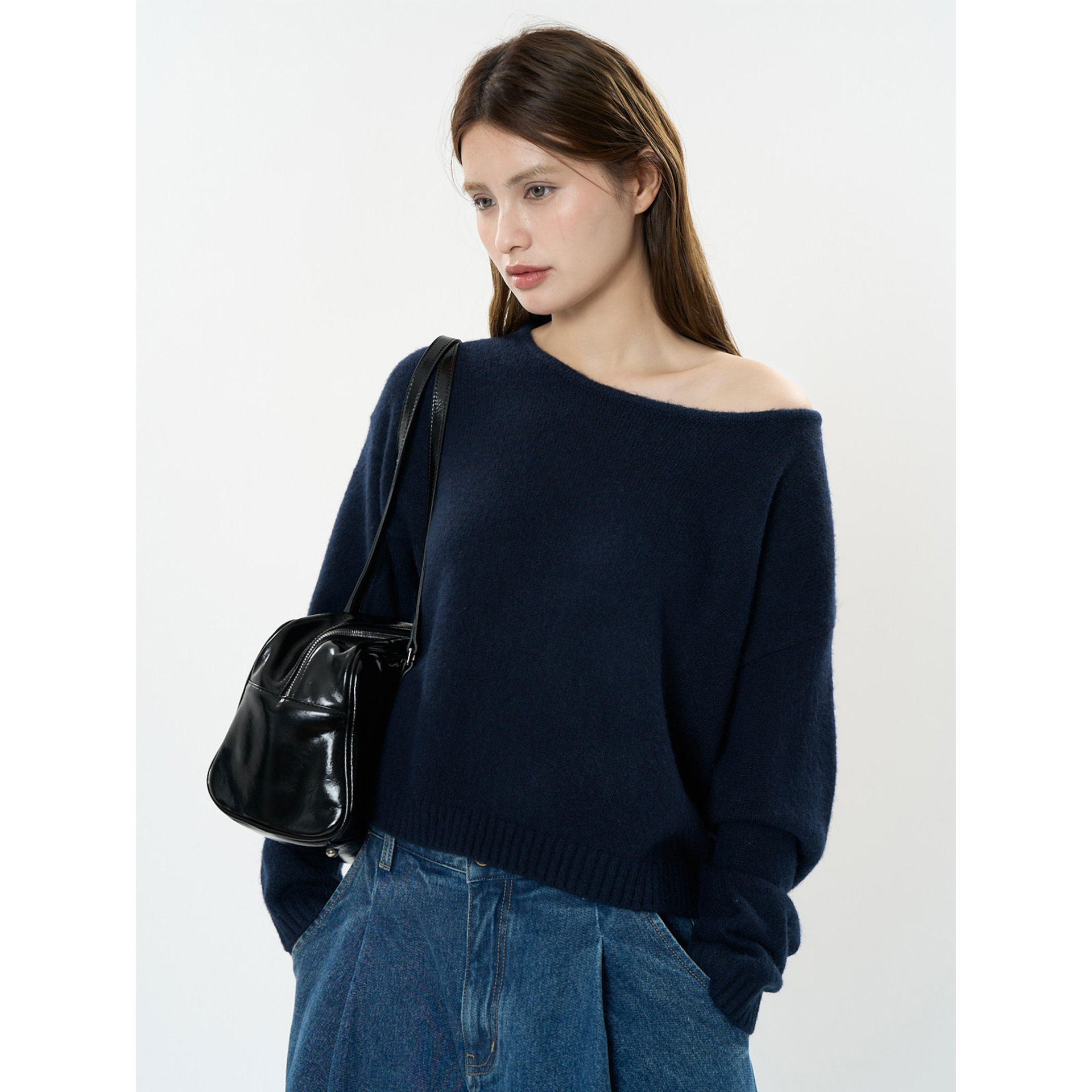 루 푸 겨울 새로운 프랑스 스타일 부드러운 스타일 양모 슬란 트 어깨 크루 넥 스웨터 소프트 왁스 탄성 우아한 슬림 룩 탑 여성스토어 가기