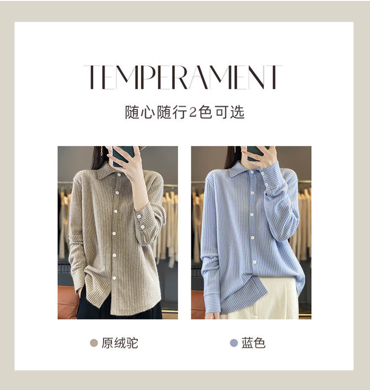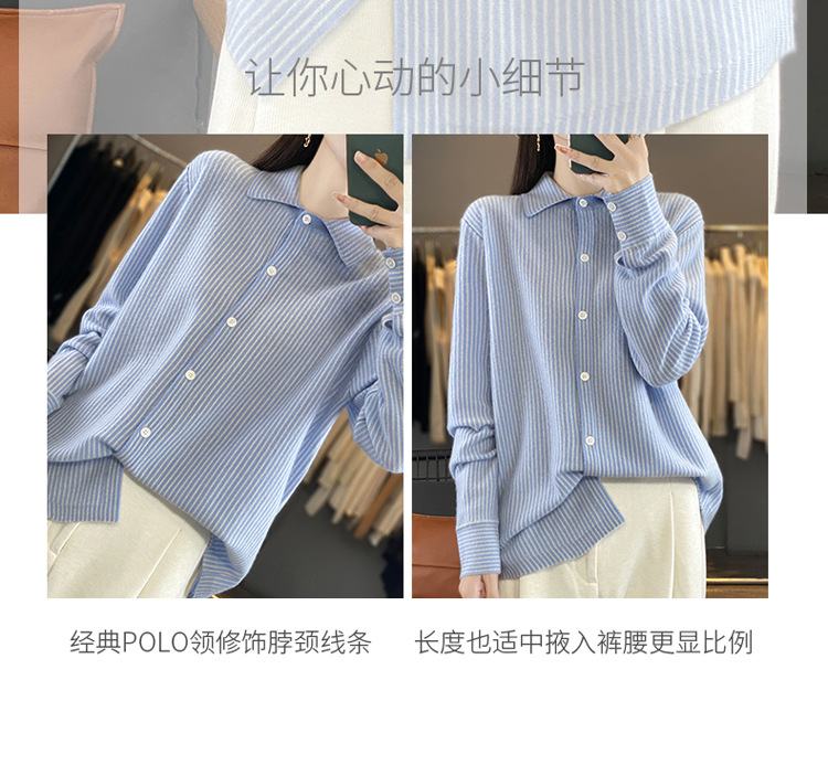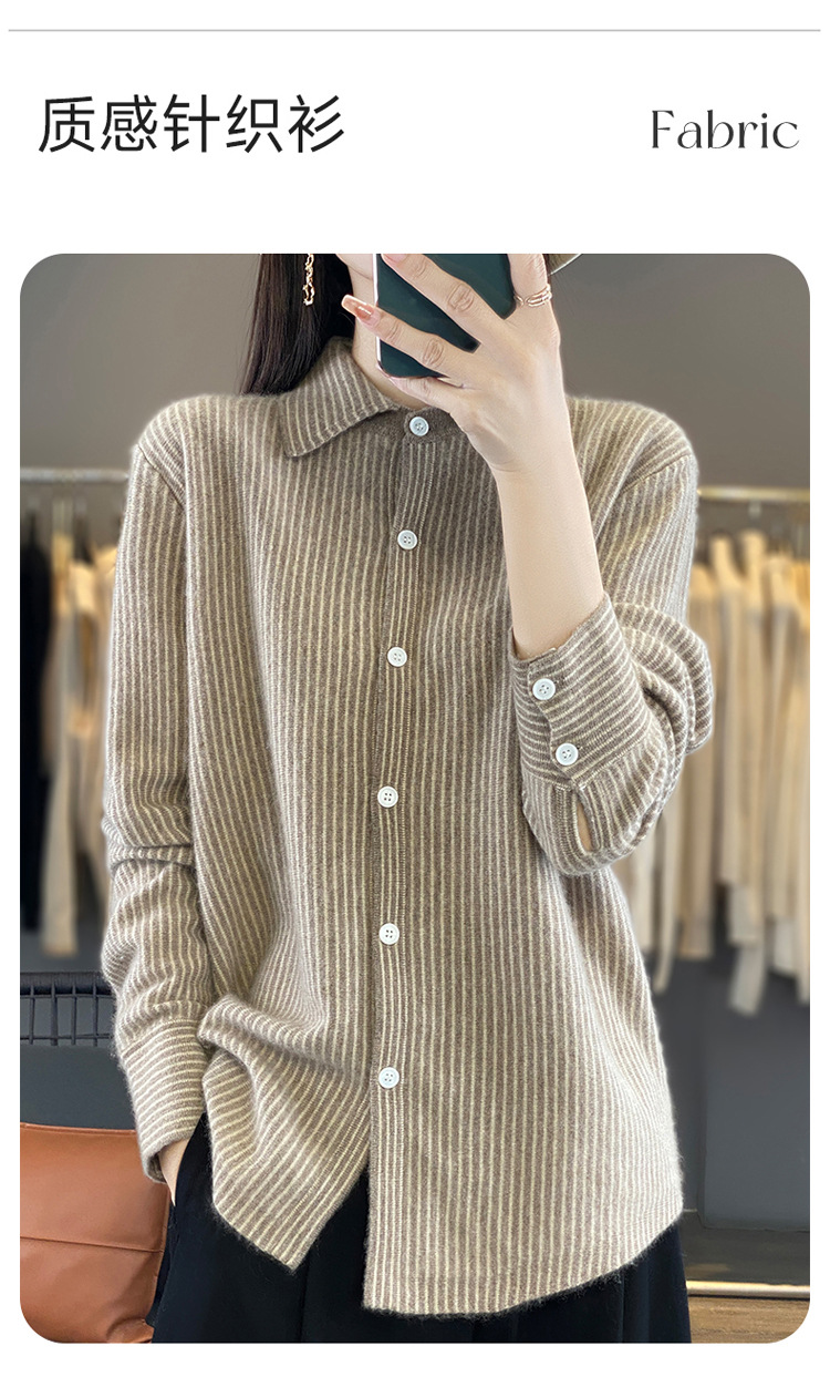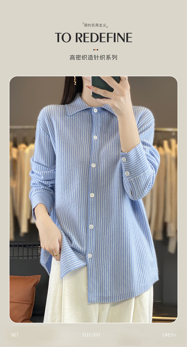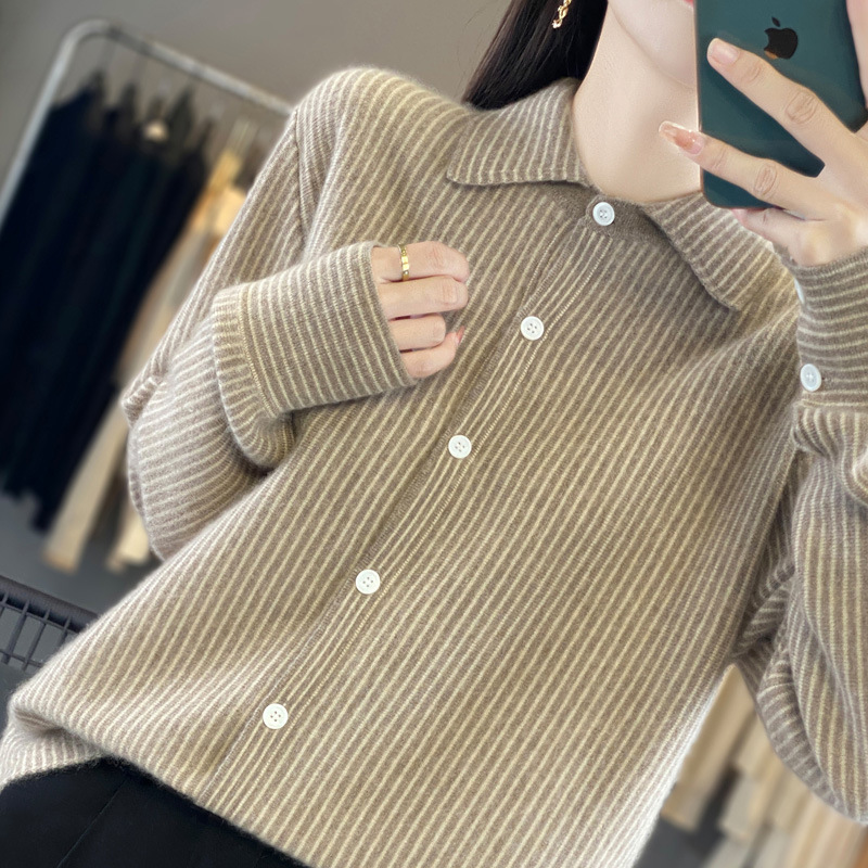 가을과 겨울 새로운 양모 카디건 여성용 폴로 칼라 한국 느슨한 줄무늬 셔츠 슬림 우아한베이스 스웨터