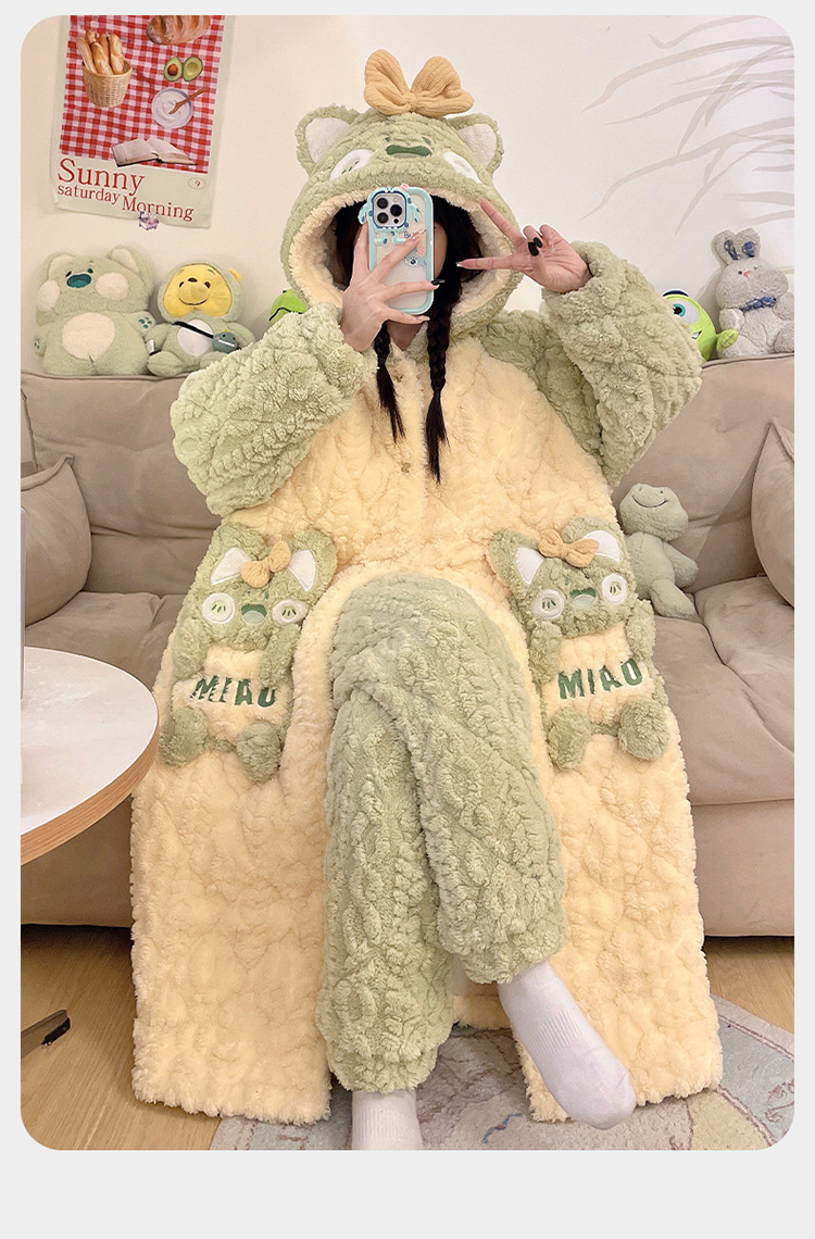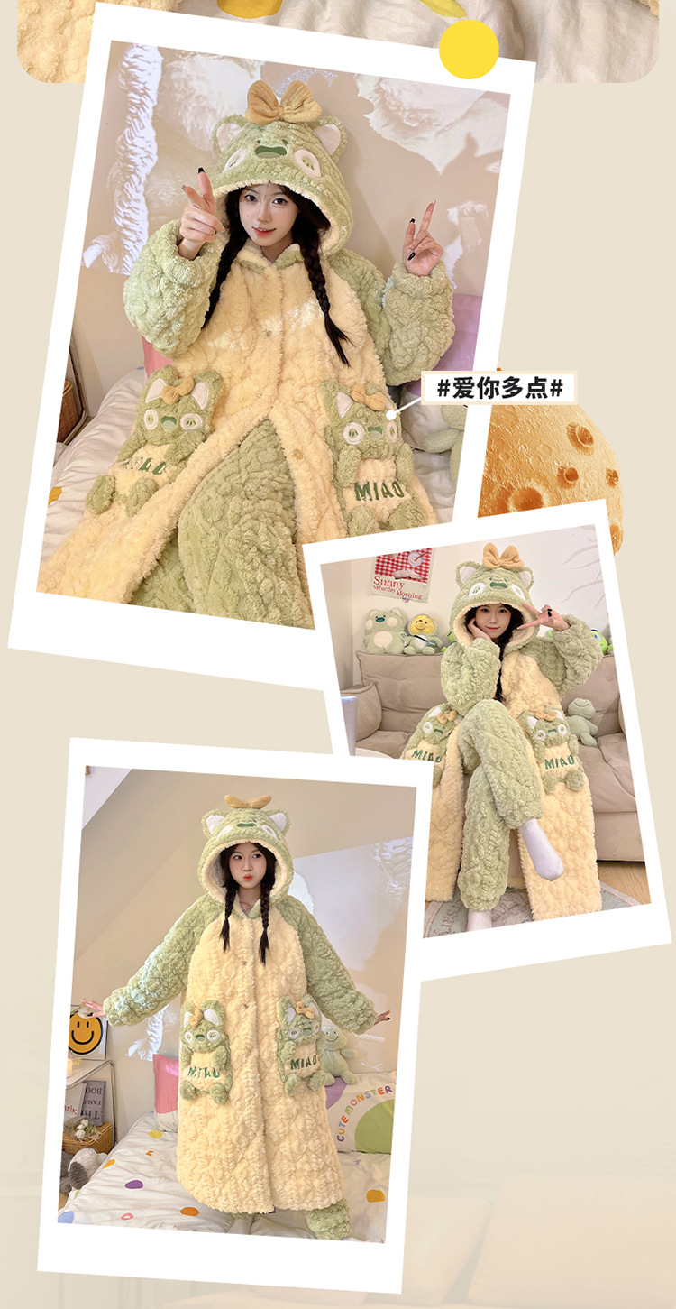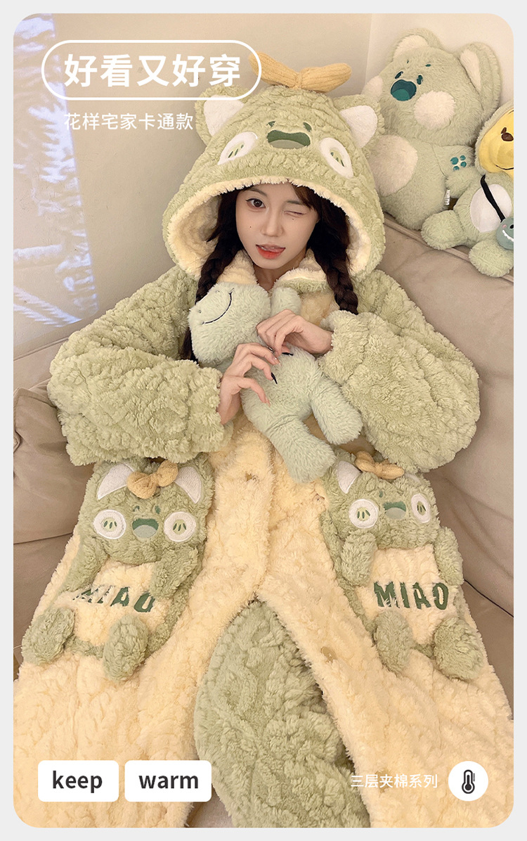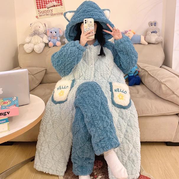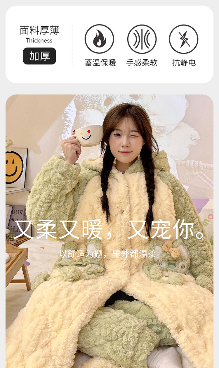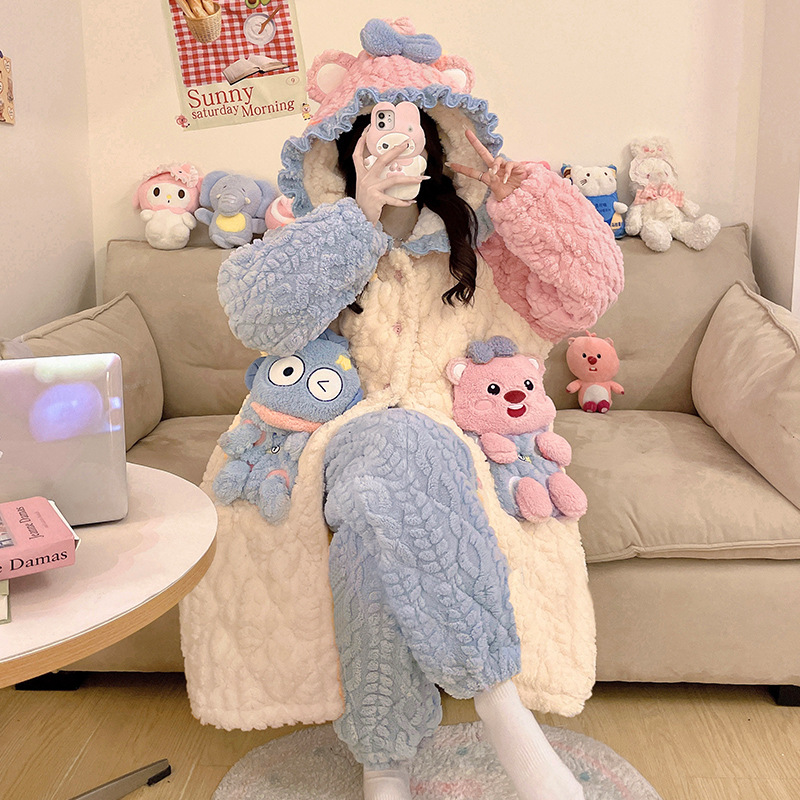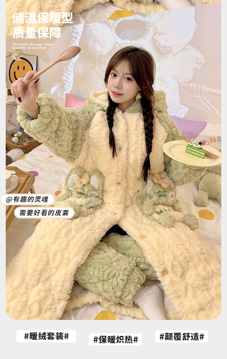 少女睡袍套装冬款加绒加厚初中生睡衣长款夹棉睡袍卡通保暖家居服