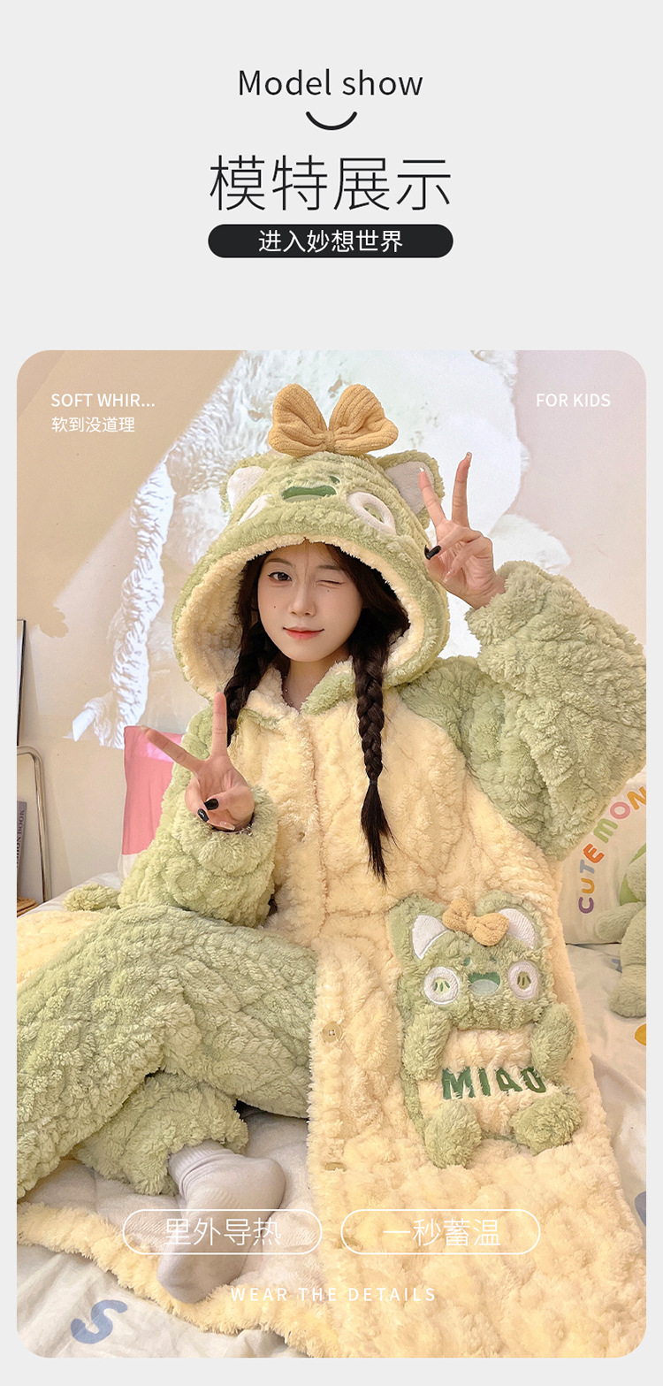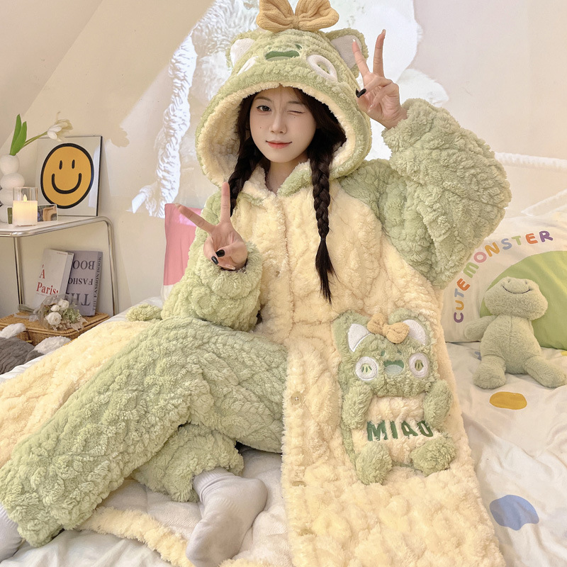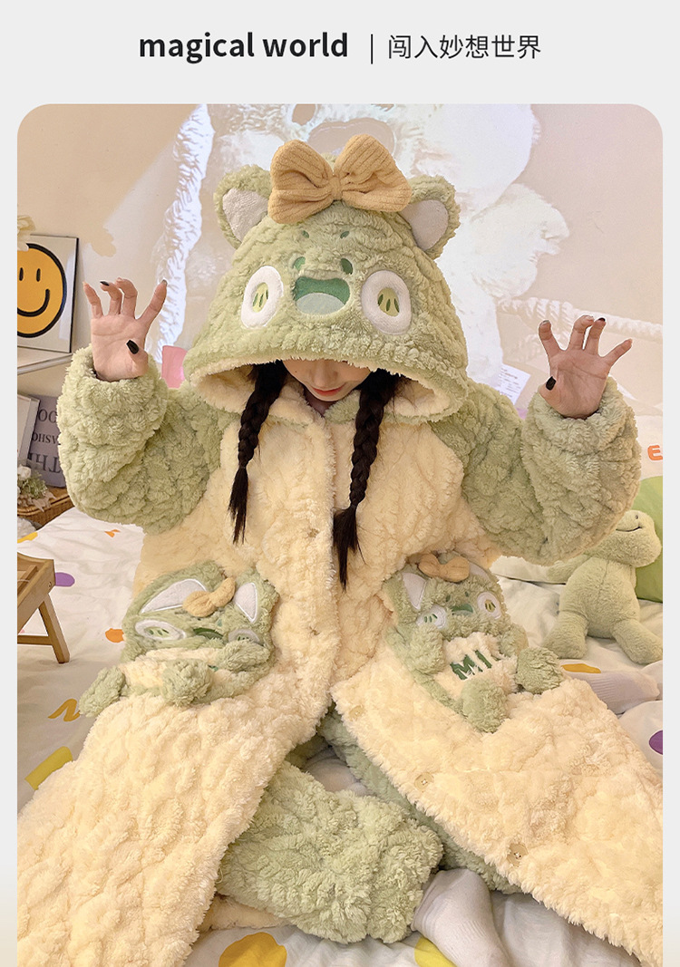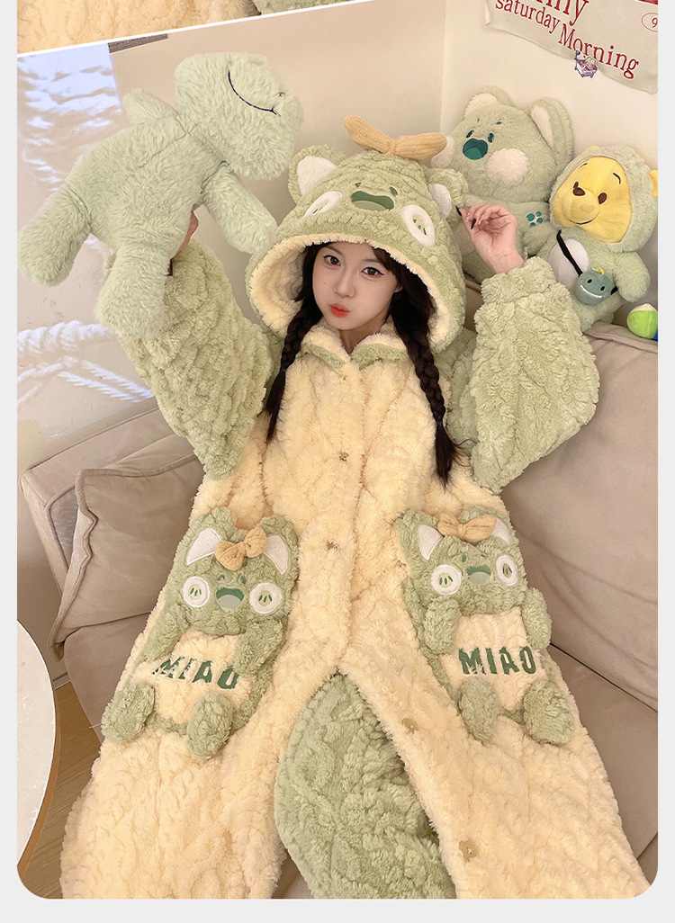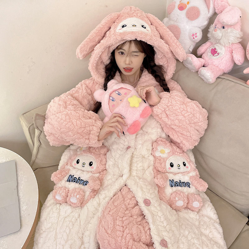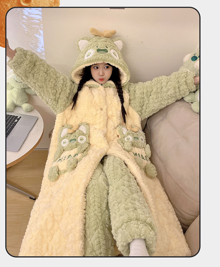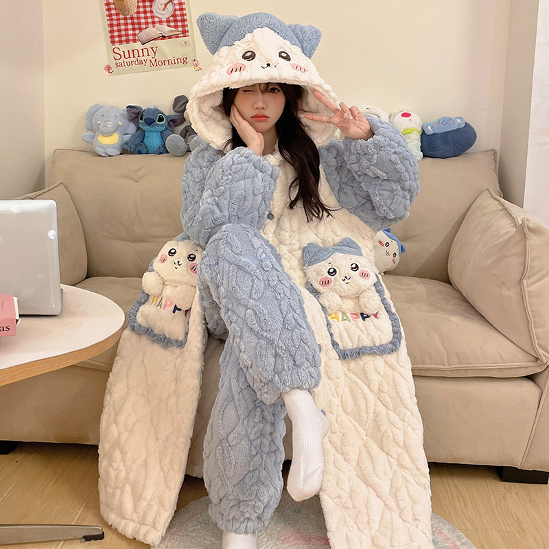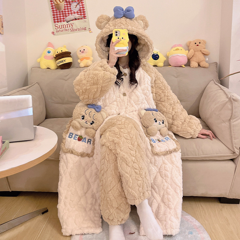 少女睡袍套装冬款加绒加厚初中生睡衣长款夹棉睡袍卡通保暖家居服