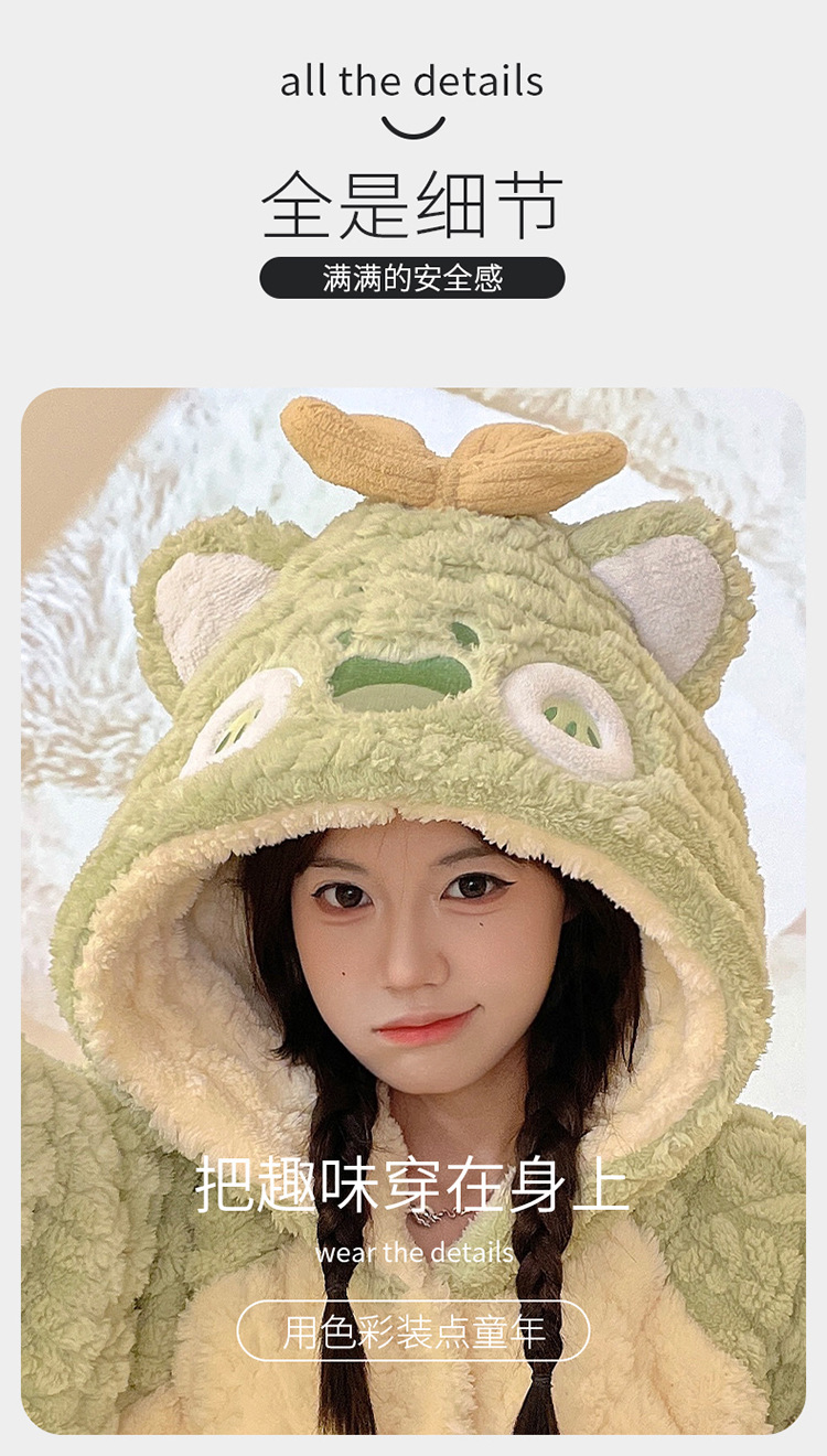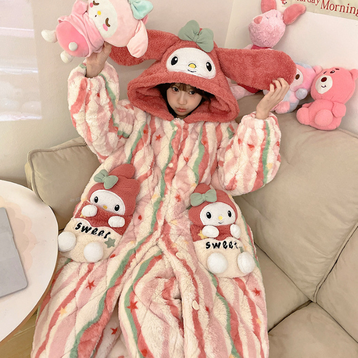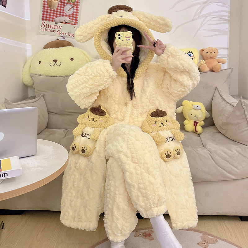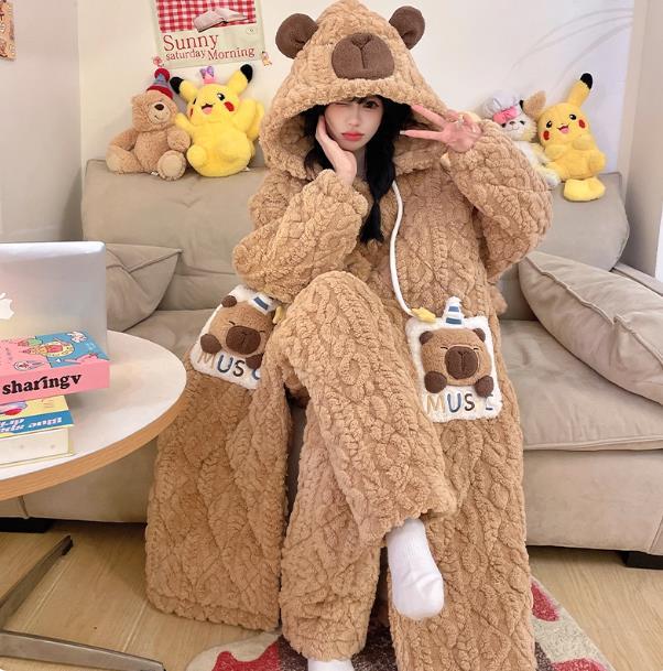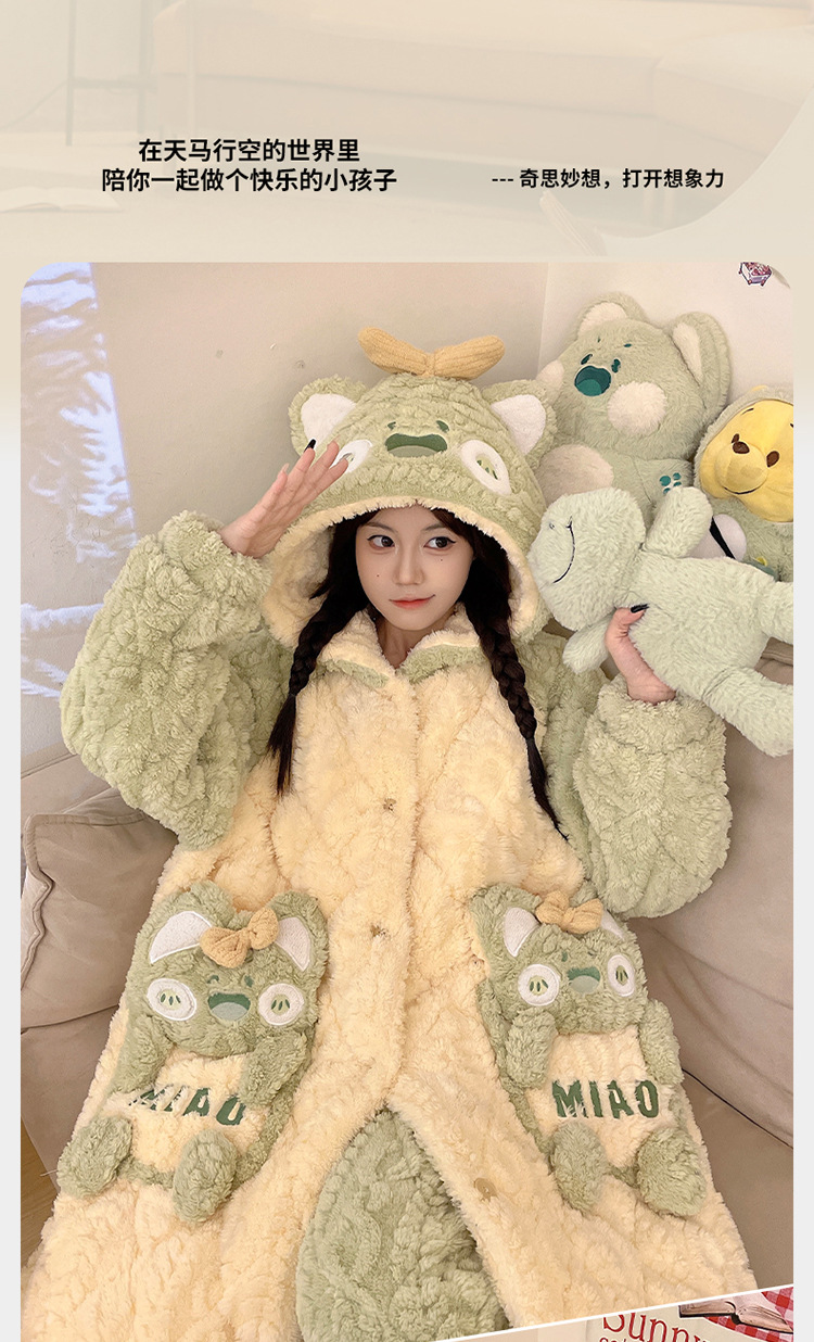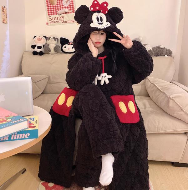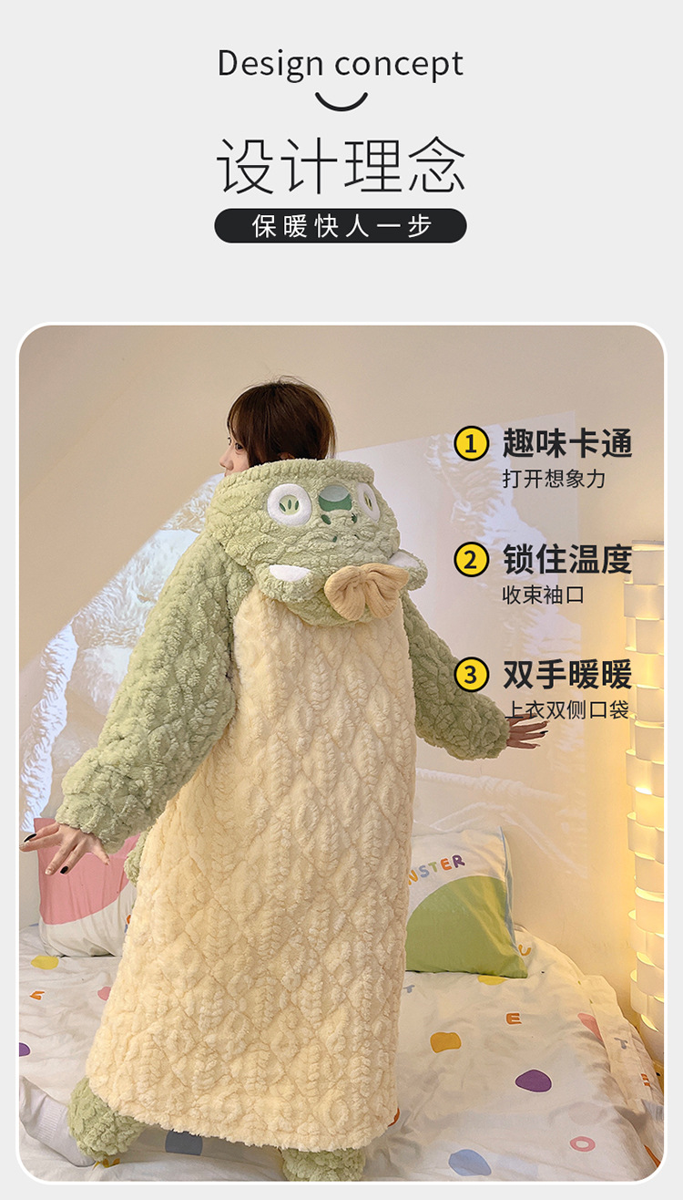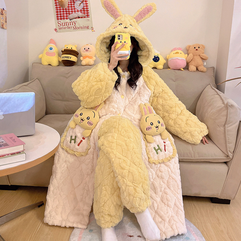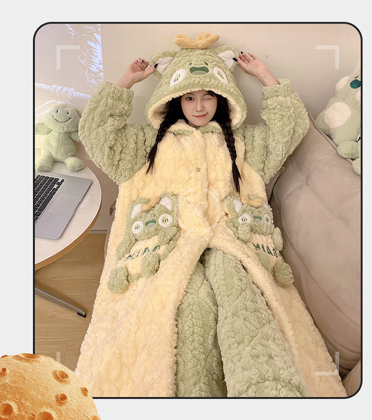 少女睡袍套装冬款加绒加厚初中生睡衣长款夹棉睡袍卡通保暖家居服