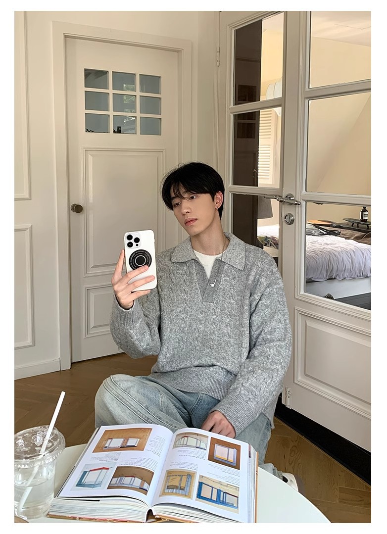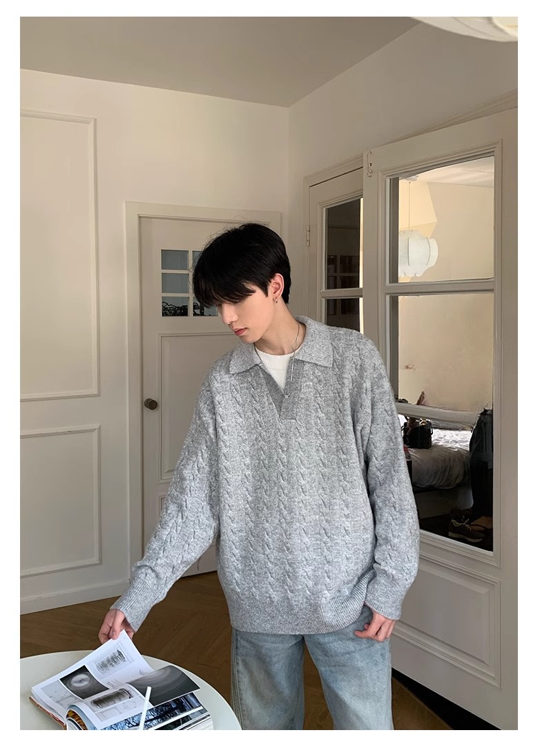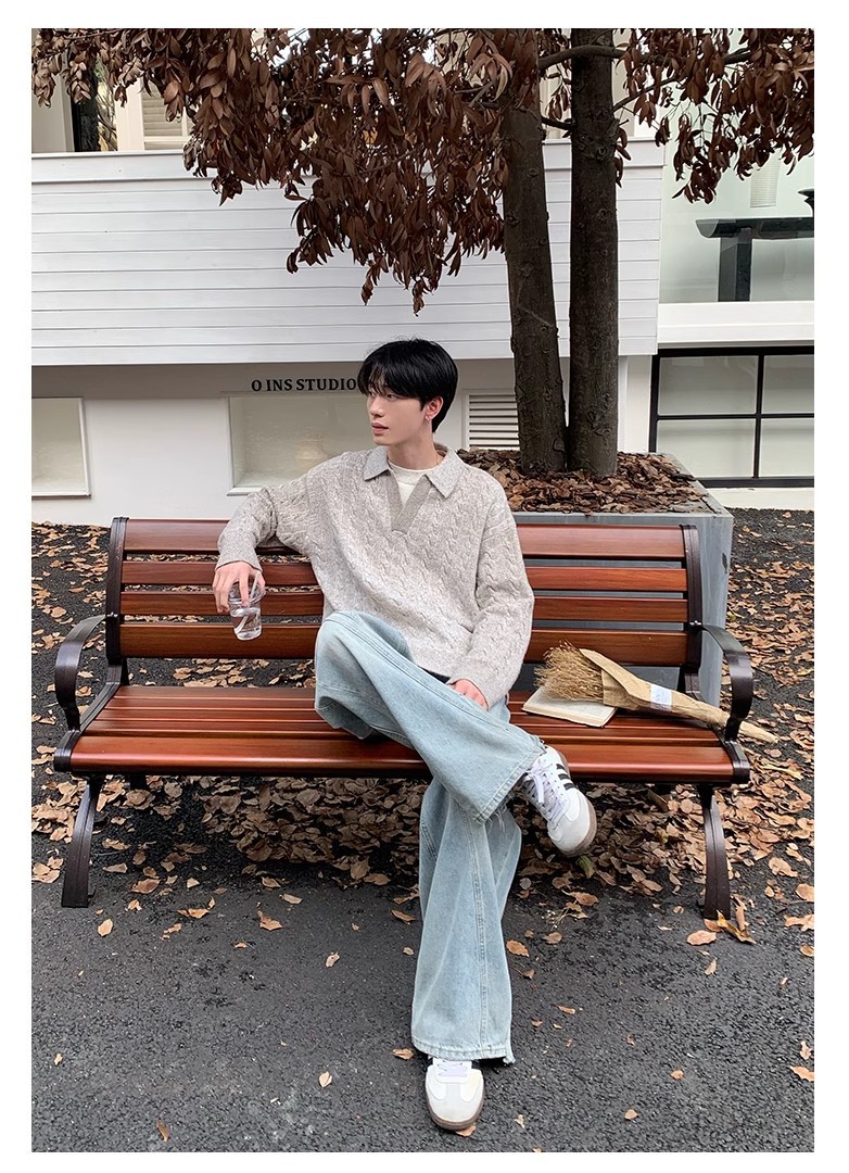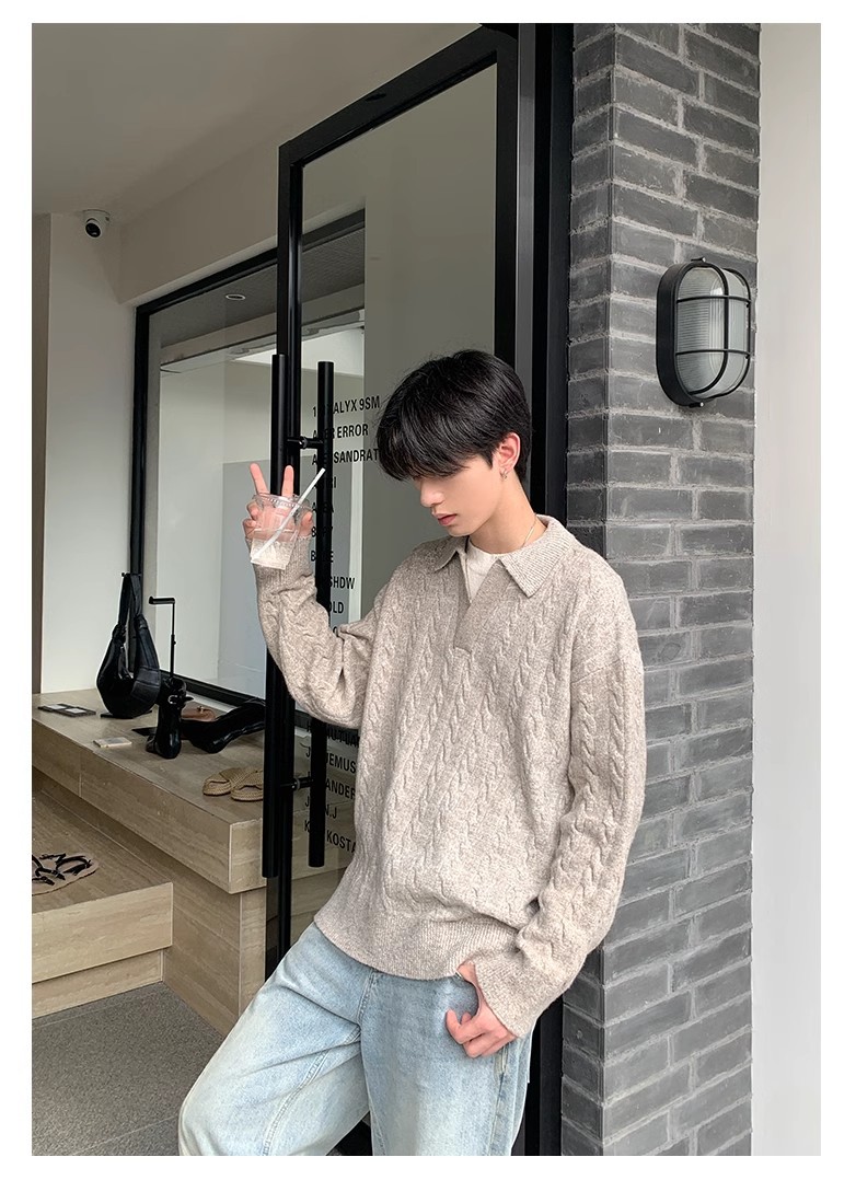 2024 레트로 게으른 레이스 패턴 V 넥 라펠 풀오버 스웨터 남성 루즈 스플 라이스 스웨터 재킷 트렌드스토어 가기