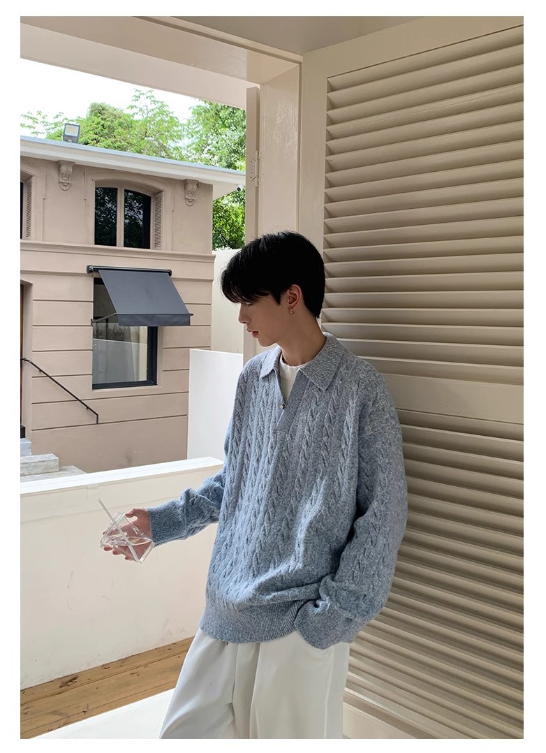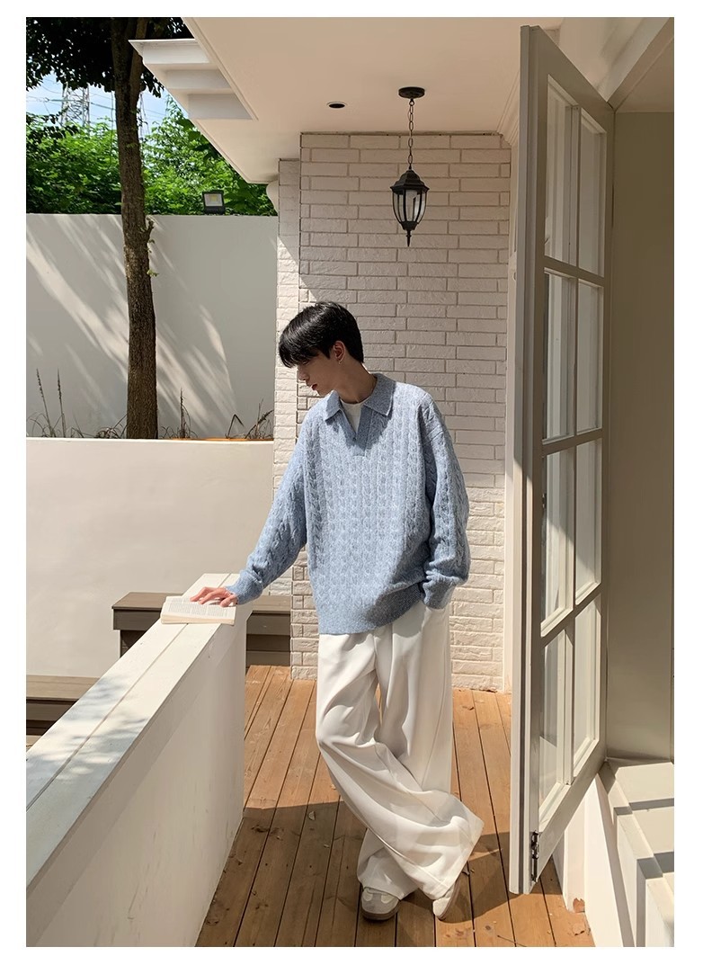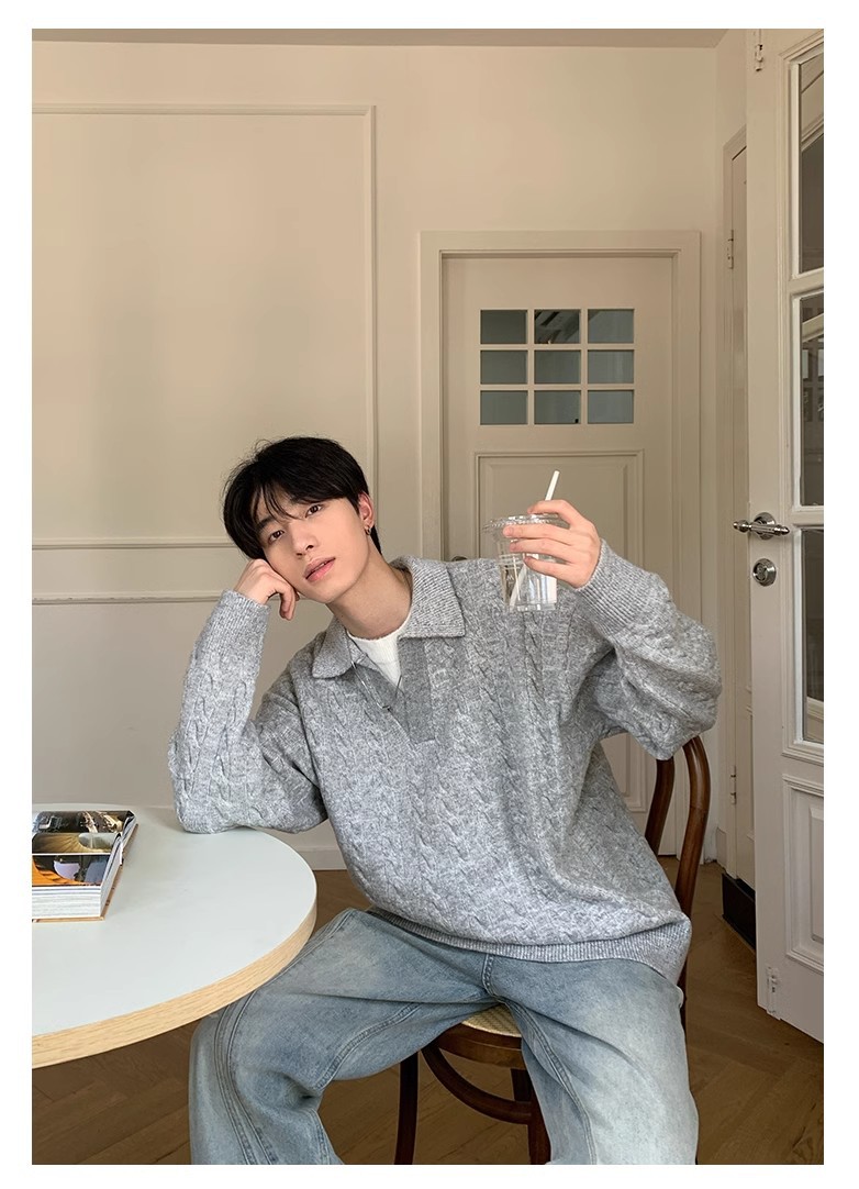 2024 레트로 게으른 레이스 패턴 V 넥 라펠 풀오버 스웨터 남성 루즈 스플 라이스 스웨터 재킷 트렌드