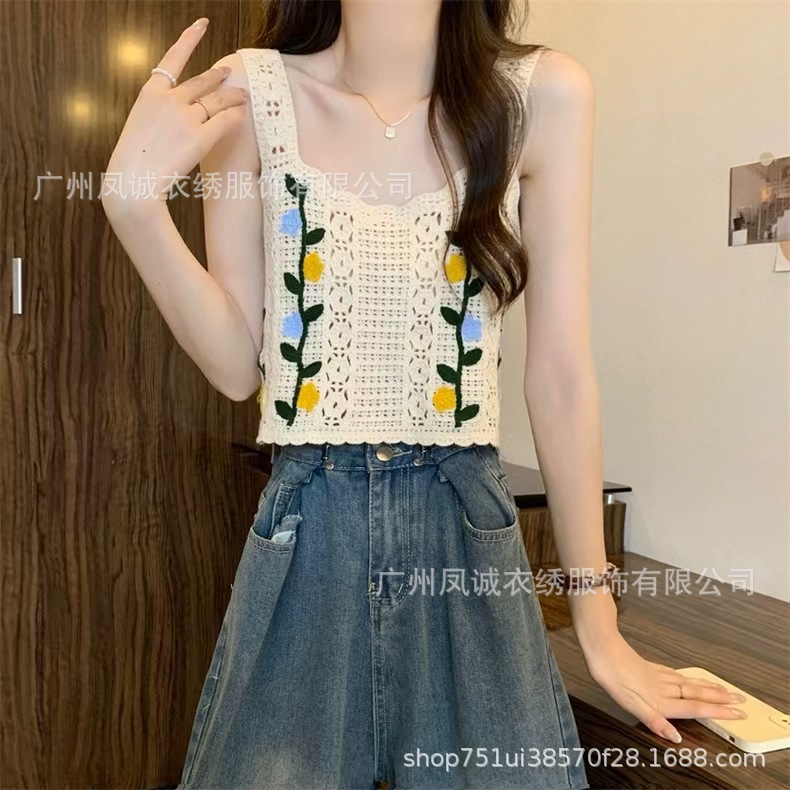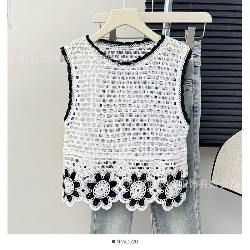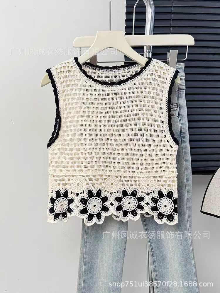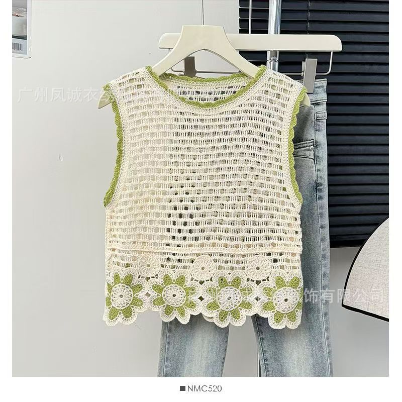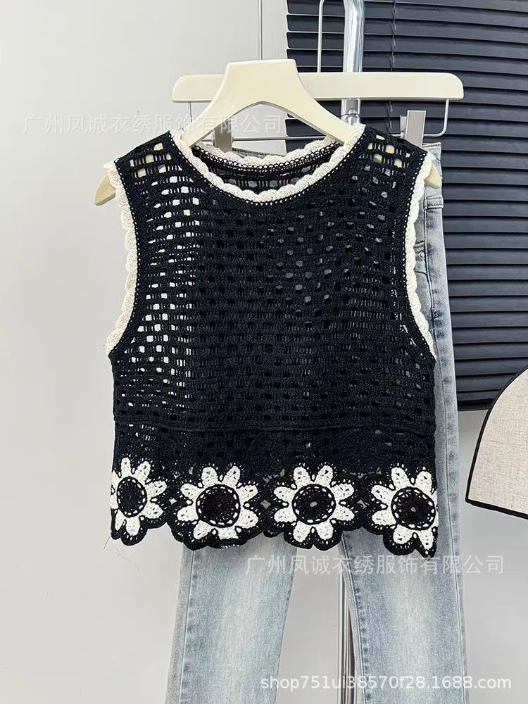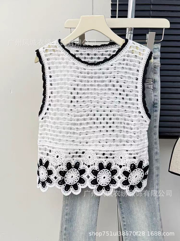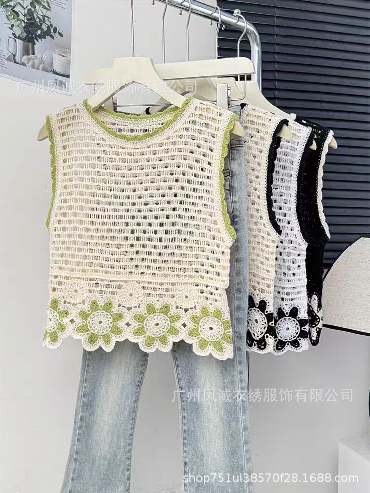 민소매 니트 조끼 봄과 여름 외부 착용 할로우 얇은 3 차원 꽃 보헤미안 민족 스타일 여성용 쇼트 탑스토어 가기