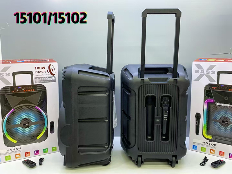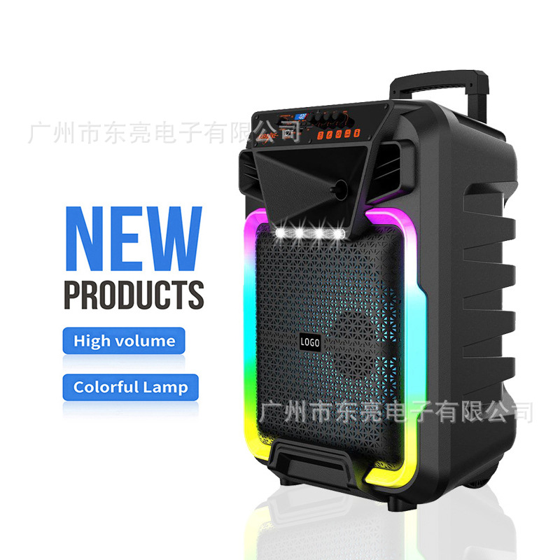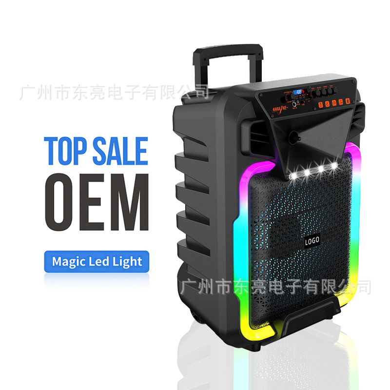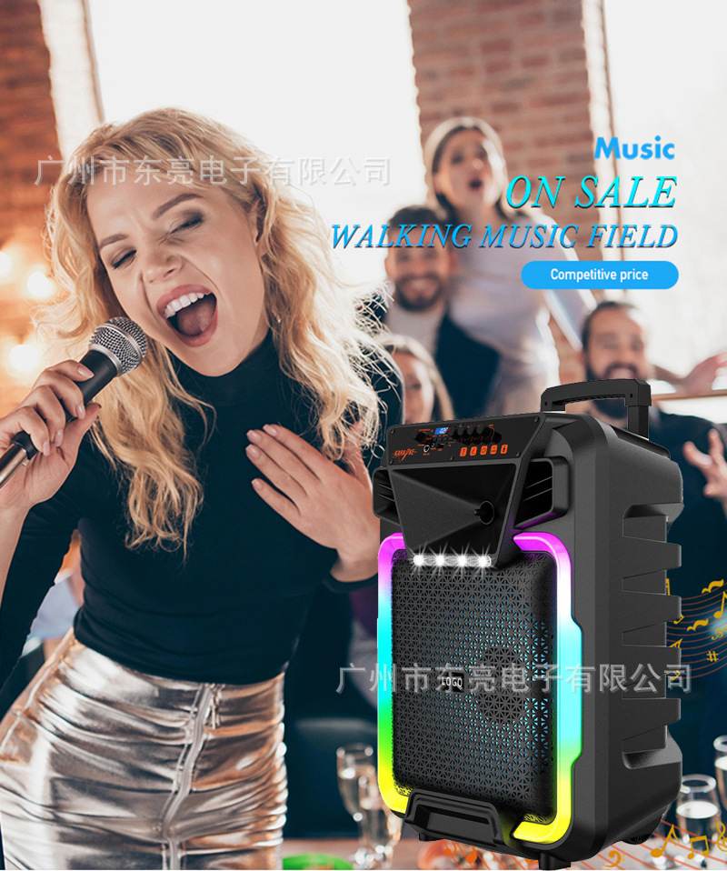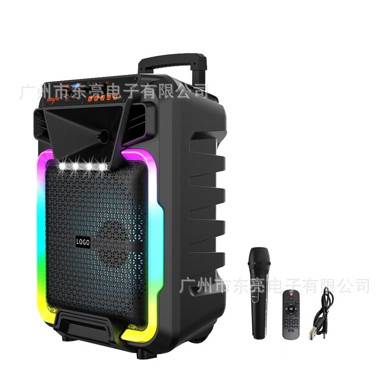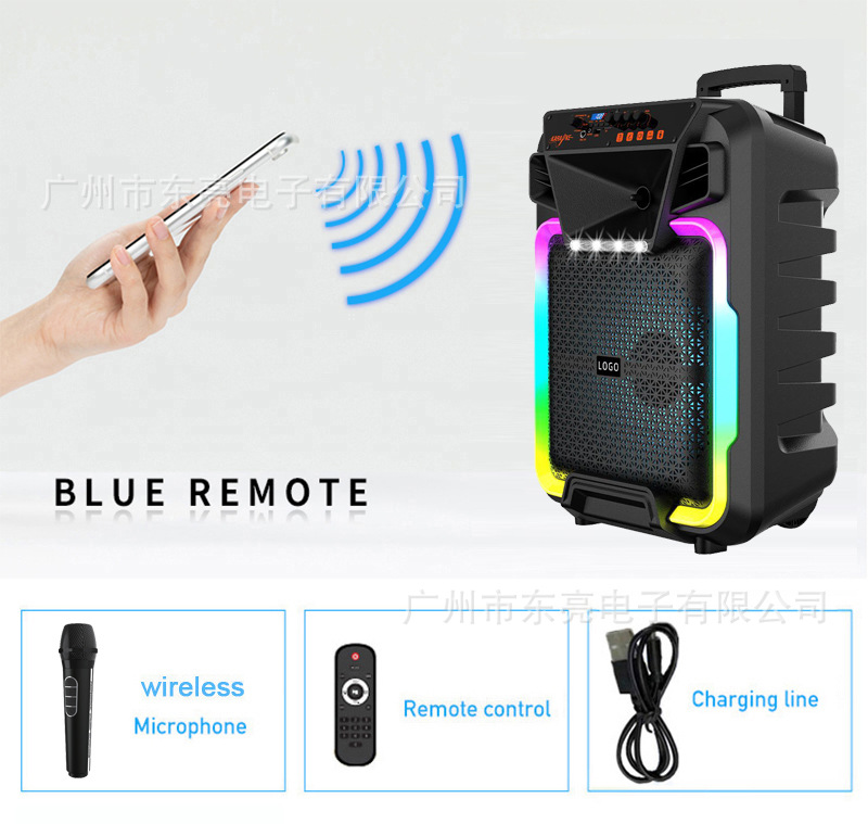 Supports USB/TF/FM/AUX/Bluetooth/TWS, private rechargeable wireless microphone with microphone function. Equipped with remote control function. Knob master volume control, with flame light, with pull rod wheels