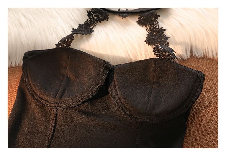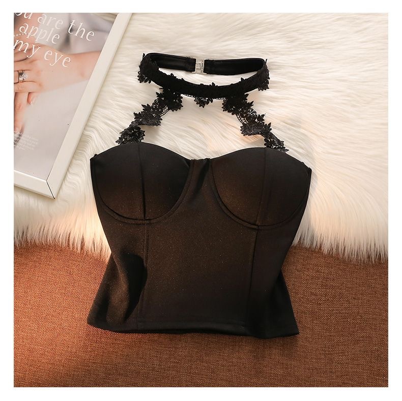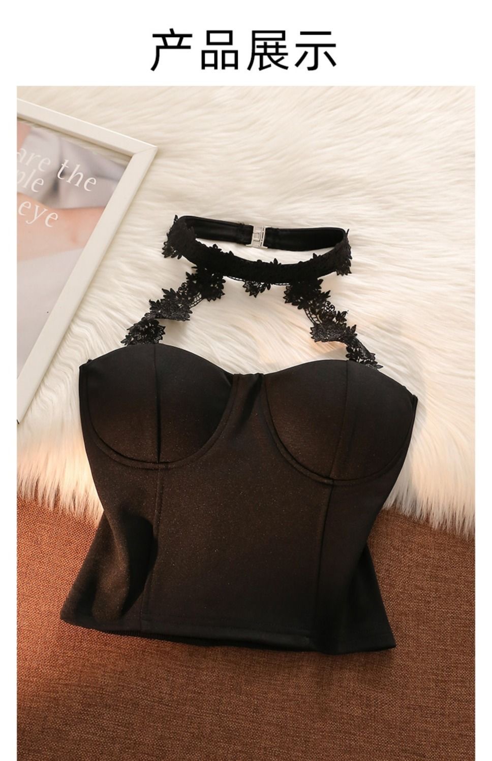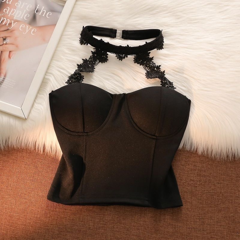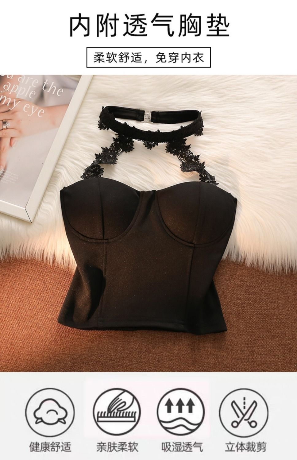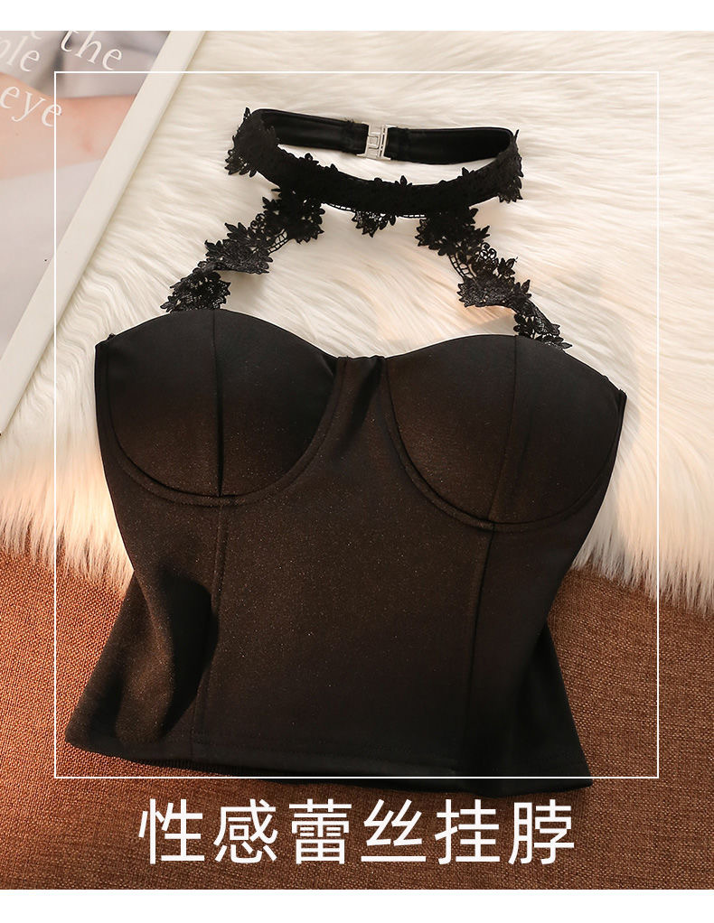 섹시한 스파이스 소녀 조끼 가슴 패드 블랙 레이스 넥 탑 슬림 핏 외부 착용 짧은 슬링 레이스 베이스