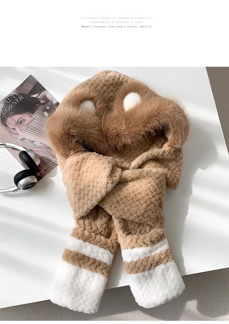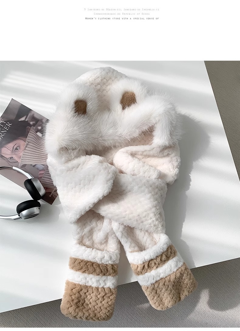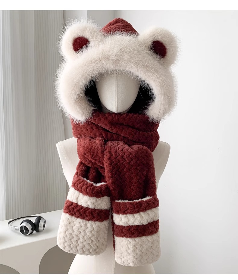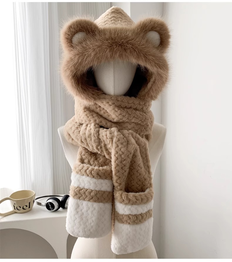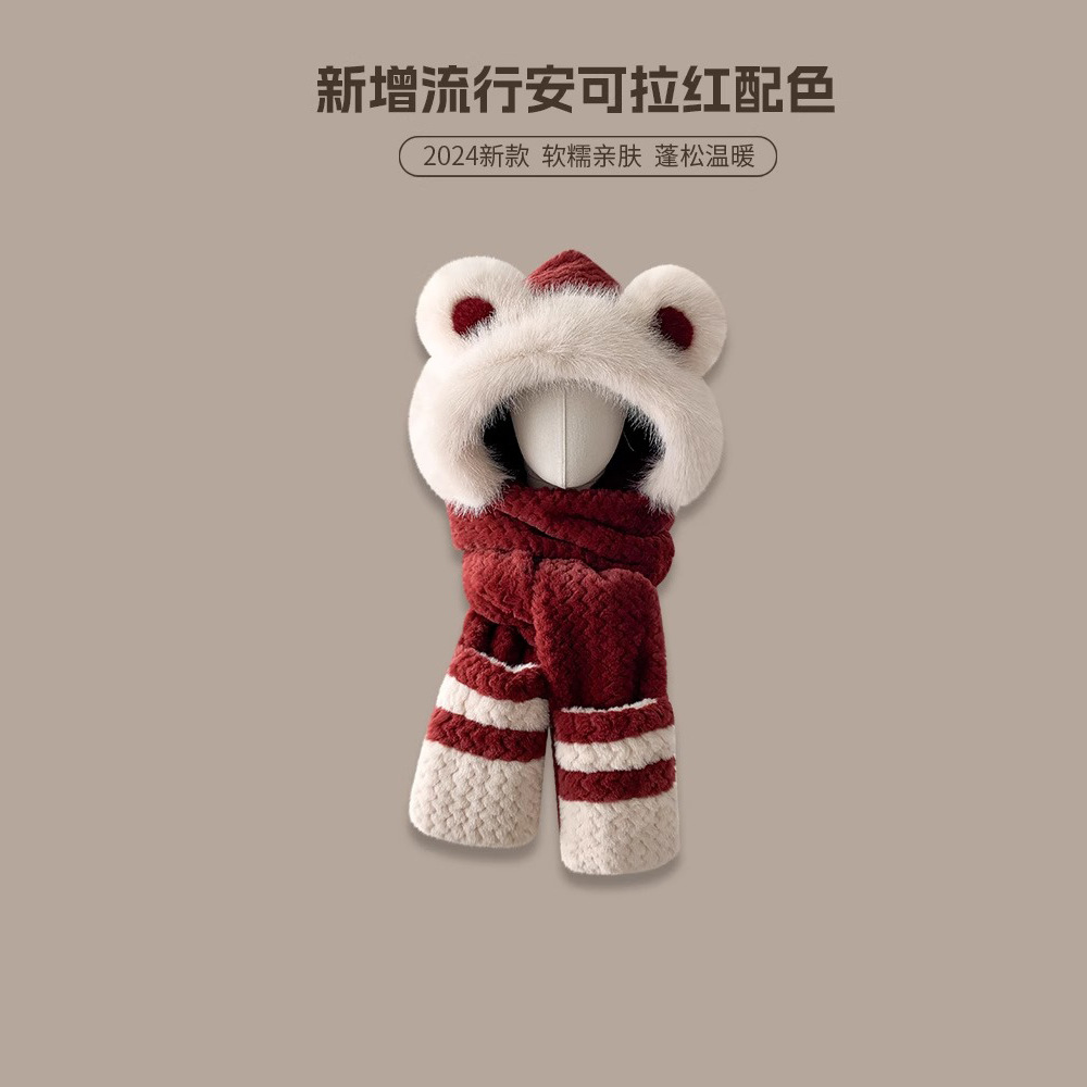 2025년 신형 방한 보온 곰돌이 플러시 모자 스카프 장갑 일체형 여성용 겨울 두꺼운 귀 보호 자전거 모자스토어 가기