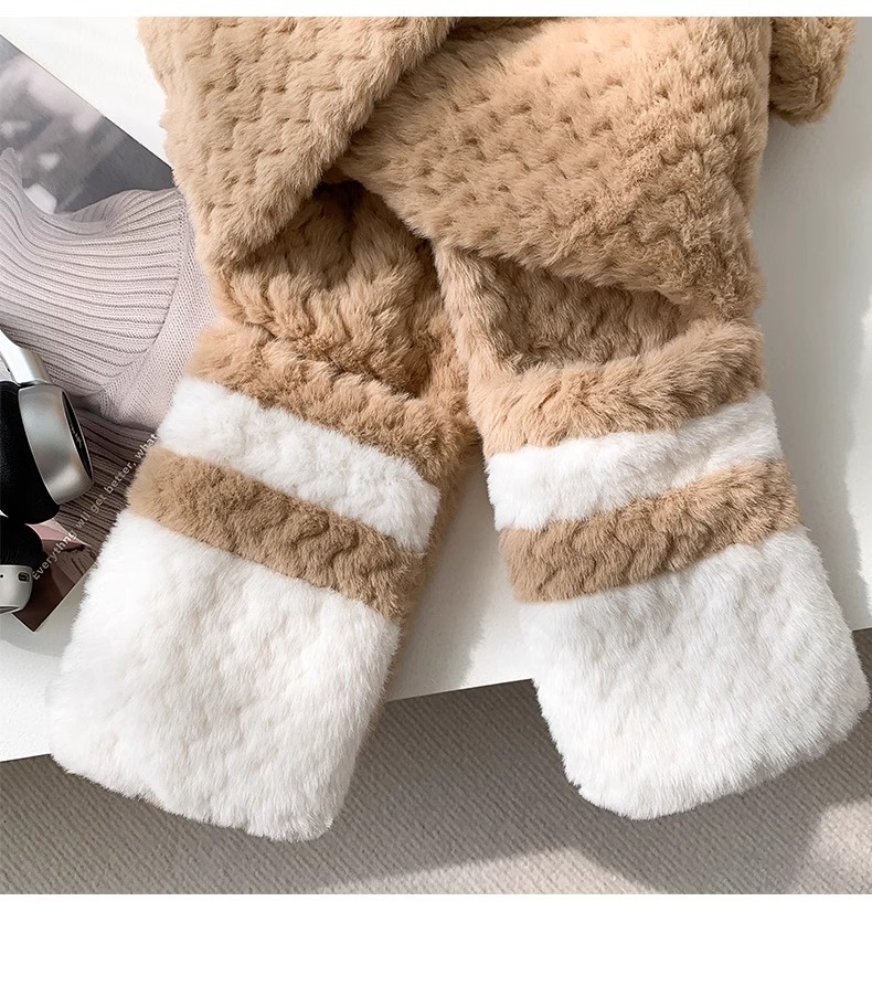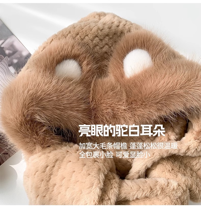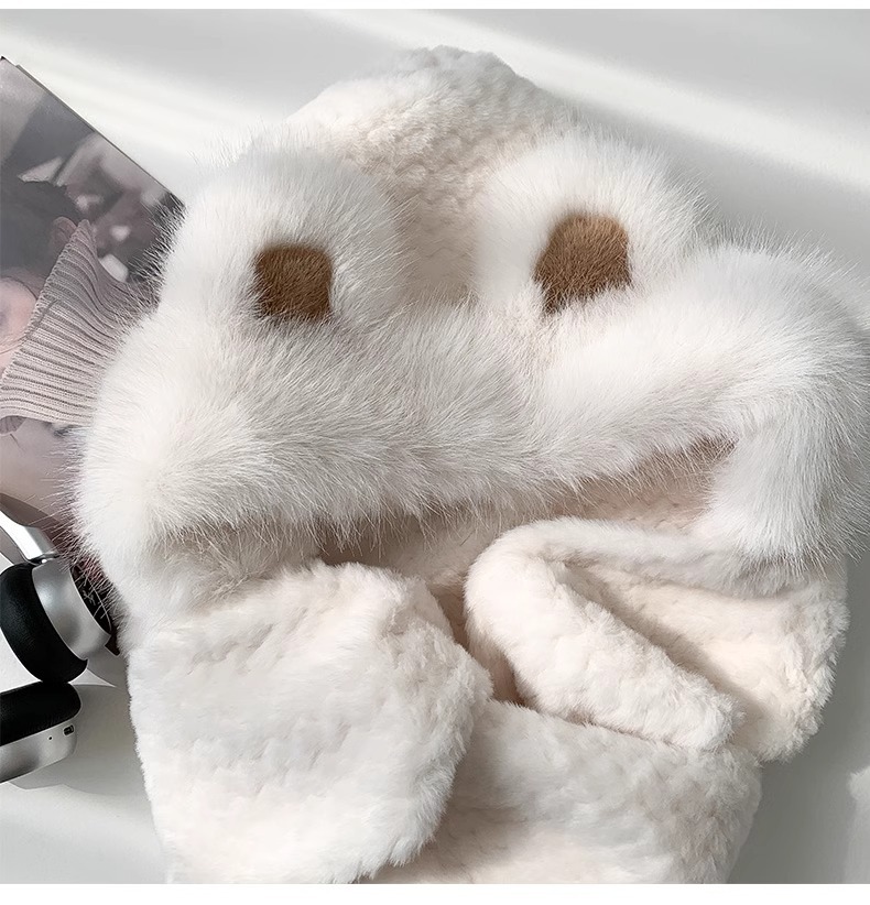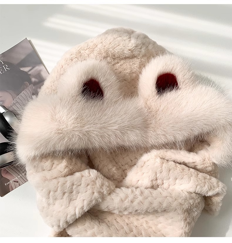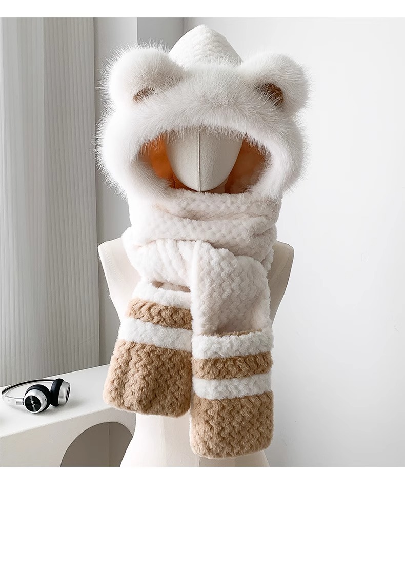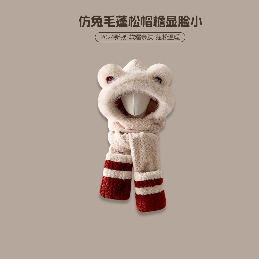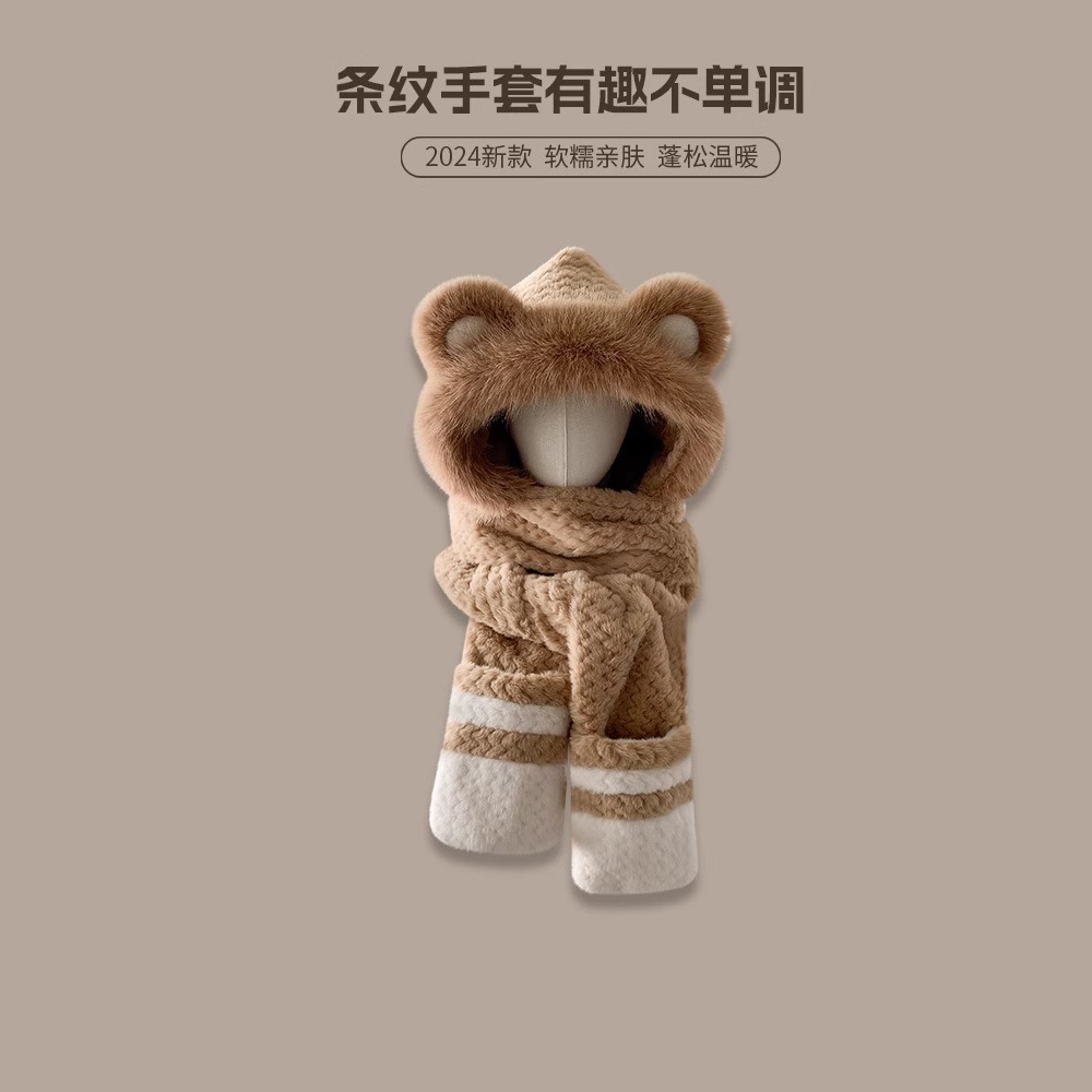 2025년 신형 방한 보온 곰돌이 플러시 모자 스카프 장갑 일체형 여성용 겨울 두꺼운 귀 보호 자전거 모자