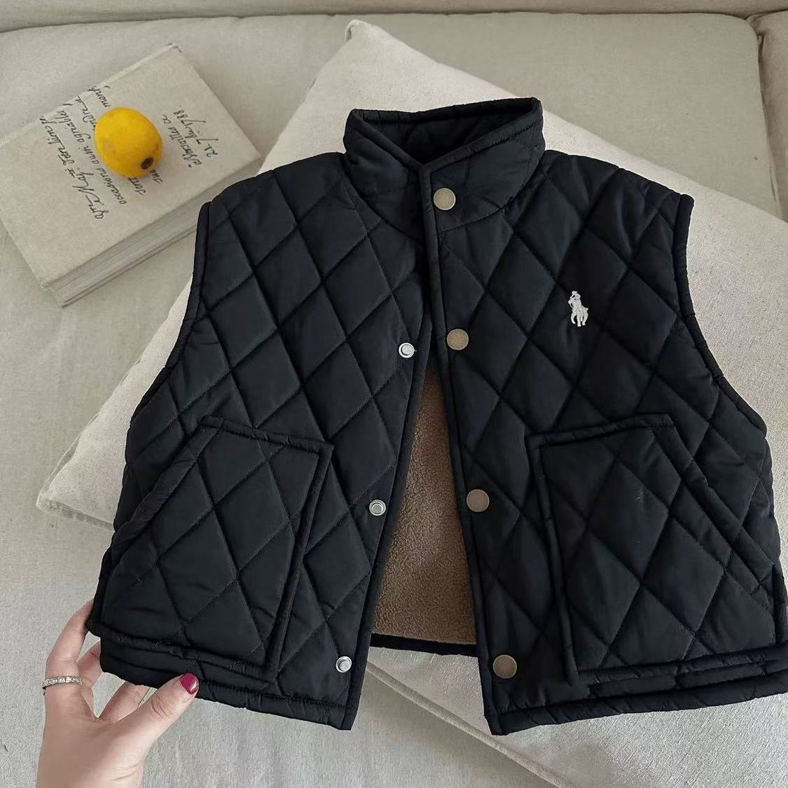 어린 이용 면화 조끼 2024 가을 및 겨울 아기의 단색 도자기 여성용 서양 스타일의 새 소년 격자 무늬 탑