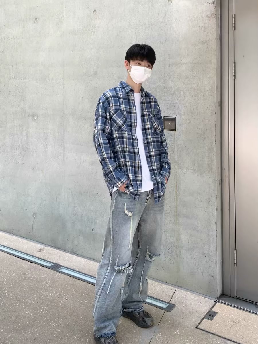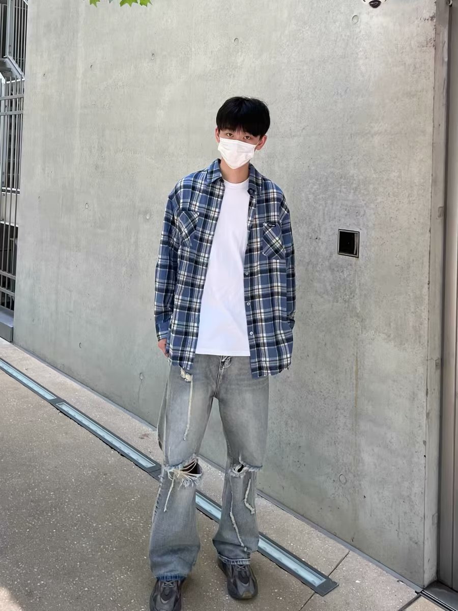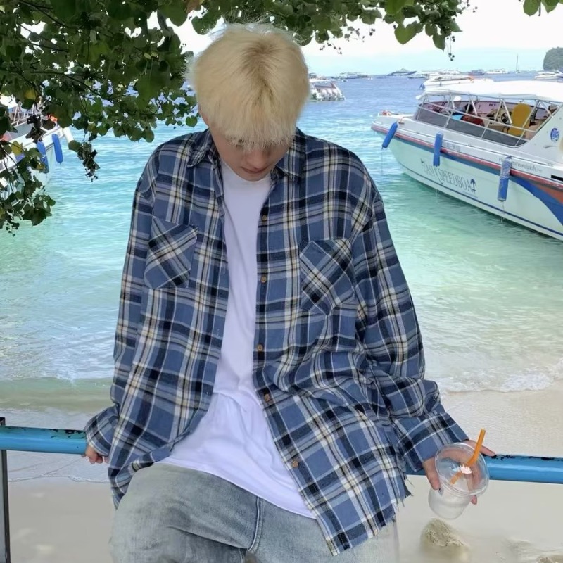 국경 간 블루 체크 셔츠 남자의 긴팔 가을 새로운 복고베이스 셔츠 트렌디 브랜드 하이 엔드 센스 재킷스토어 가기