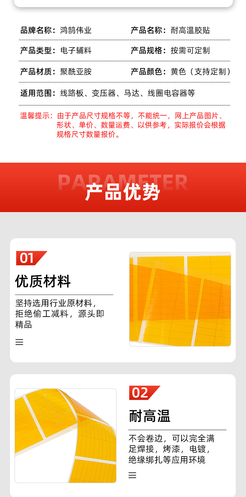 절연 비 잔류 접착 PET 고온 테이프 원활한 노란색 크기 사용자 정의를 부착하기 쉬운 고온 내성 접착제스토어 가기
