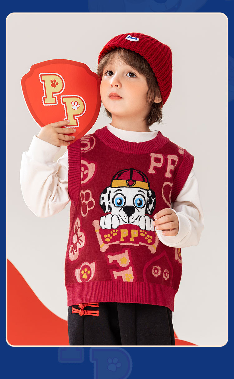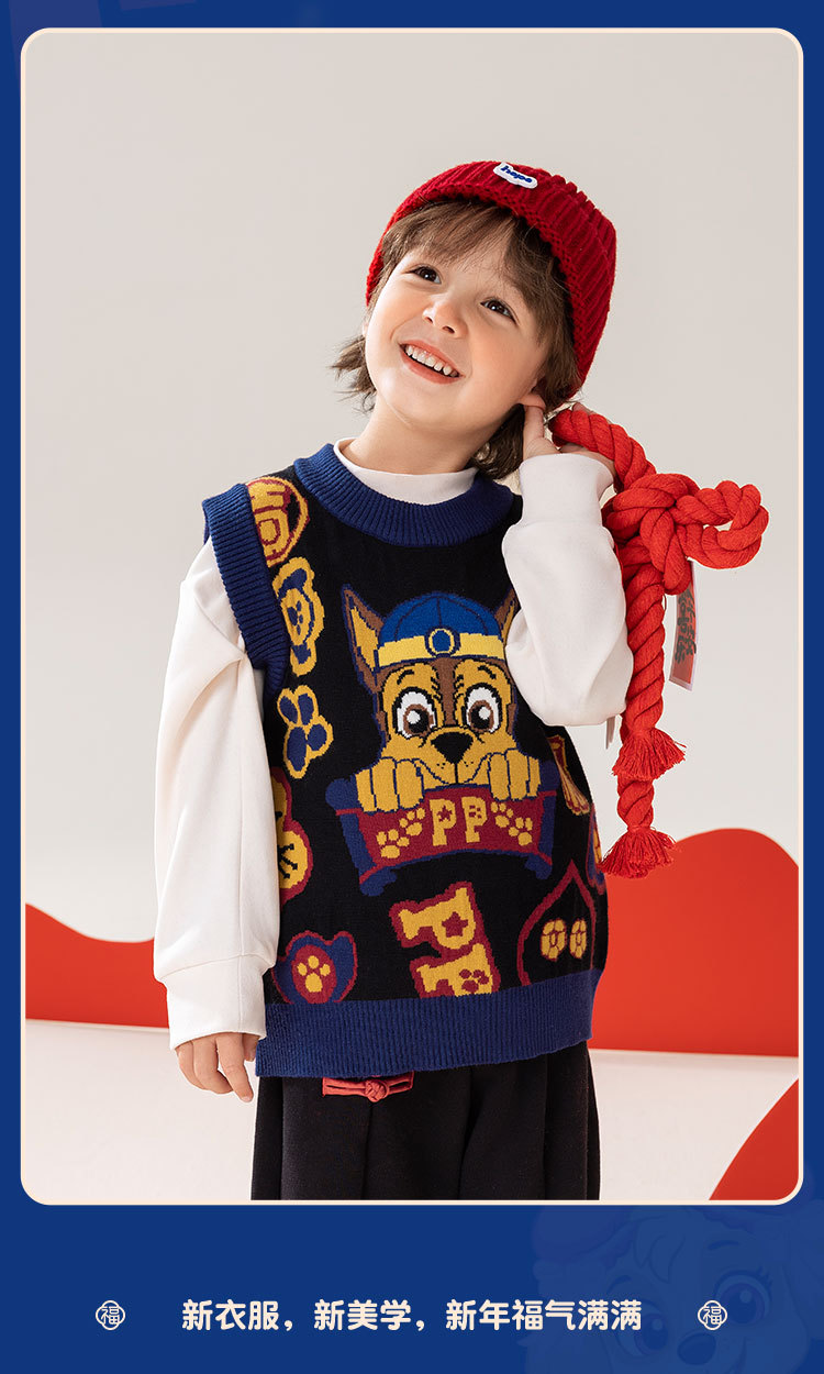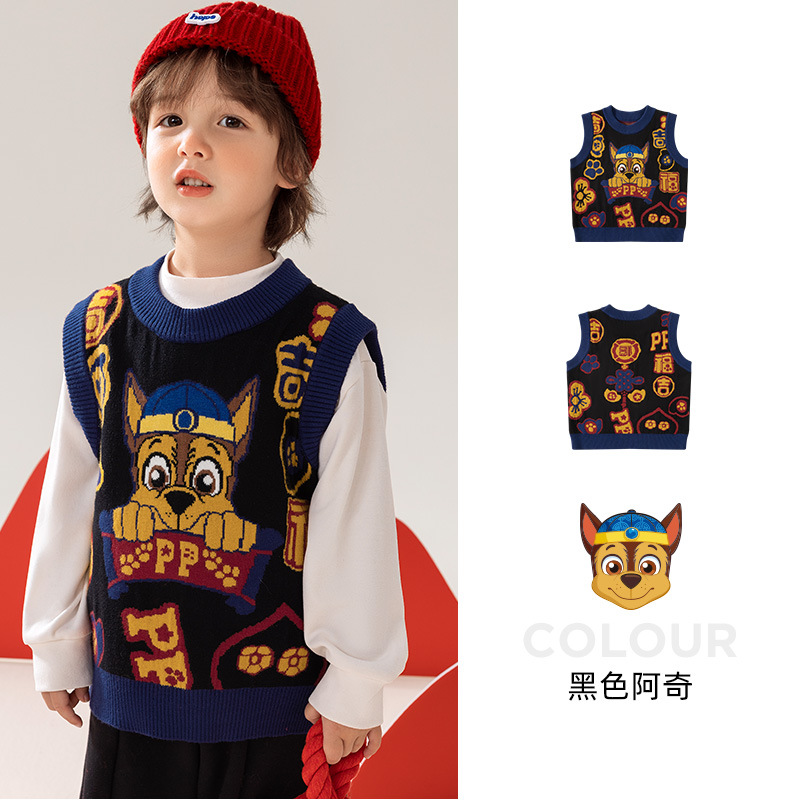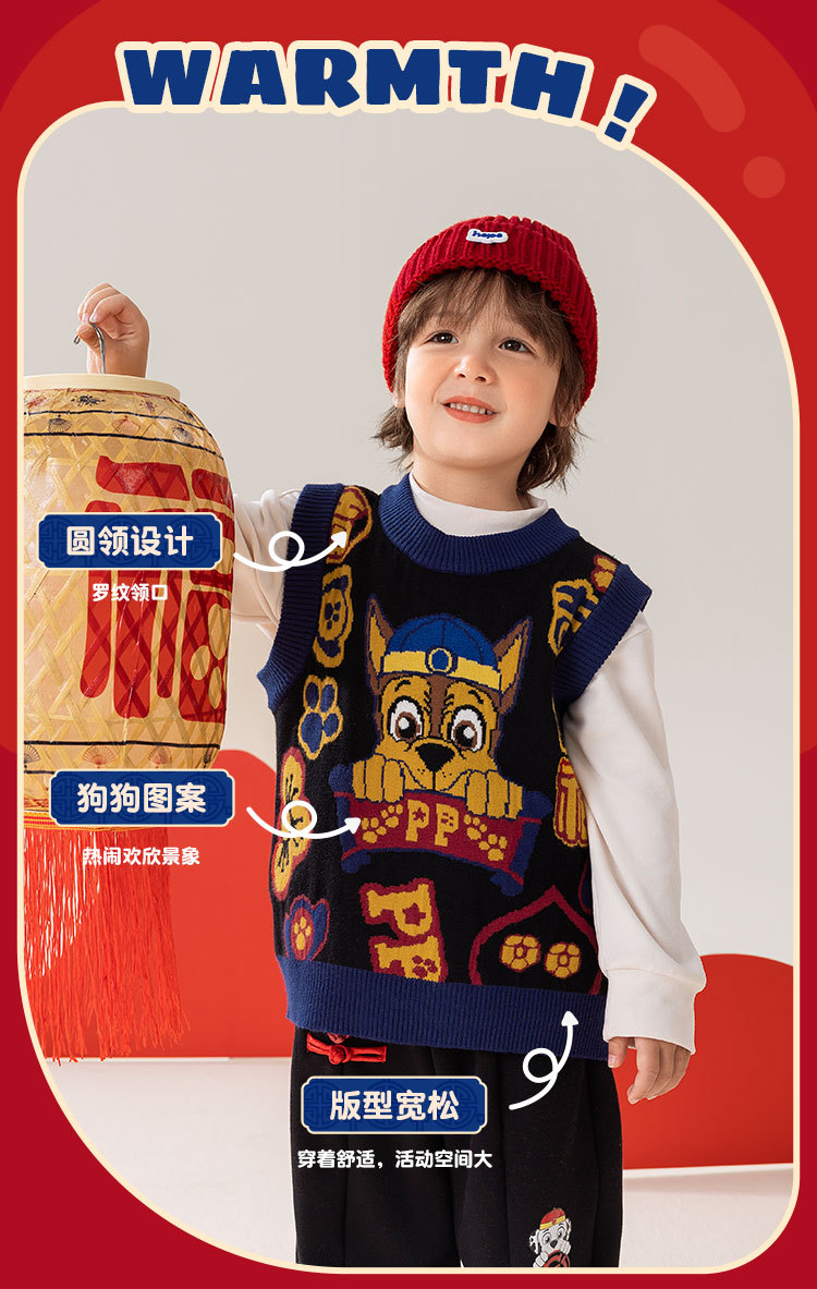 왕왕 팀 어린이 조끼 신년복 가을과 겨울 붉은 크루 넥 니트 소년 스웨터 조끼 겉옷 두꺼운 조끼