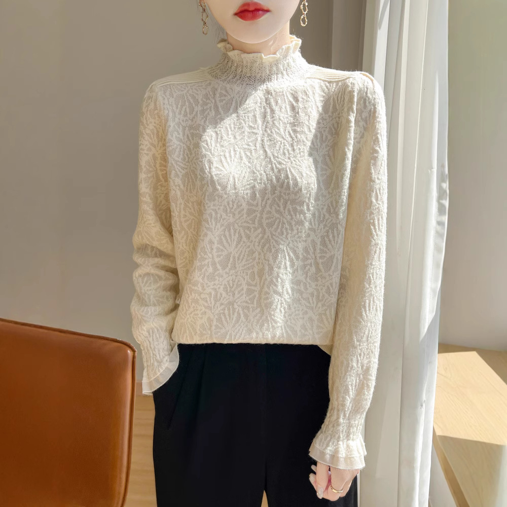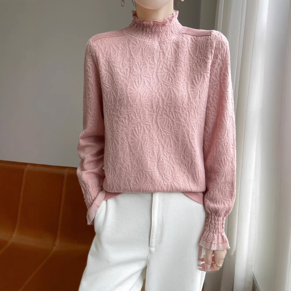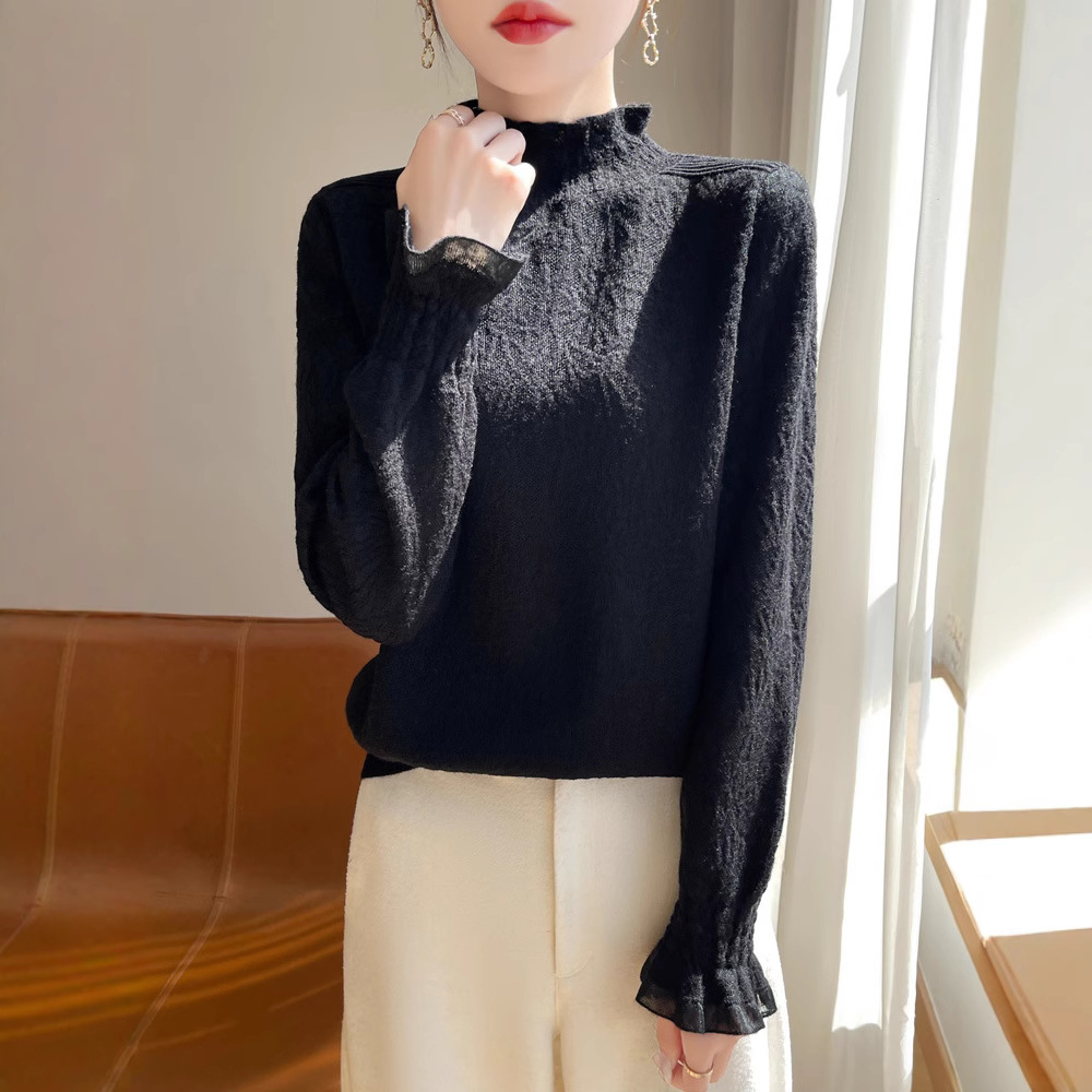 새로운 스타일의 러플 테일러드 하프 터틀넥 여성용 고급 울 니트 베이스 셔츠 루즈핏 긴팔 상의 캐주얼 심플 스웨터
